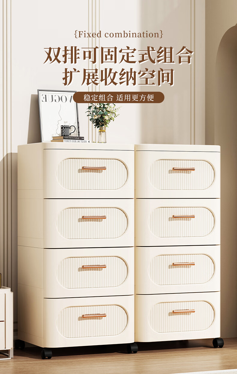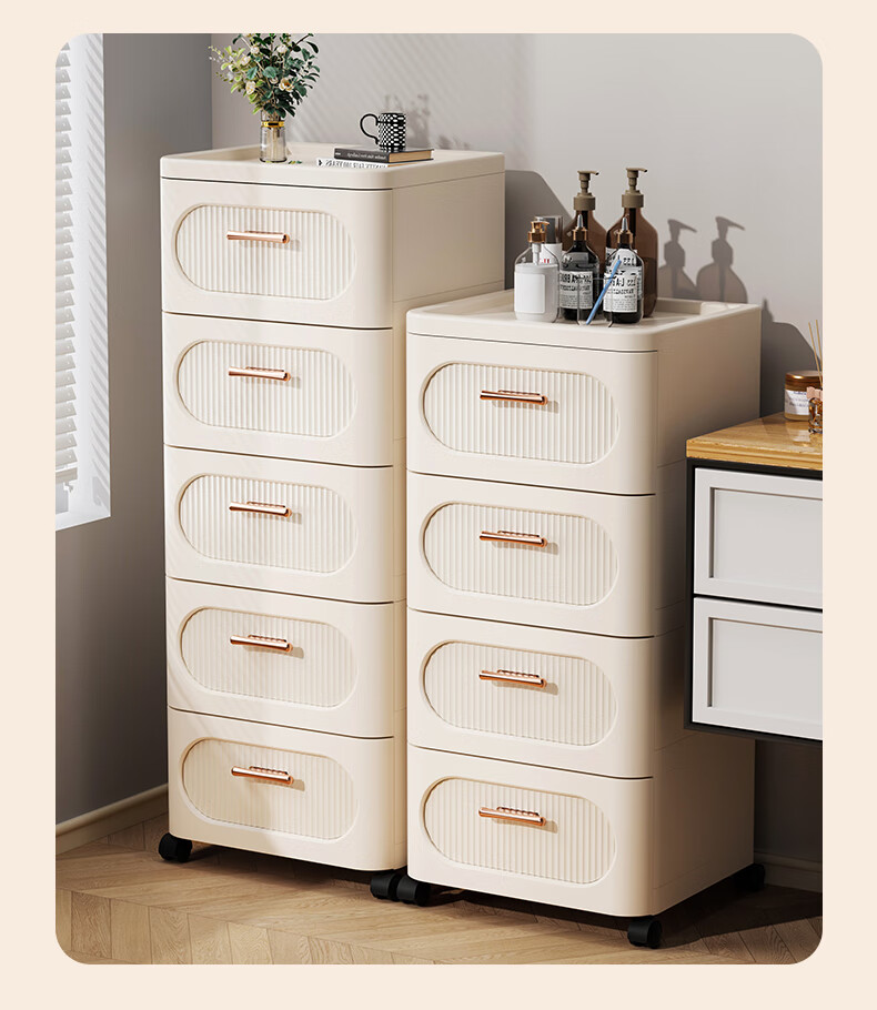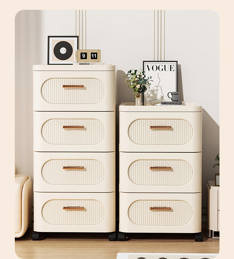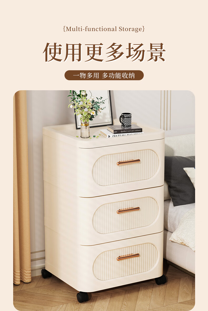 纳份爱加厚抽屉式收纳柜家用卧室床头柜客厅五斗柜夹缝储物柜置物柜 奶油风-3层 35CM面宽 送静音可锁轮