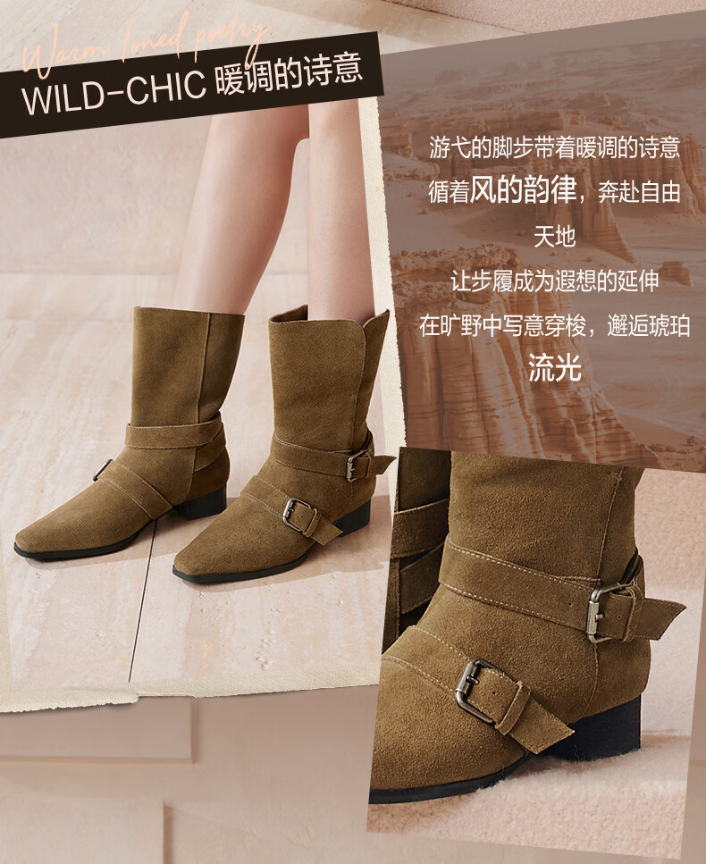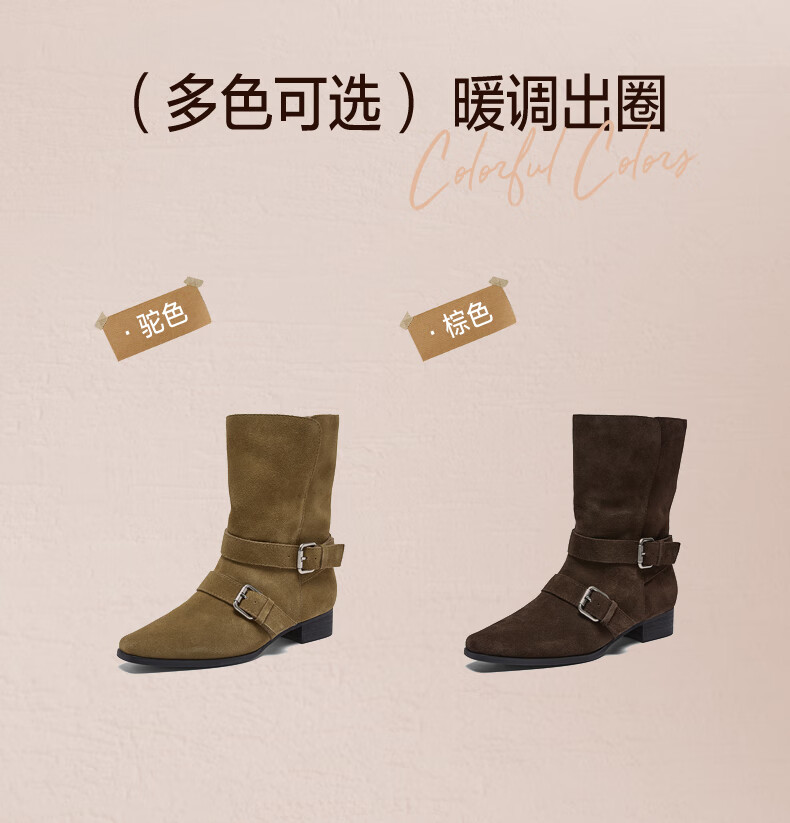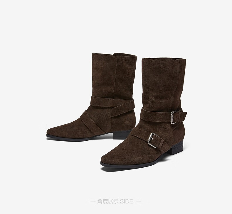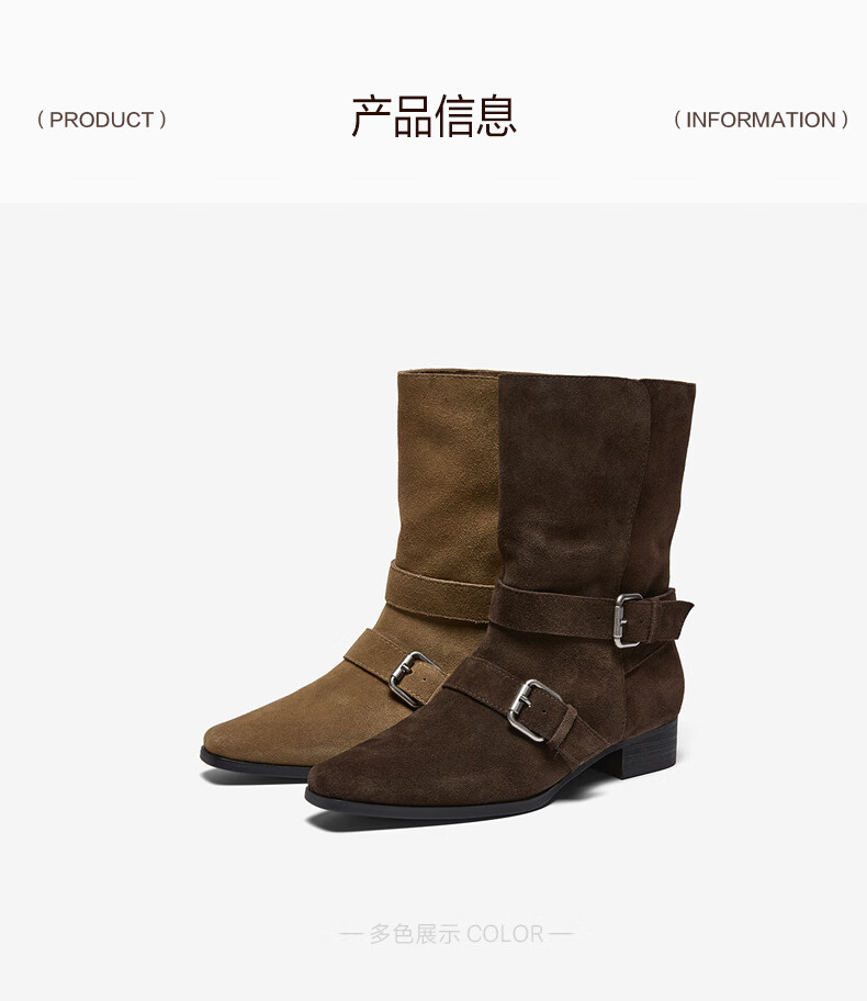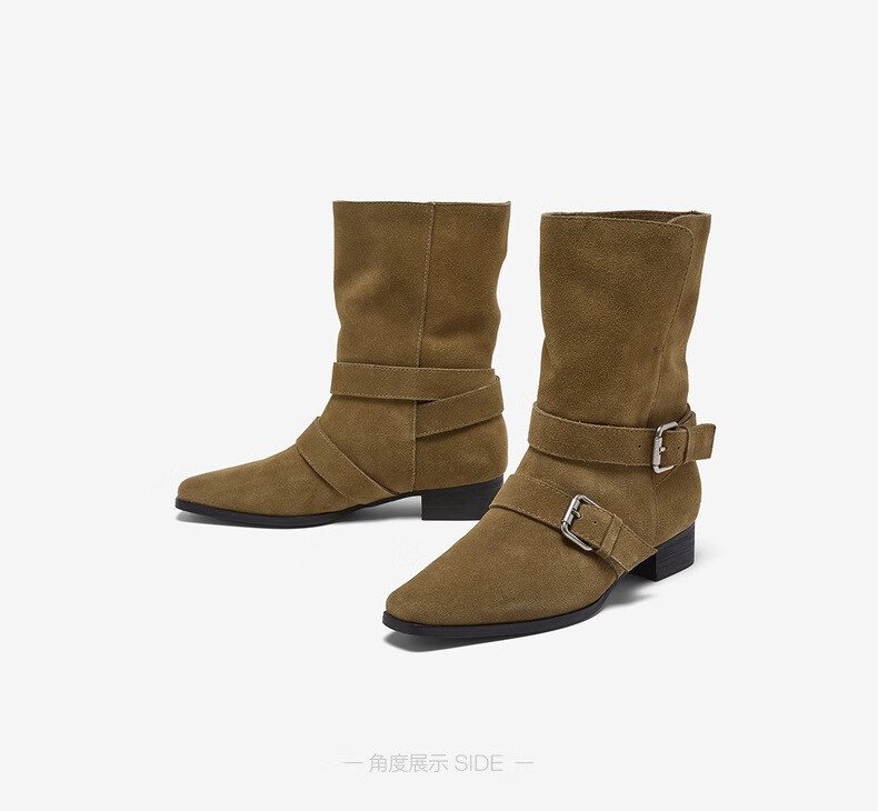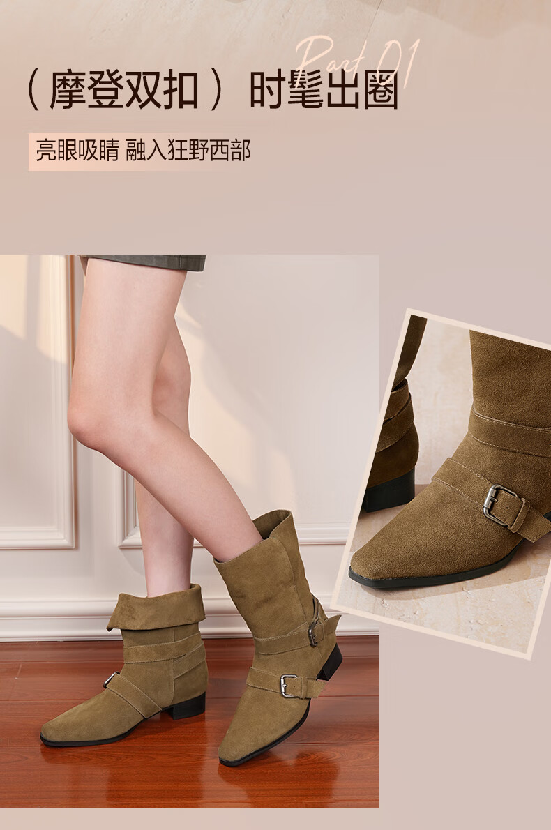 百思图2025冬季新款真皮西部靴时尚复古粗跟尖头女短靴K5053DZ5 驼色 37