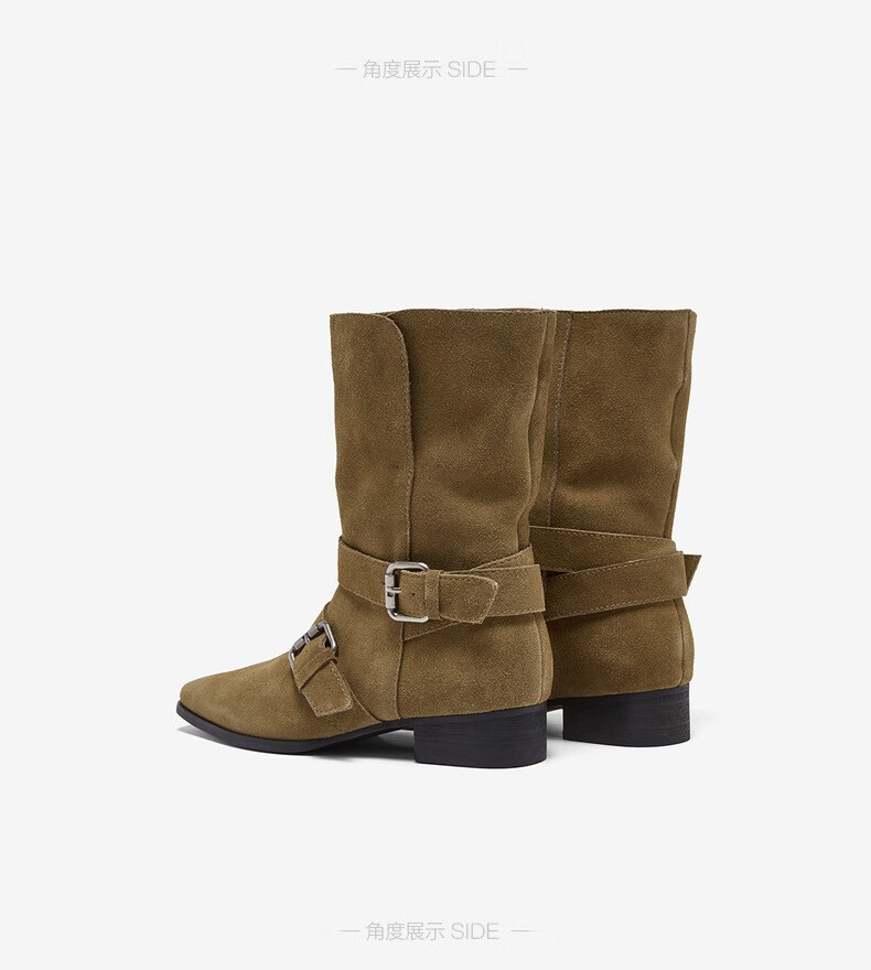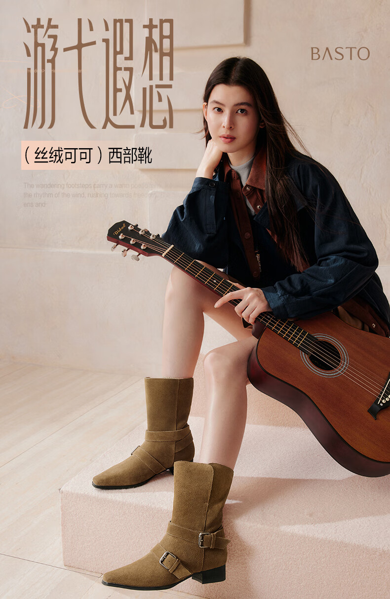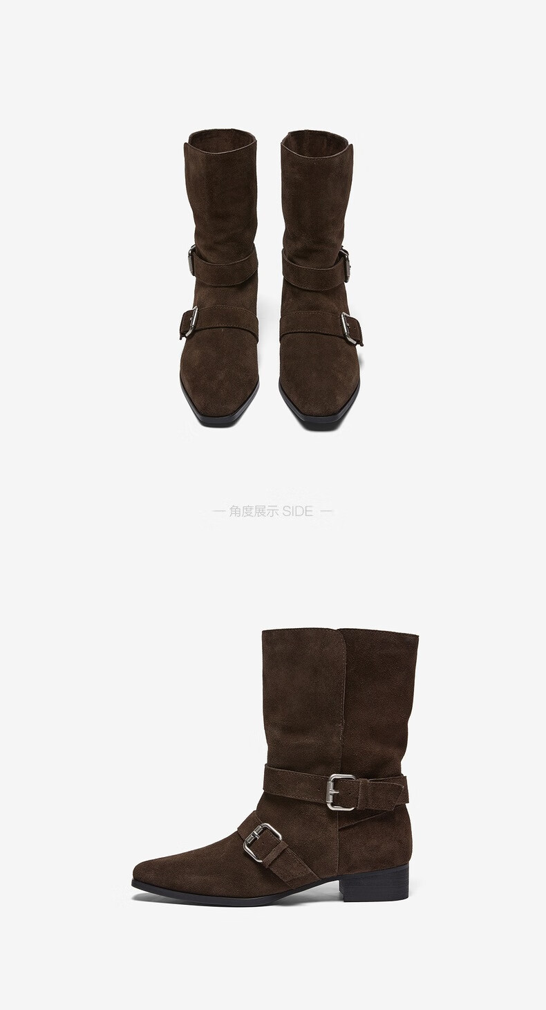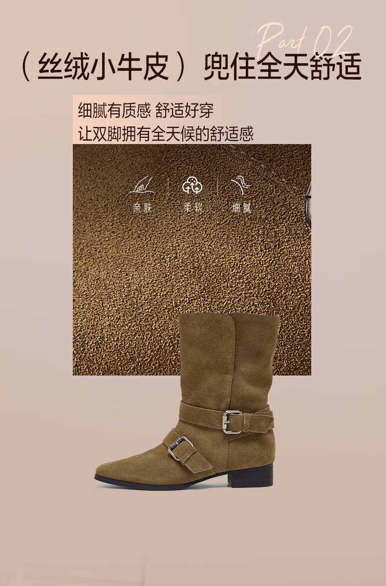 百思图2025冬季新款真皮西部靴时尚复古粗跟尖头女短靴K5053DZ5 驼色 37