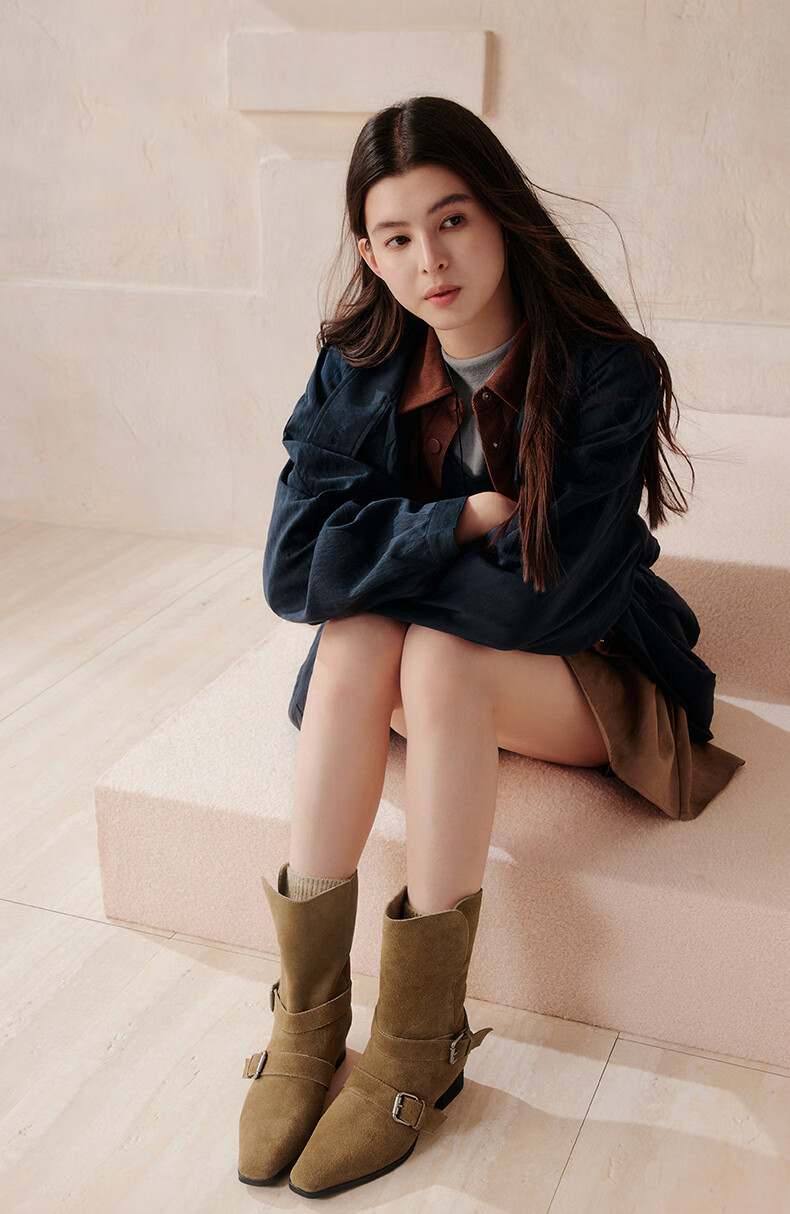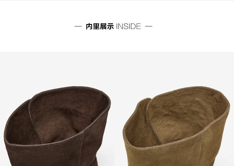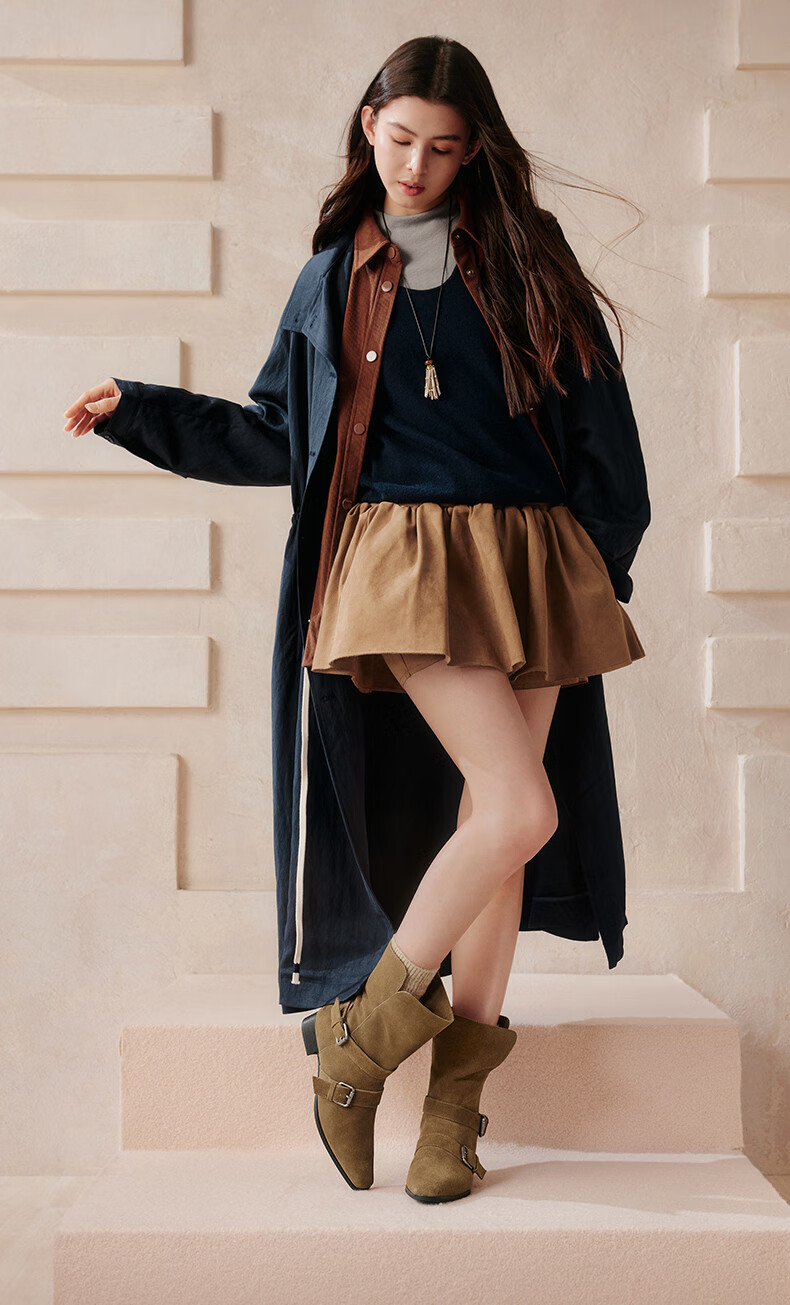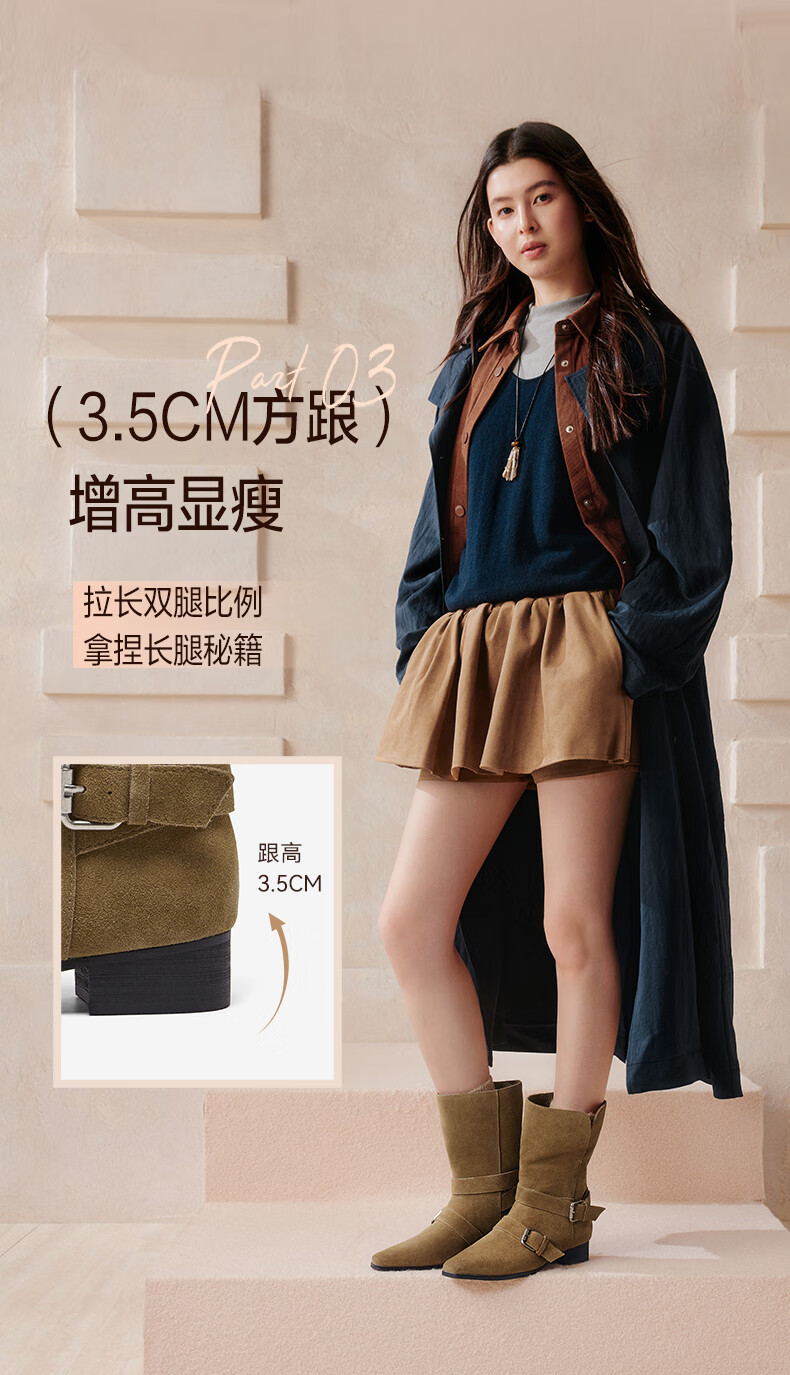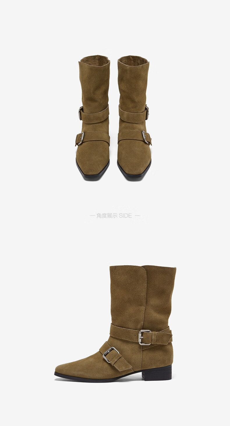 百思图2025冬季新款真皮西部靴时尚复古粗跟尖头女短靴K5053DZ5 驼色 37