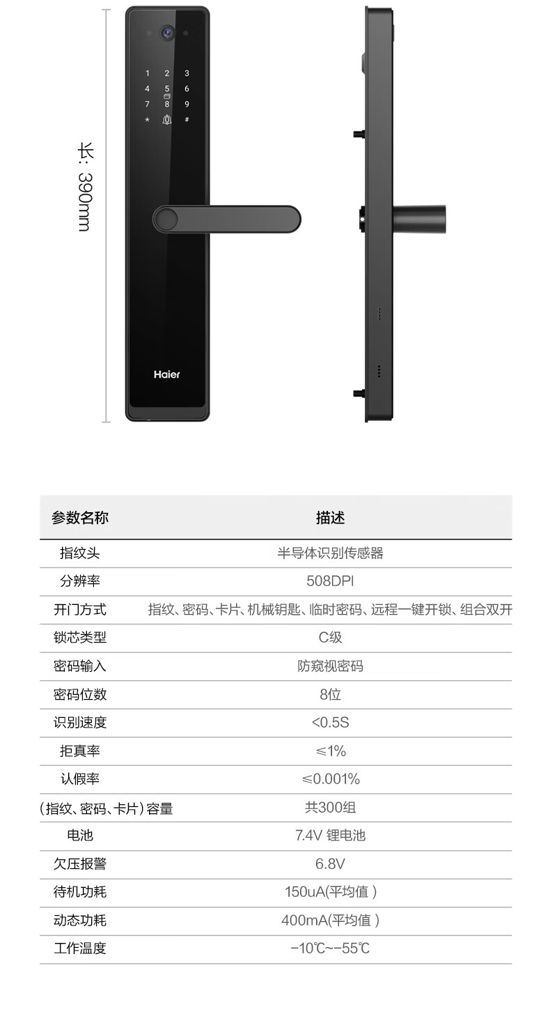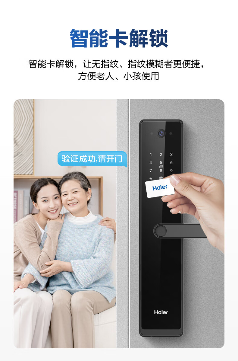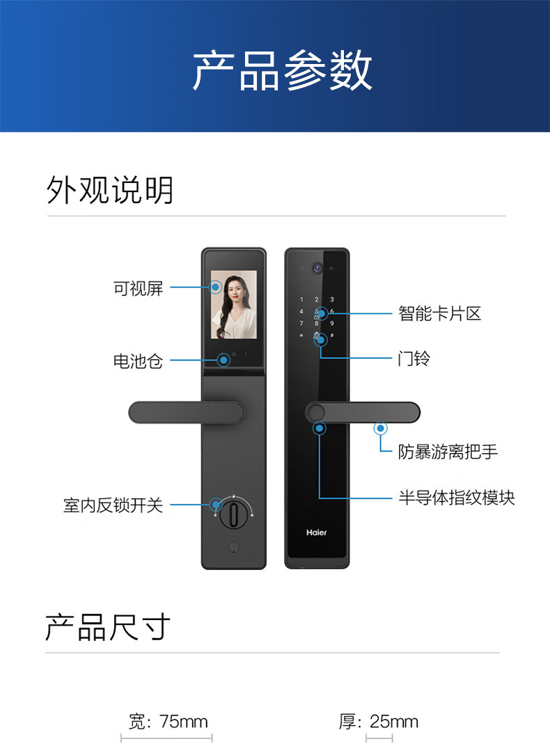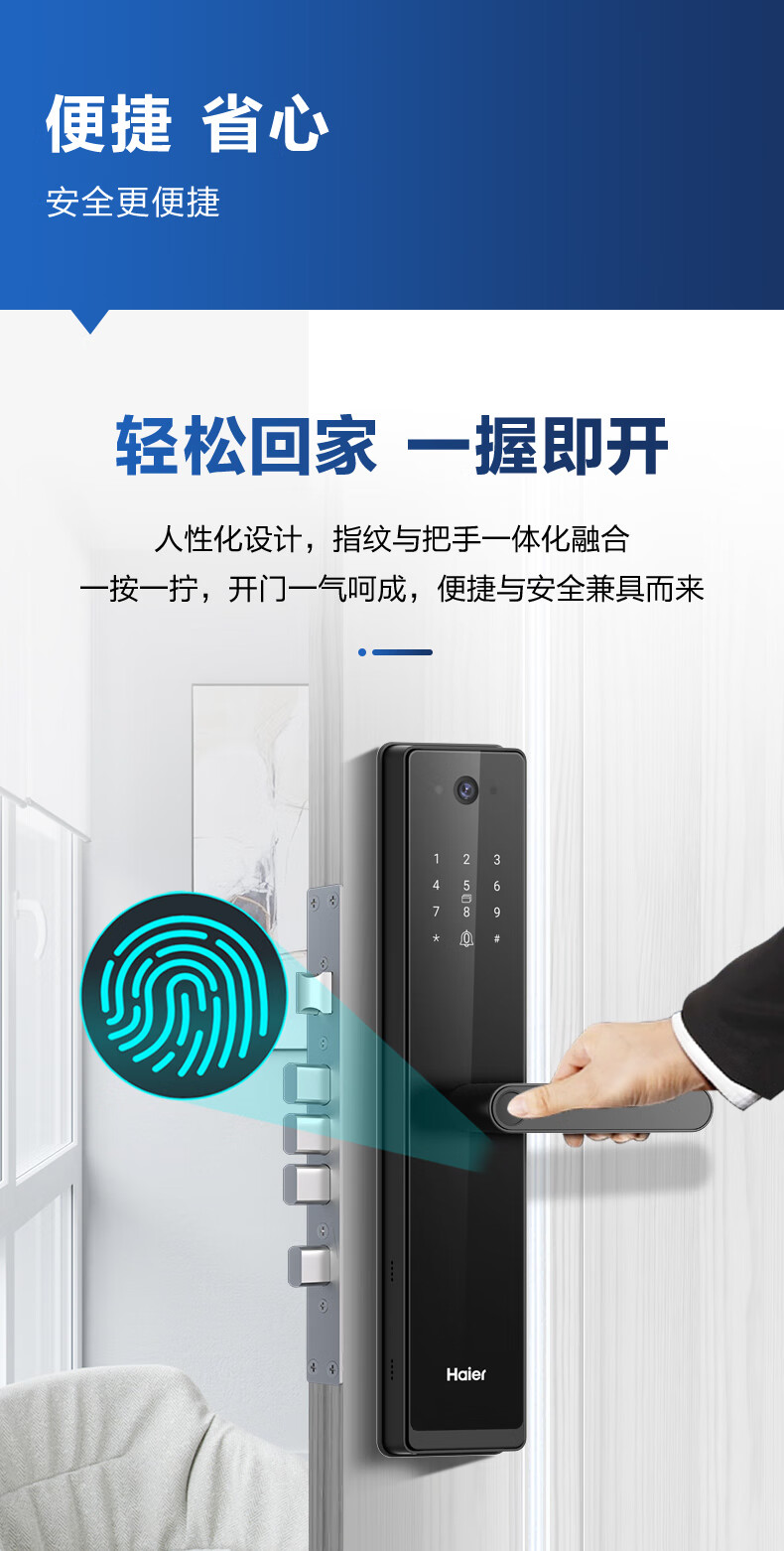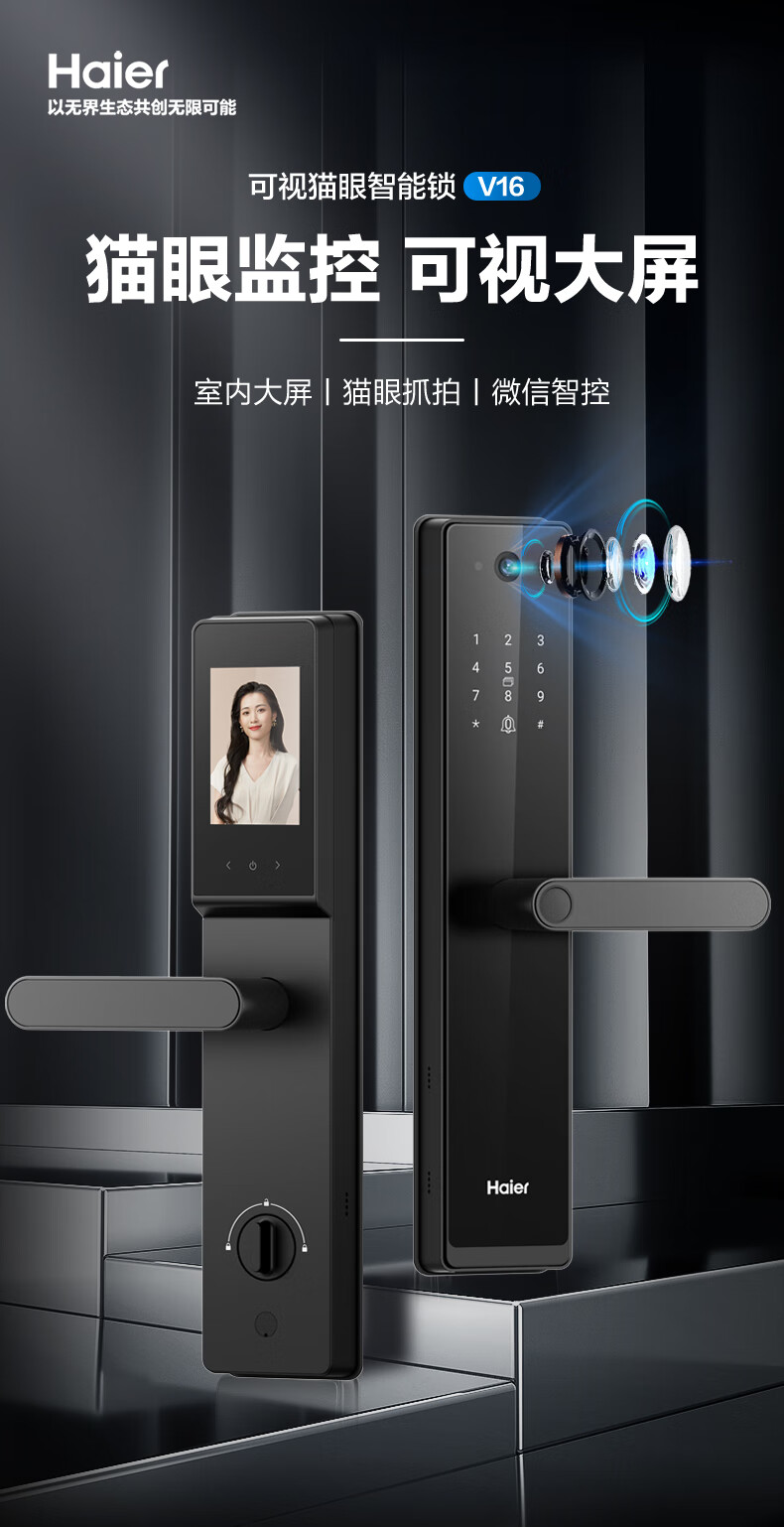 海尔(Haier)指纹锁智能门锁密码锁可视猫眼智能锁带监控摄像头HFH-16V-U1