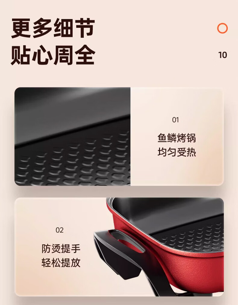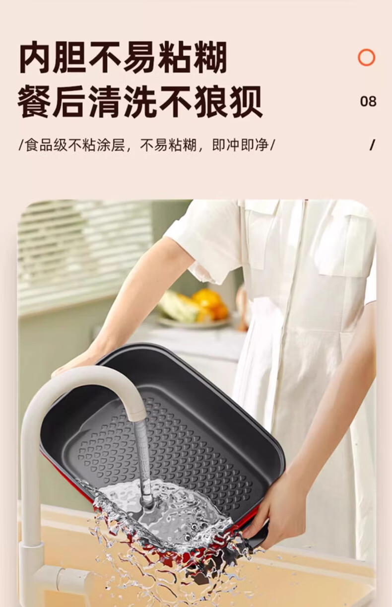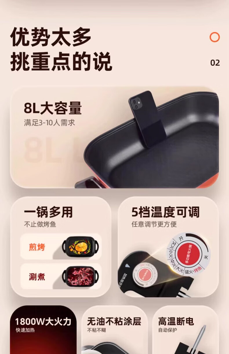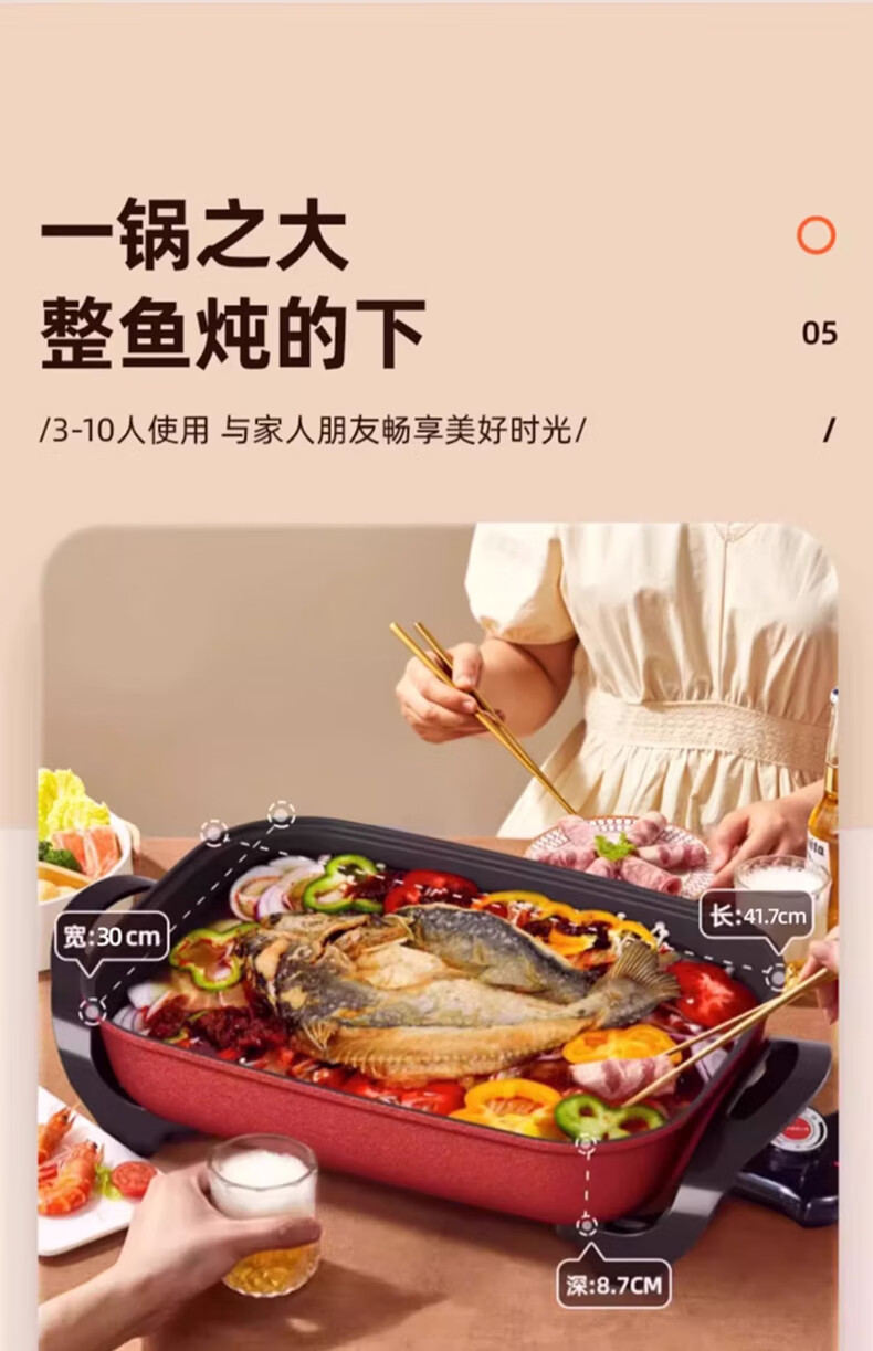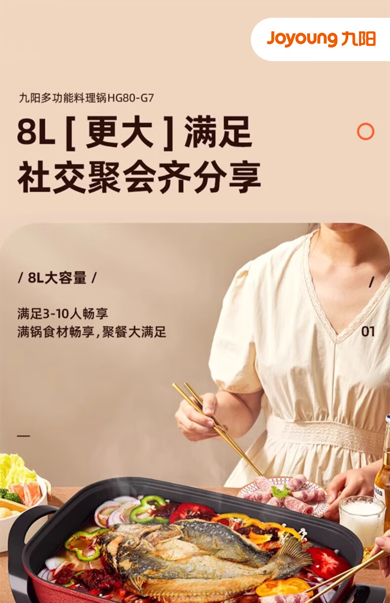 九阳(Joyoung) 电火锅烤涮一体两用锅烤肉锅电烤盘大功率烤鱼炉家用多功能电蒸锅炖蒸煮电炒锅一体不粘锅 8L 1800W-5档火力可调