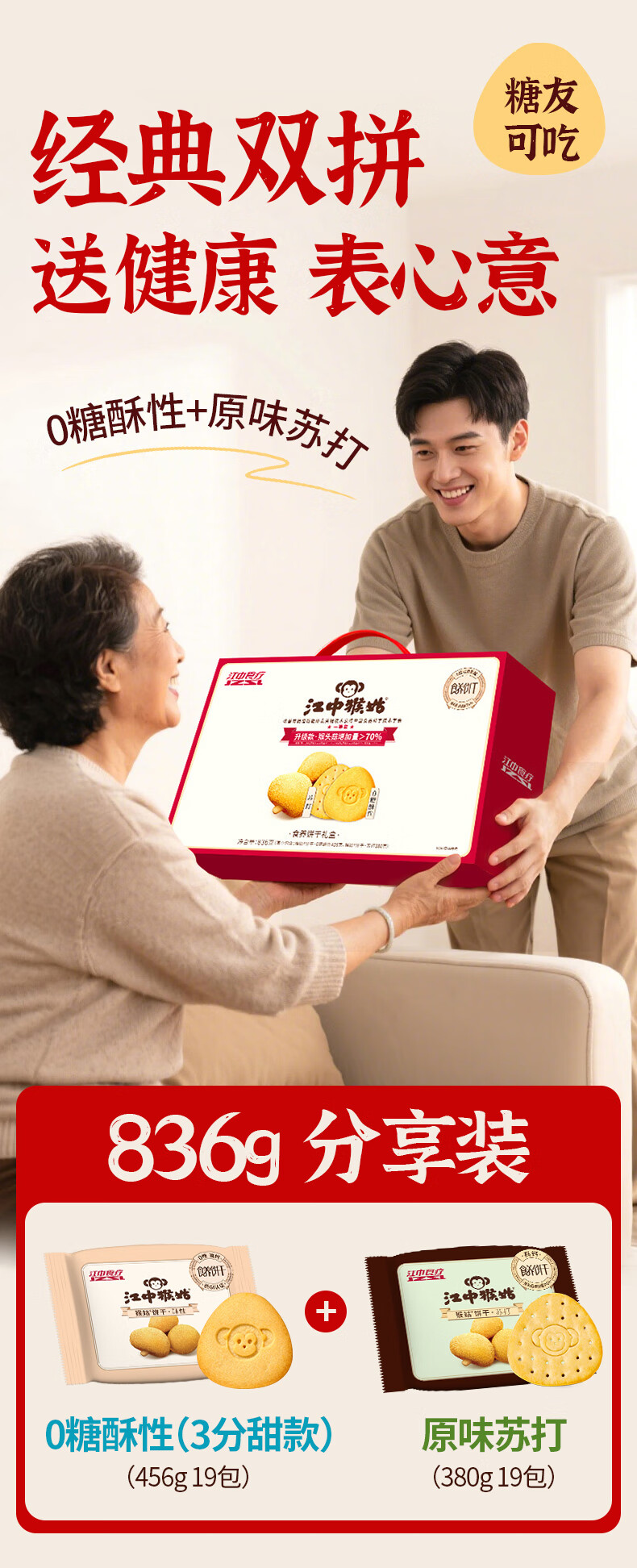 江中猴姑养胃猴头菇双拼礼盒0糖+苏打饼干中老年人早餐送礼零食团购836g