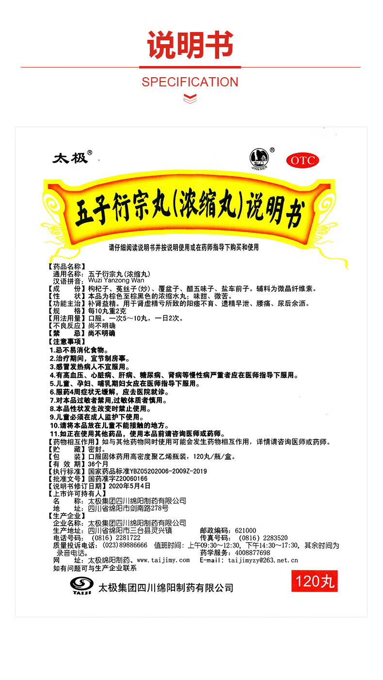 太极五子衍宗丸(浓缩丸)120丸补肾益精壮阳肾虚精亏阳痿不育遗精早泄腰痛尿后余沥正品男科用药非处方药自营