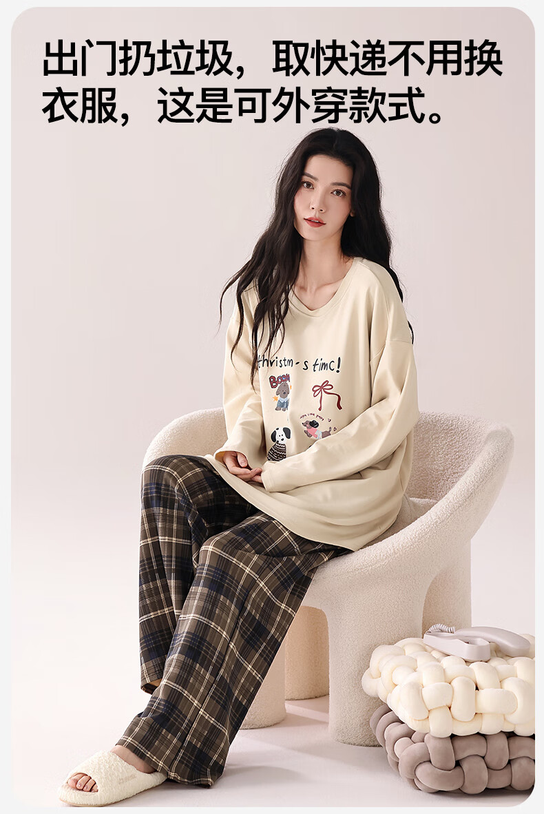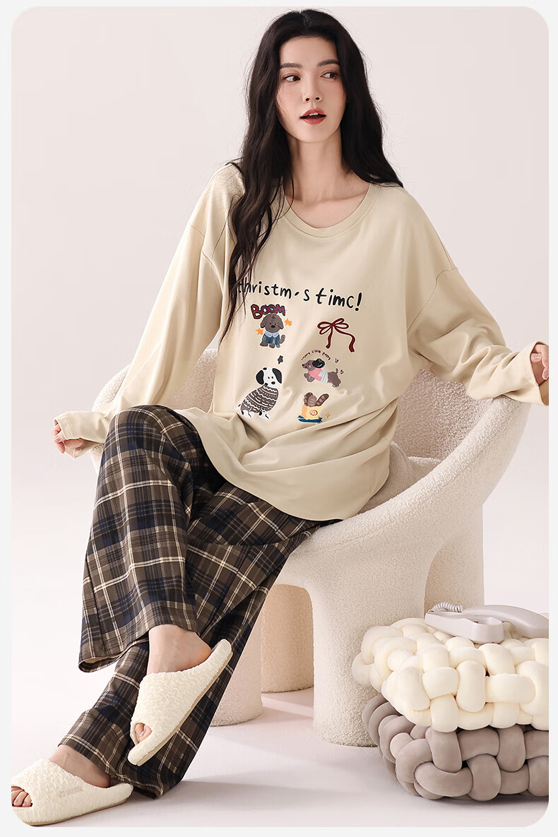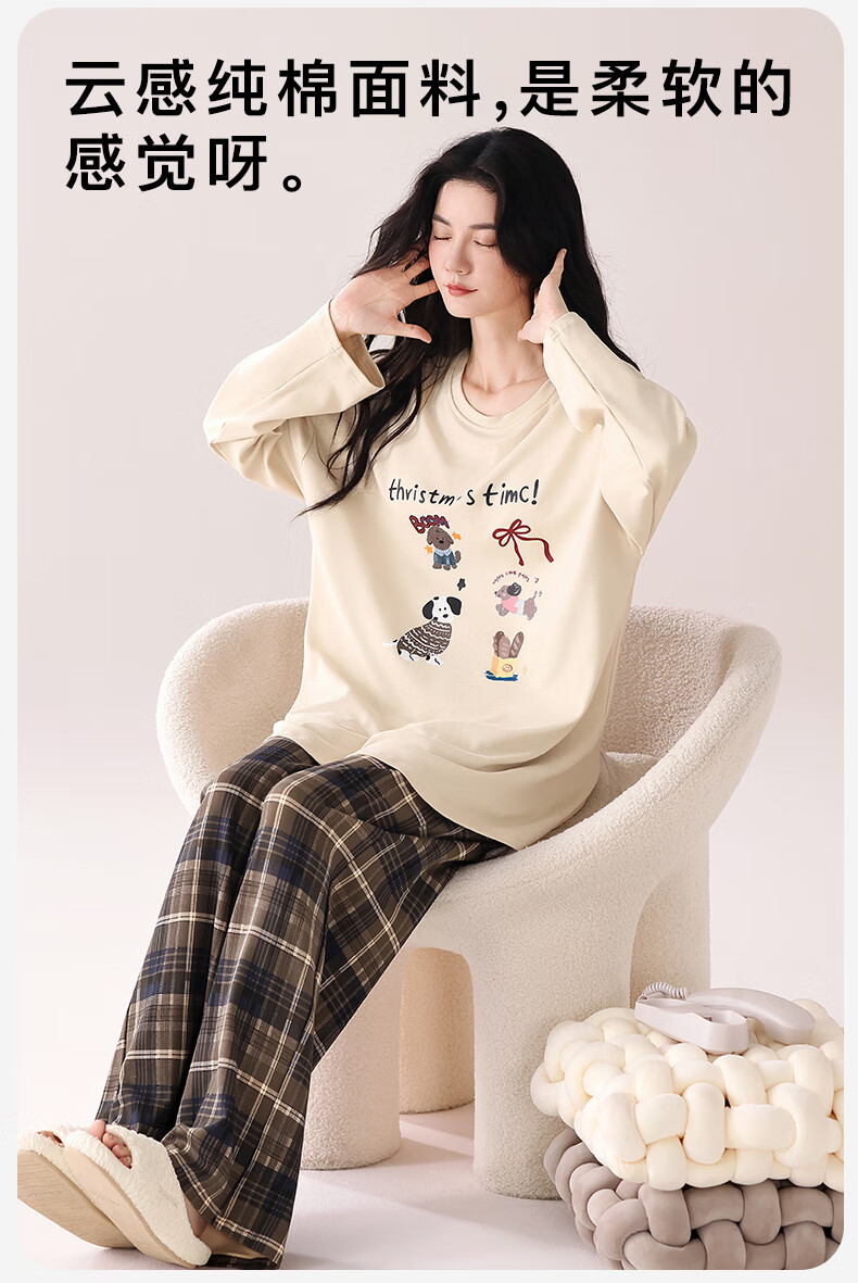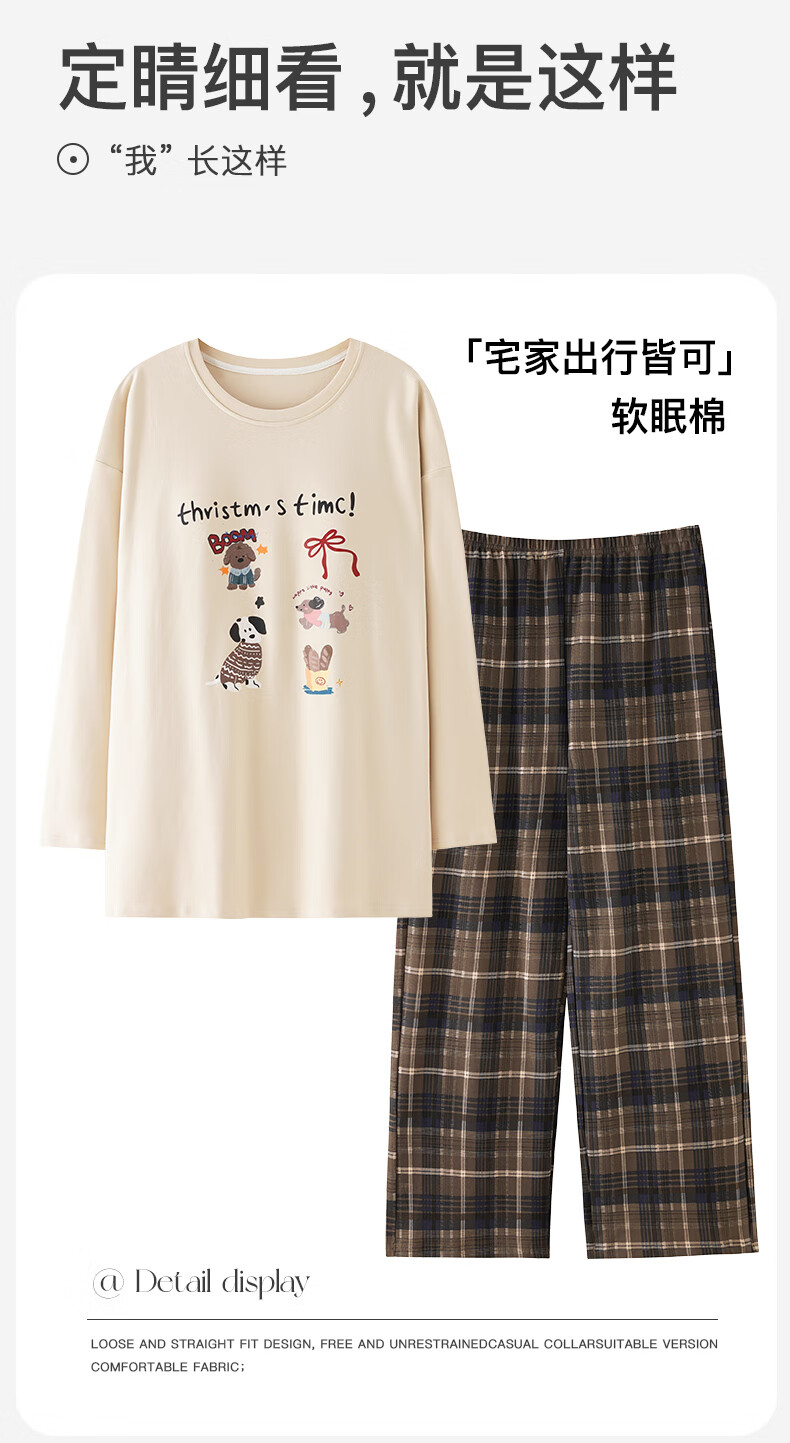 猫人(MiiOW)睡衣女士秋冬季2025新款带胸垫可外穿纯棉长袖卡通印花家居服套装 浅咖小狗 【100%纯棉 自带胸垫】 L 【约158-165cm/100-120斤】