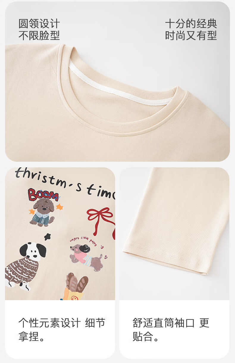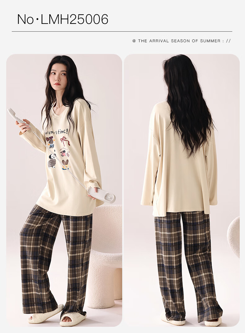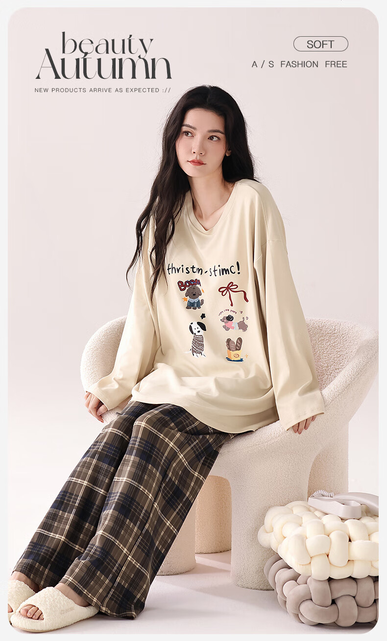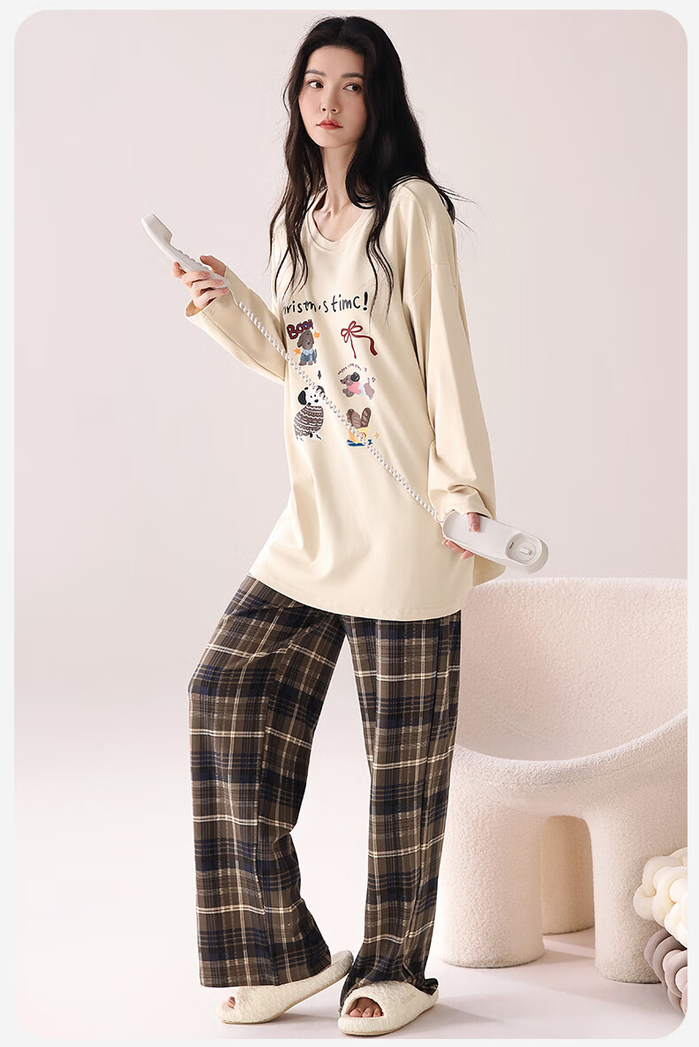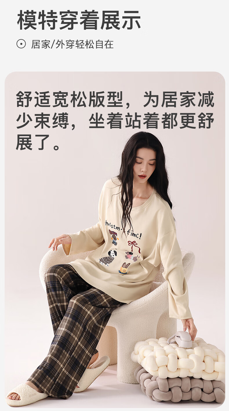 猫人(MiiOW)睡衣女士秋冬季2025新款带胸垫可外穿纯棉长袖卡通印花家居服套装 浅咖小狗 【100%纯棉 自带胸垫】 L 【约158-165cm/100-120斤】
