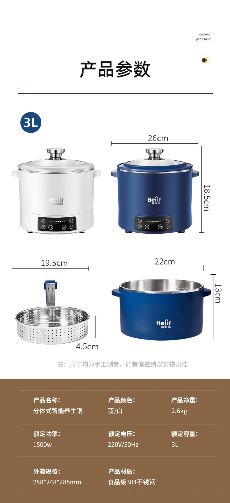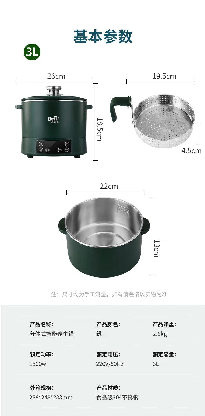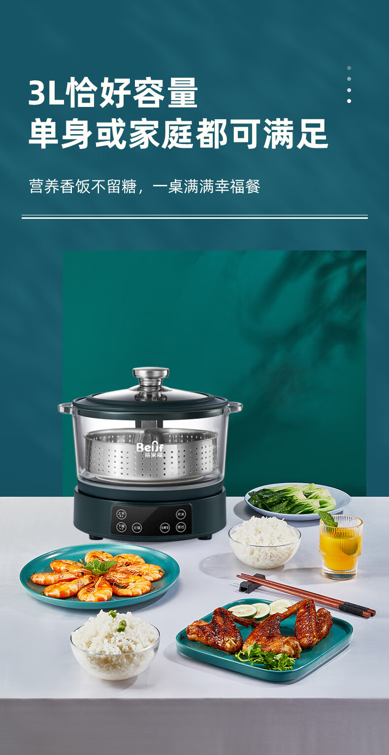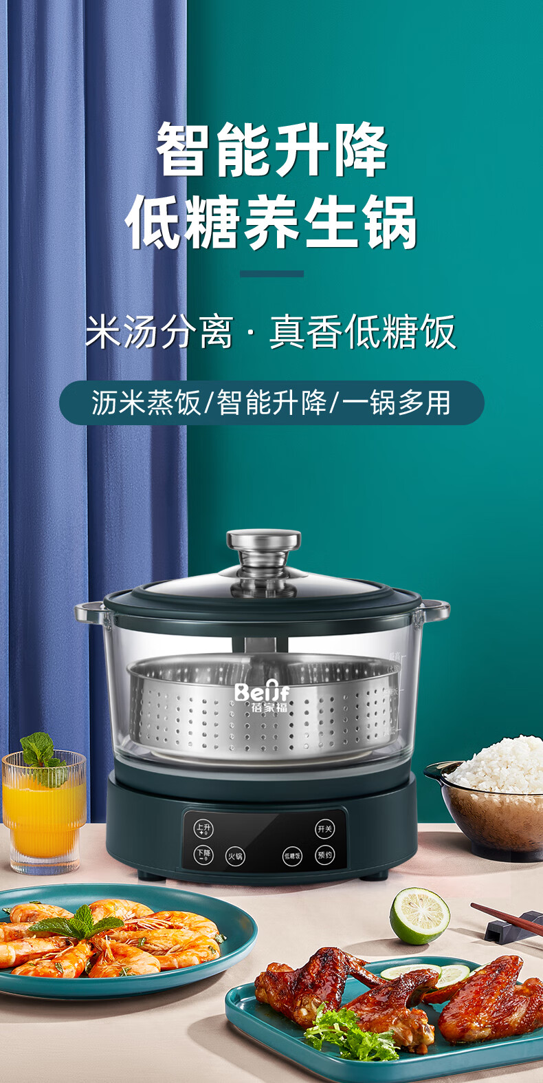 蓓家福新款低糖自动升降电饭煲家用米汤分离电饭锅智能沥米过滤糖分蒸煮多功能0涂层玻璃内胆养生锅米饭 3升玻璃款白色(适合1-3人可煮1斤米) 3L