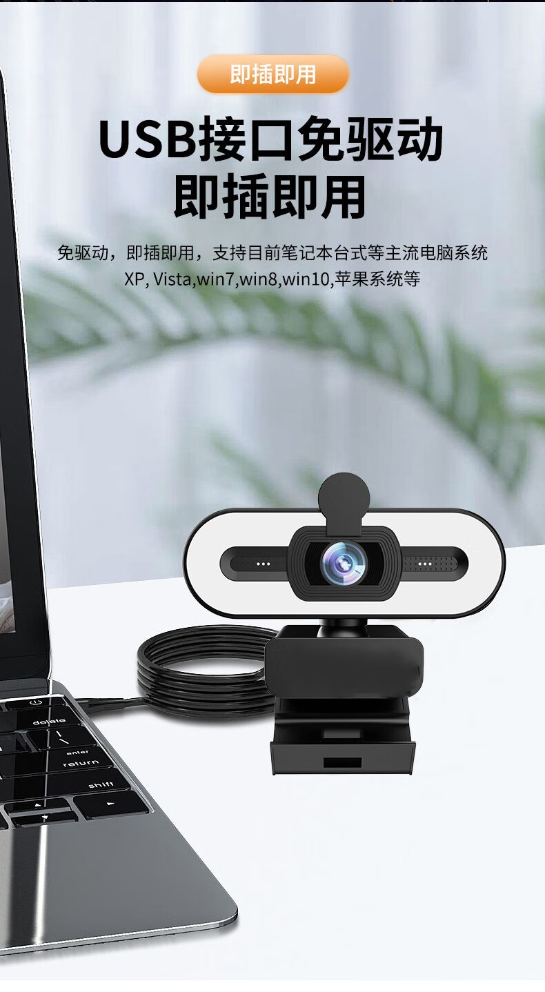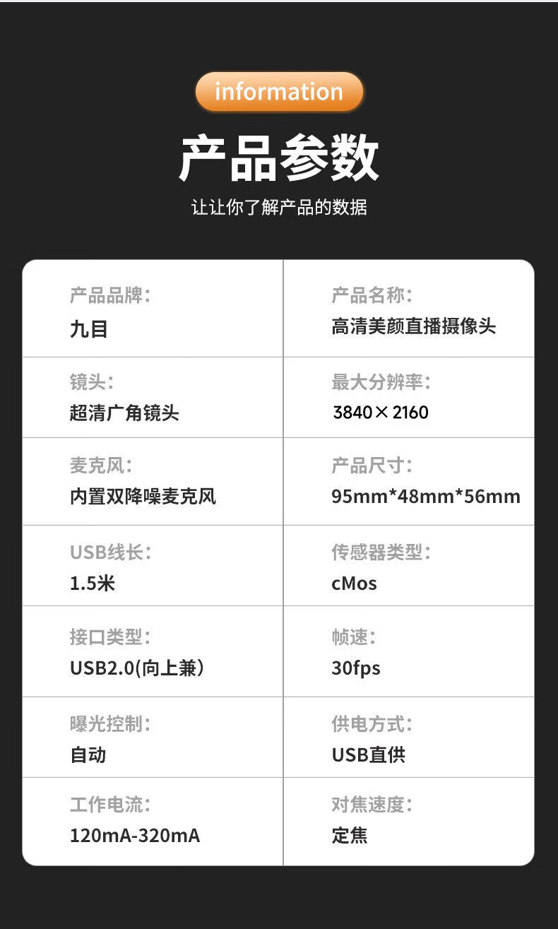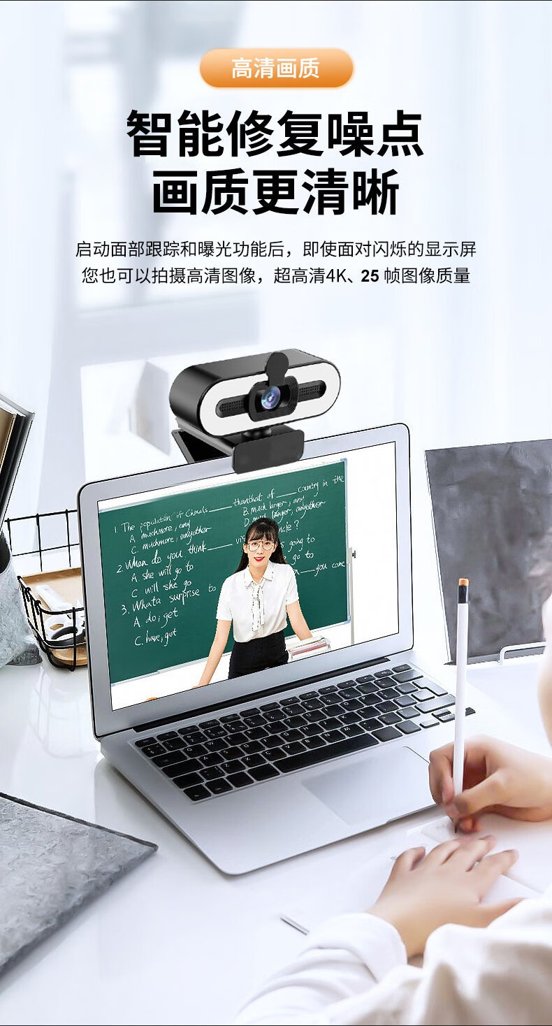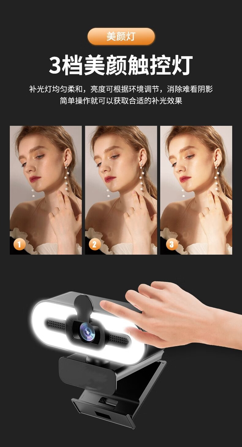 九目4K超清美颜USB网络直播会议麦克风笔记本台式电脑网课摄像头 4K 超清+三档调光+内置麦