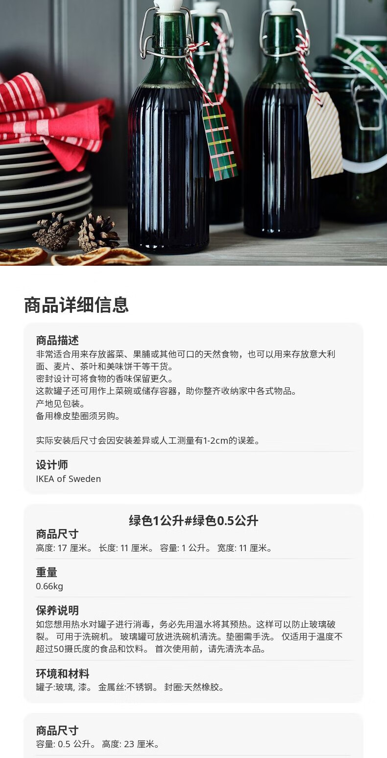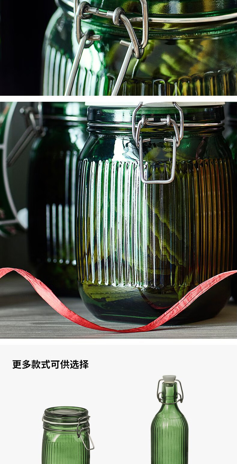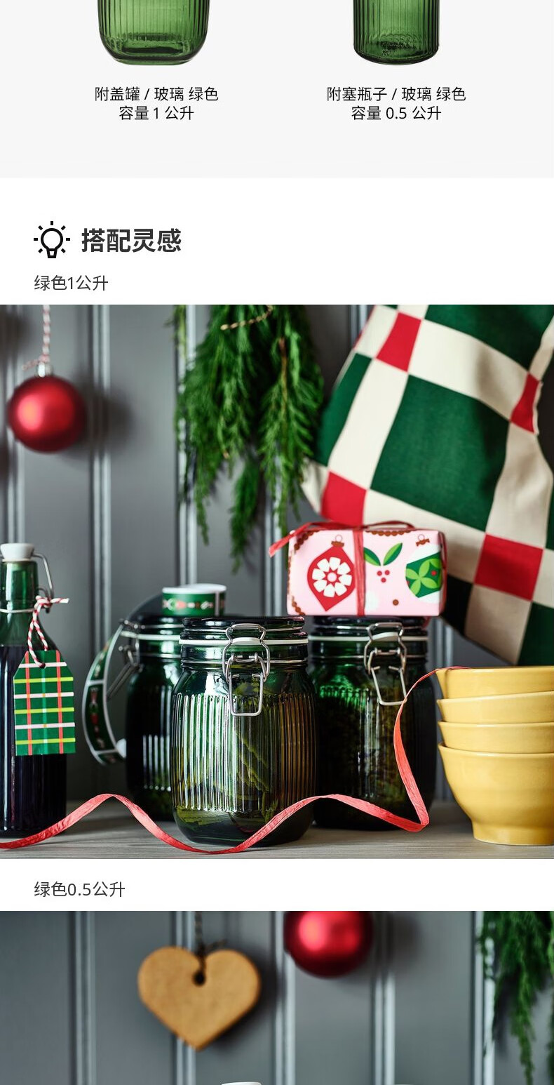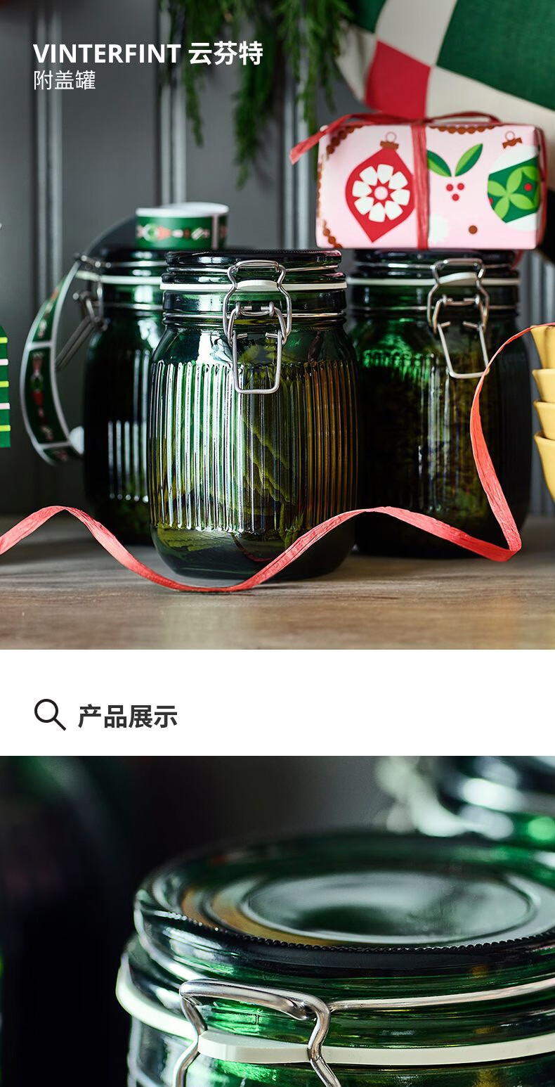 宜家(IKEA)【新品】VINTERFINT云芬特附盖罐储物罐密封罐酱菜罐 玻璃绿色附塞瓶子0.5L