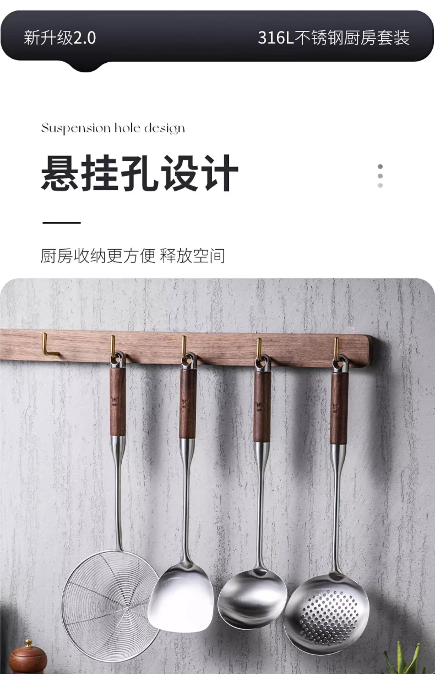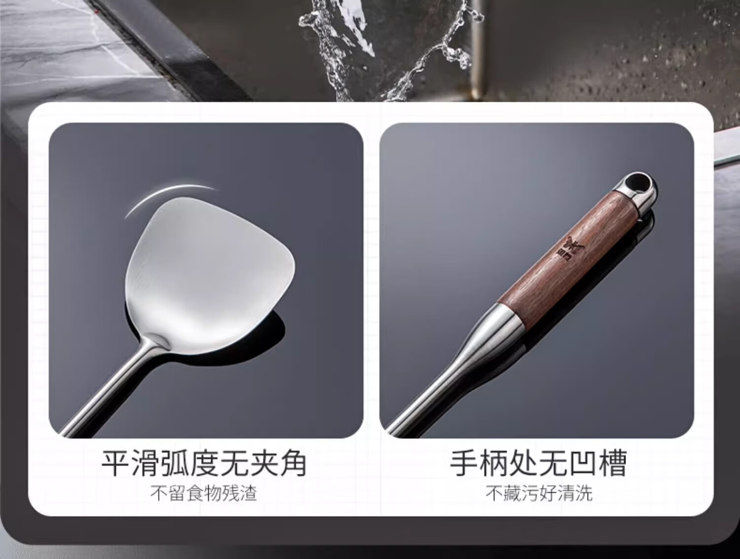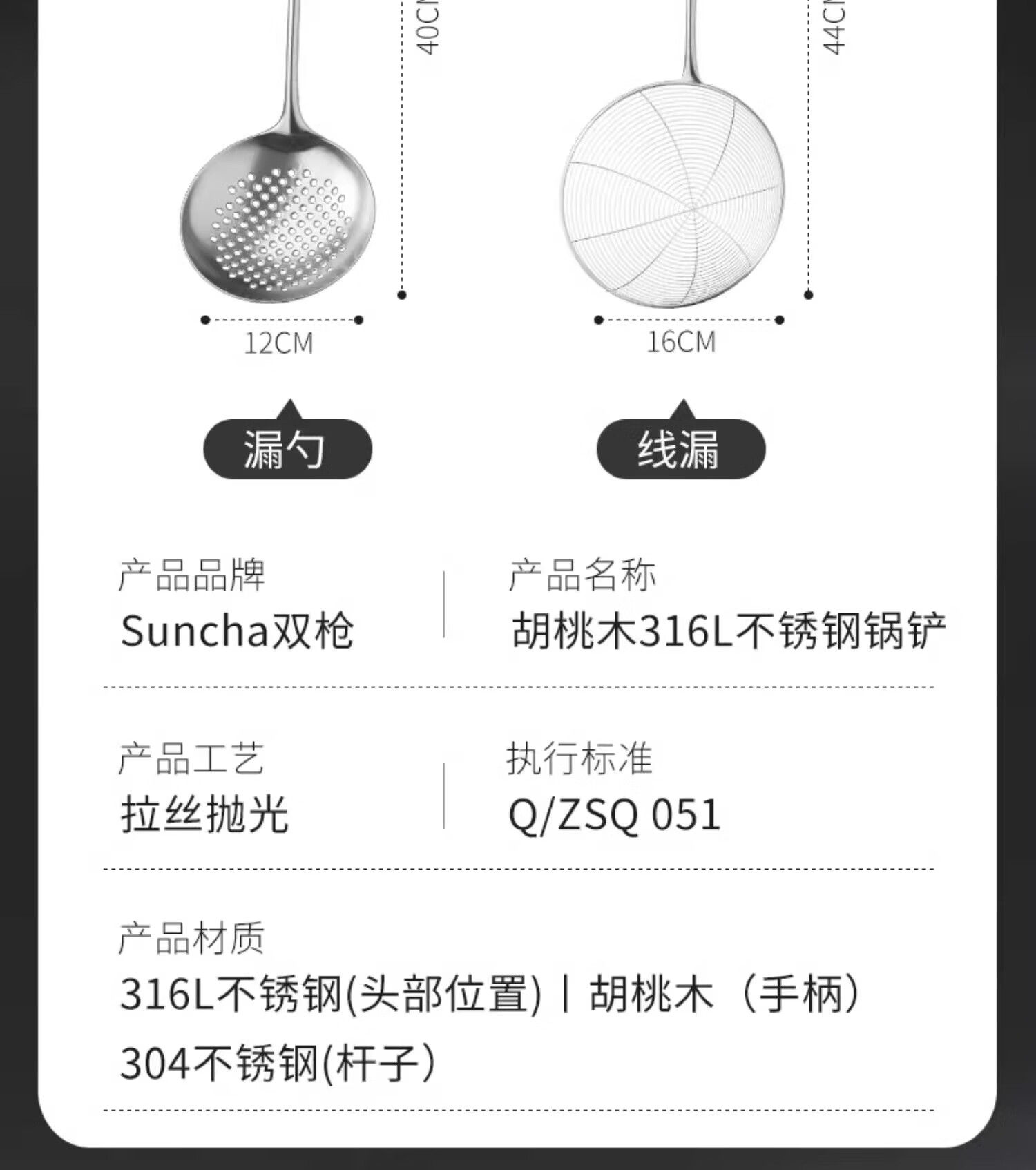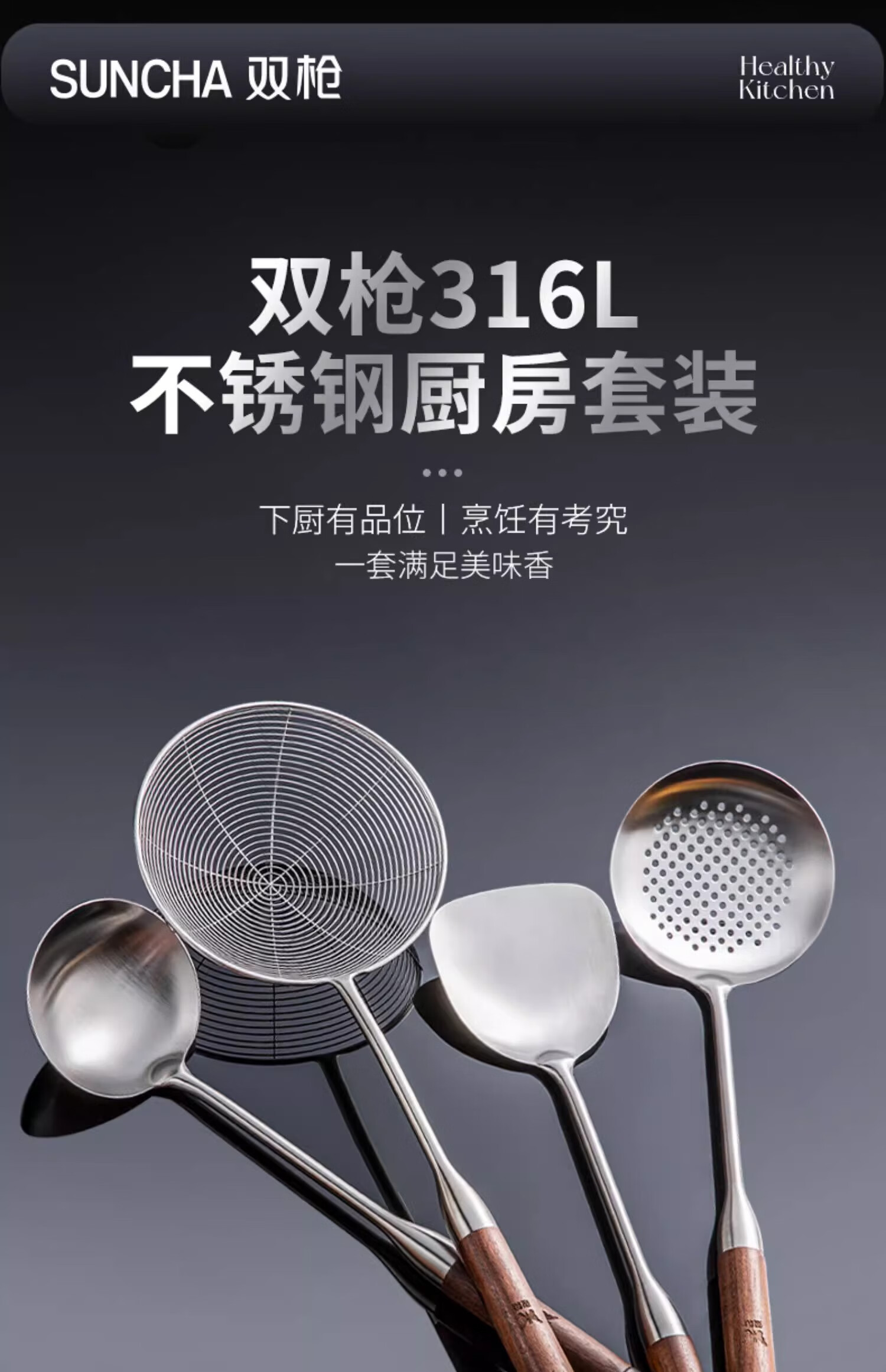 双枪316L锅铲三件套家用炒菜铁锅铲子 胡桃木手柄锅铲+汤勺+漏勺套装