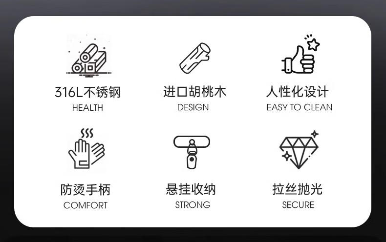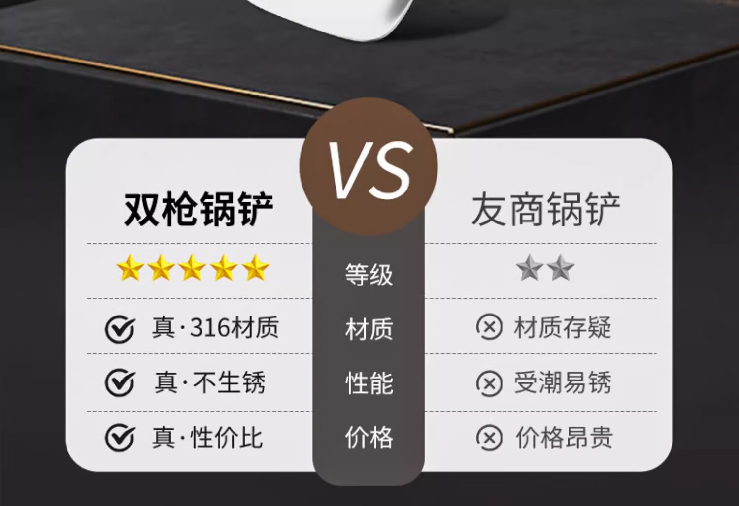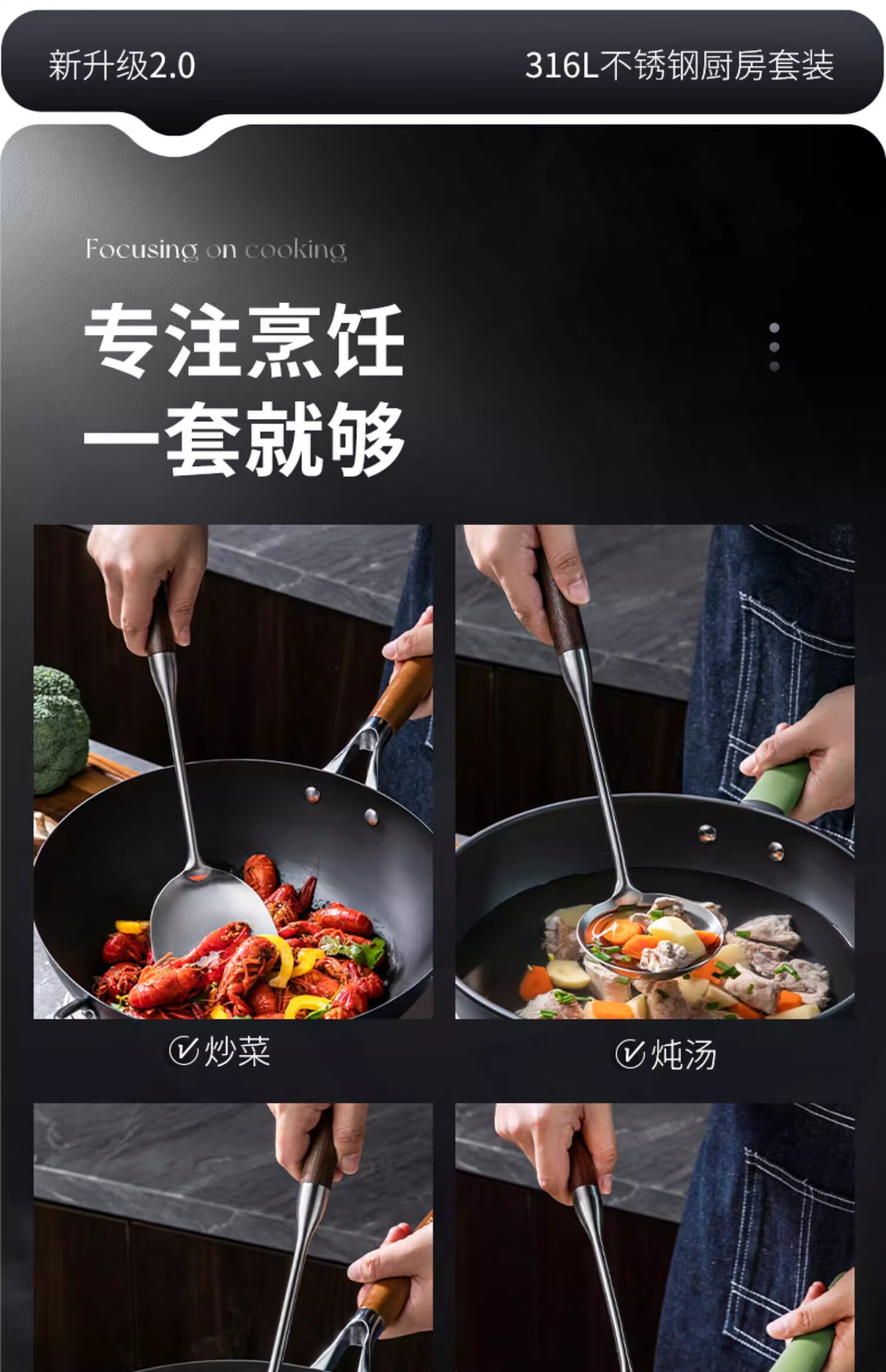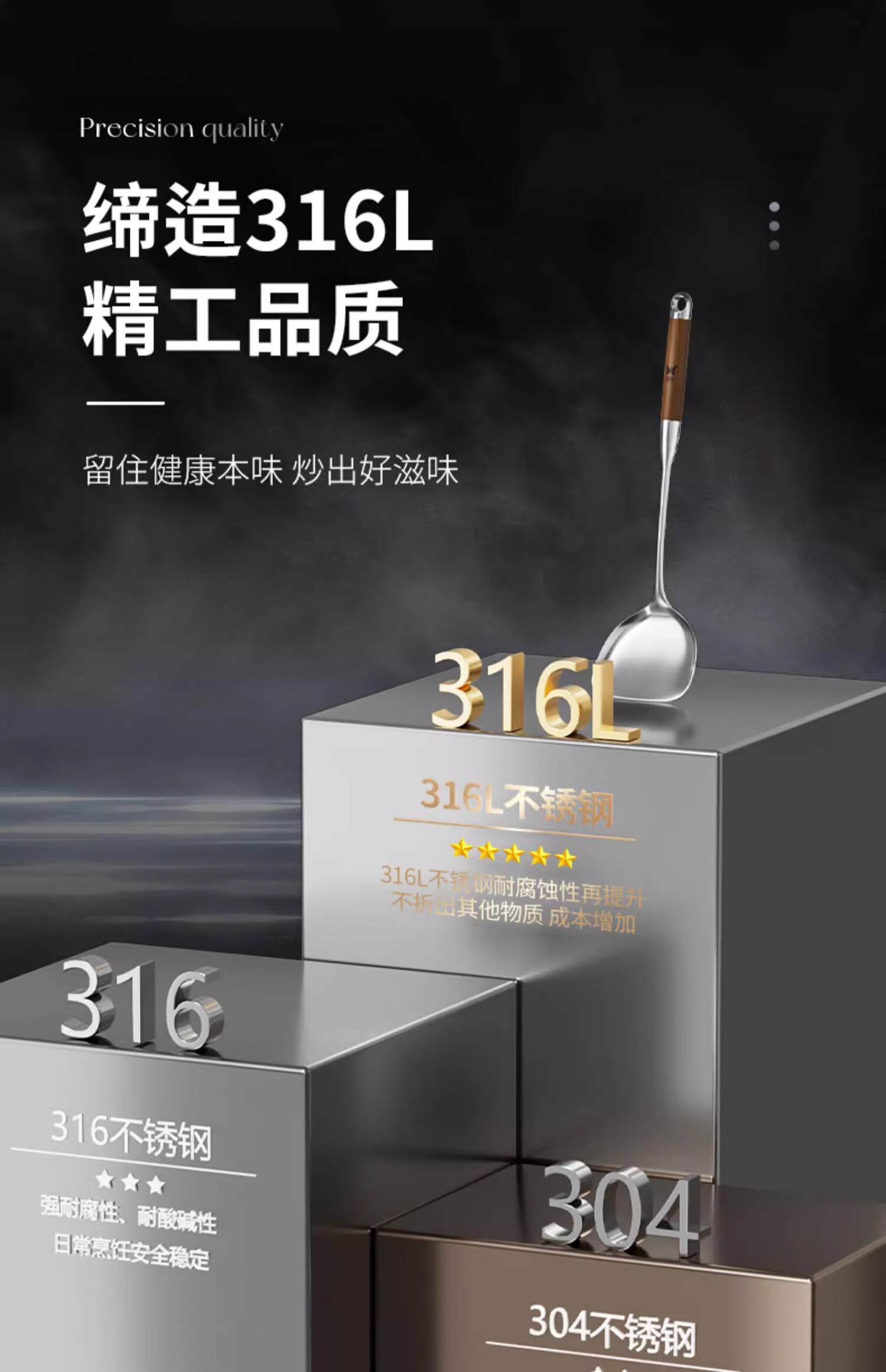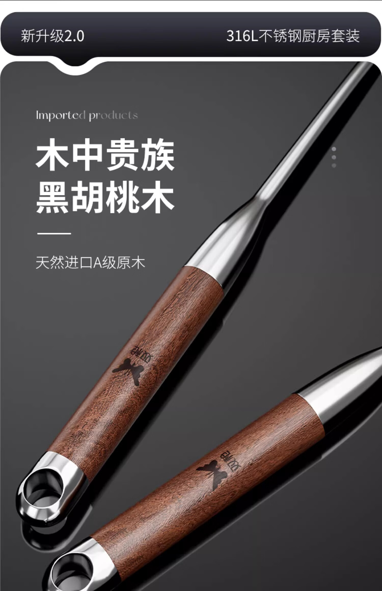 双枪316L锅铲三件套家用炒菜铁锅铲子 胡桃木手柄锅铲+汤勺+漏勺套装