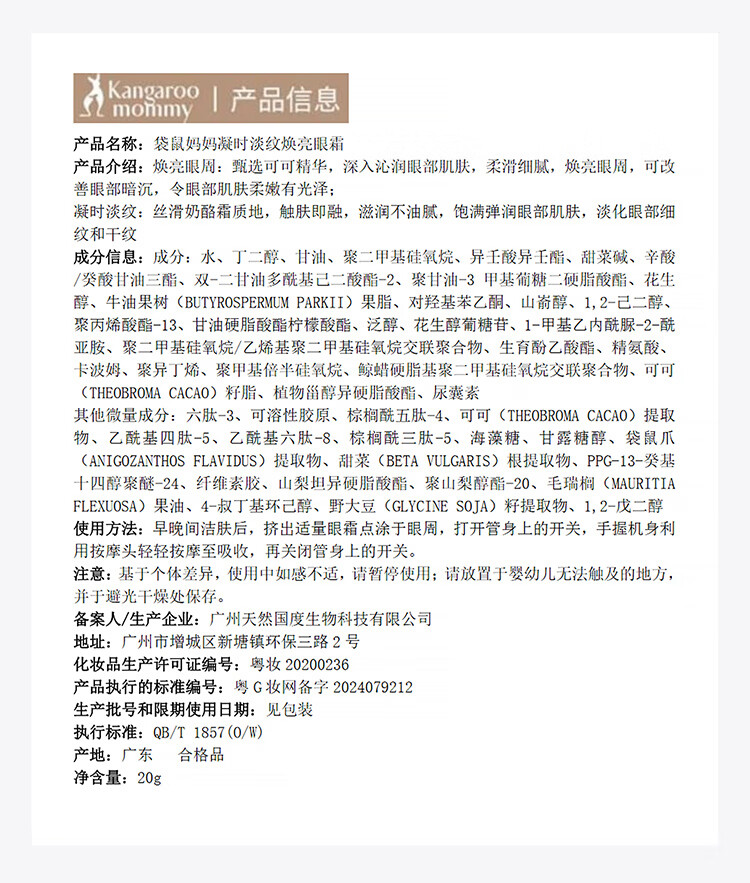 袋鼠妈妈凝时淡纹焕亮眼霜准孕妇护肤品淡化细纹提拉紧致黑眼圈抗皱专用