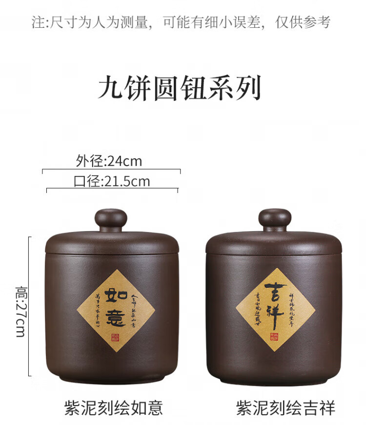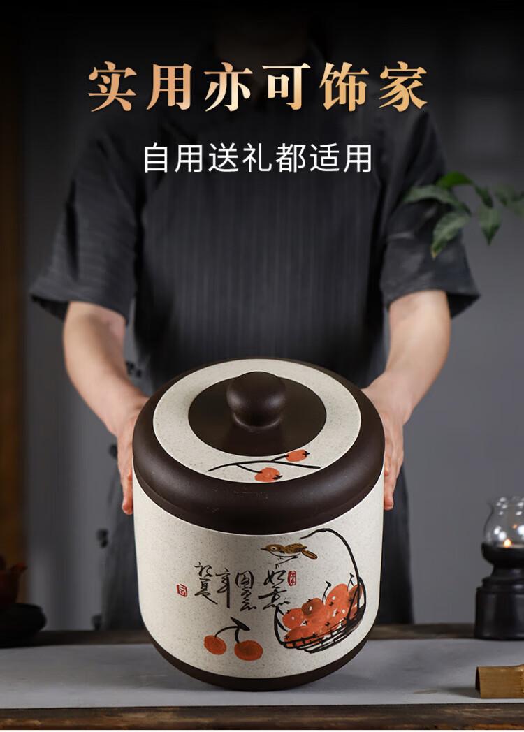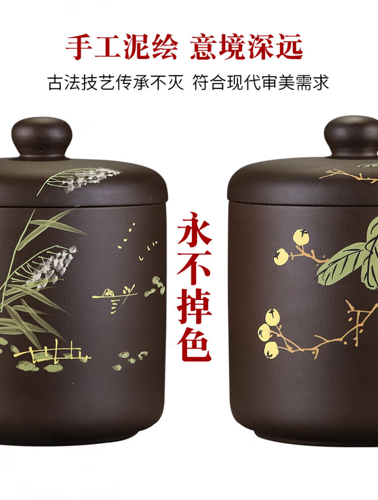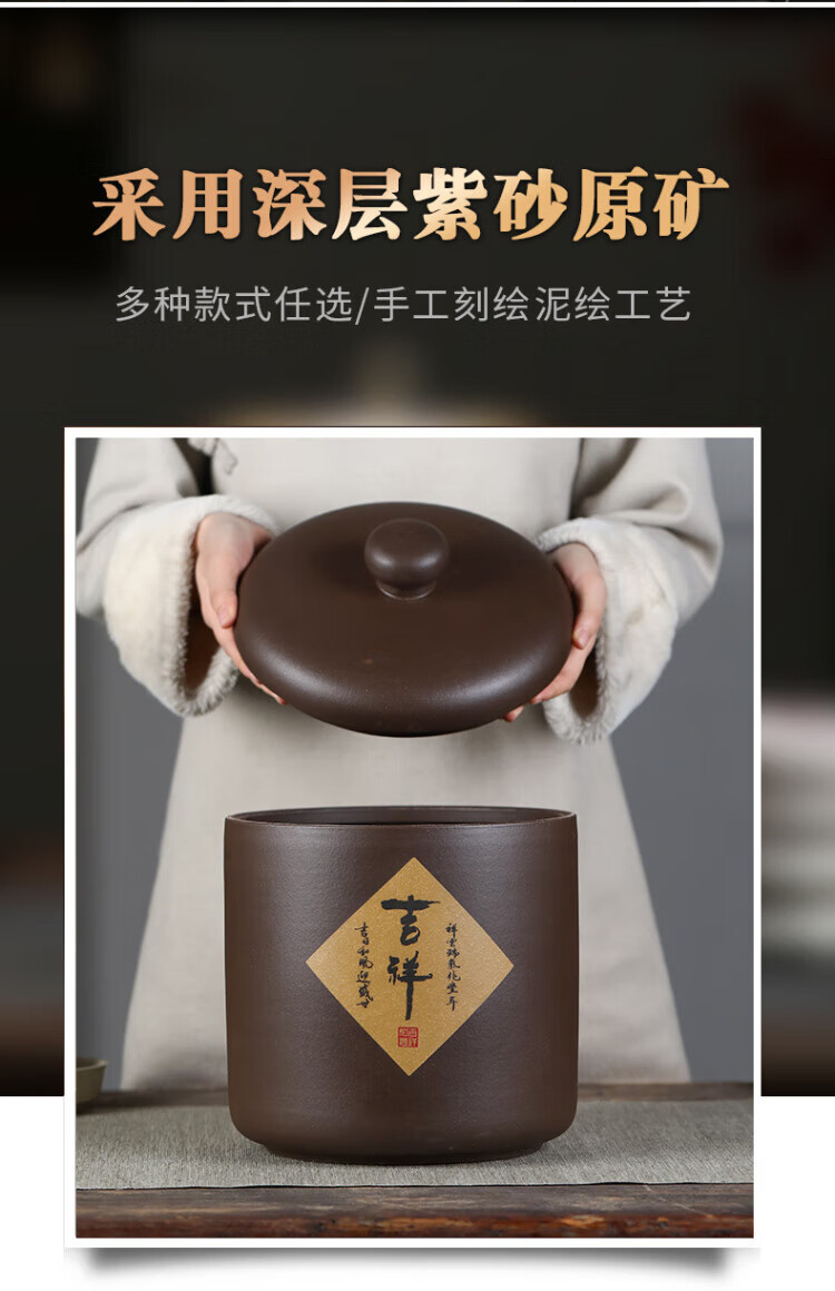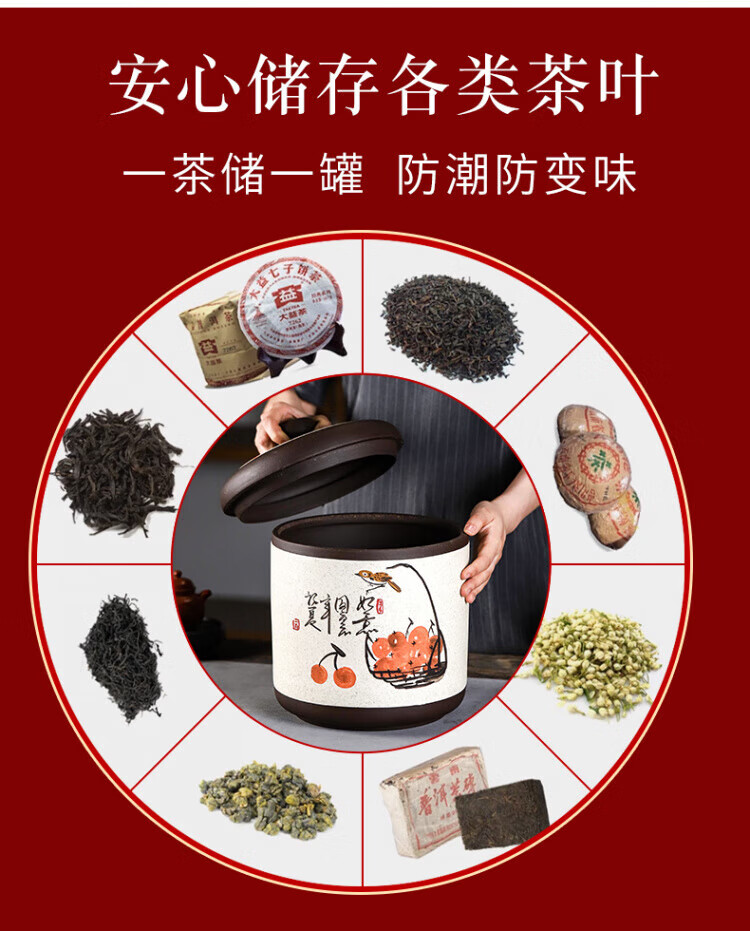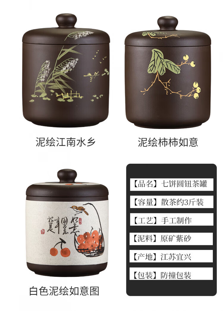 DEATKN德国宜兴紫砂茶叶罐七饼大号码普洱密封罐存储茶缸家用粗陶瓷茶叶 【7-圆钮红色】泥绘福禄双全 9饼