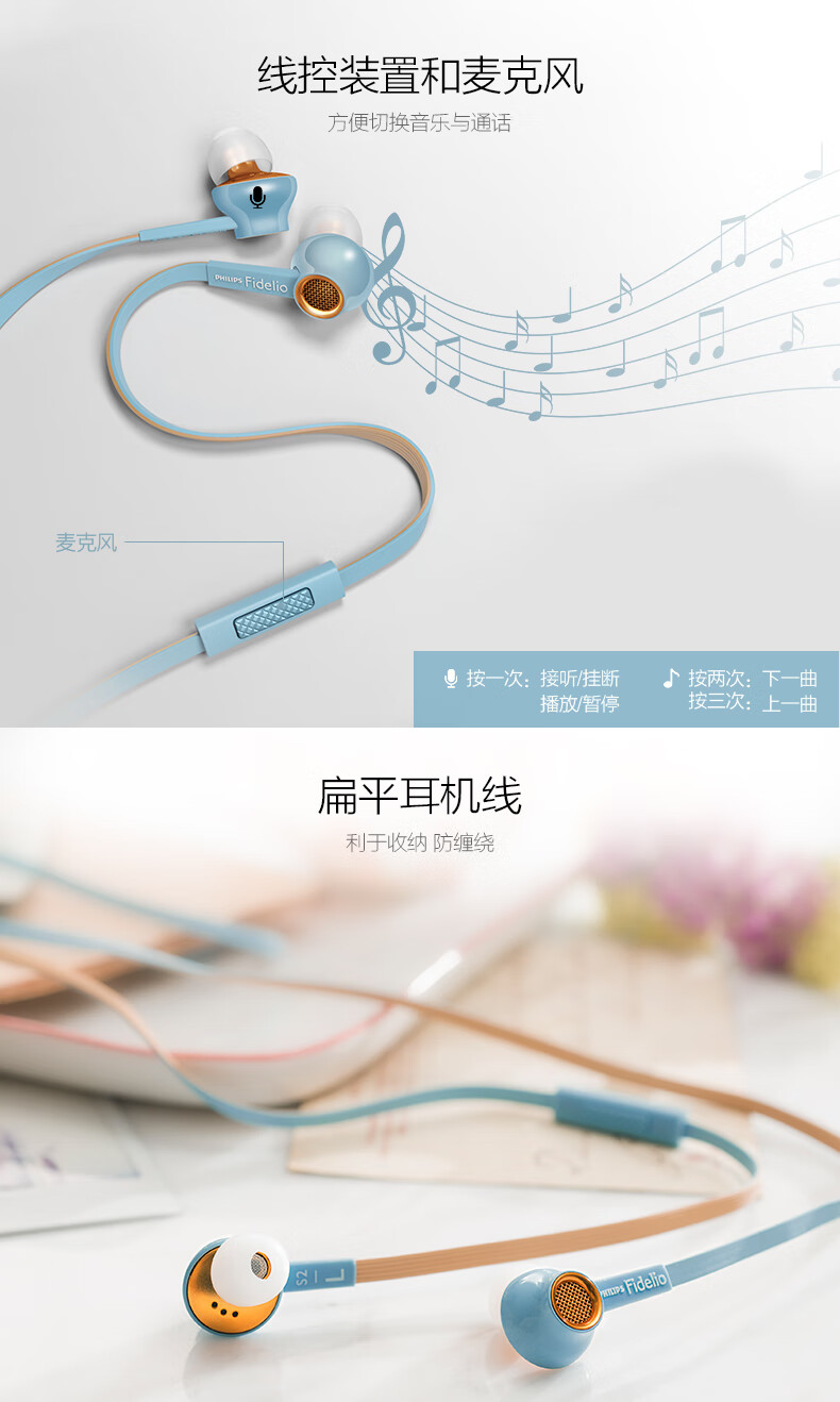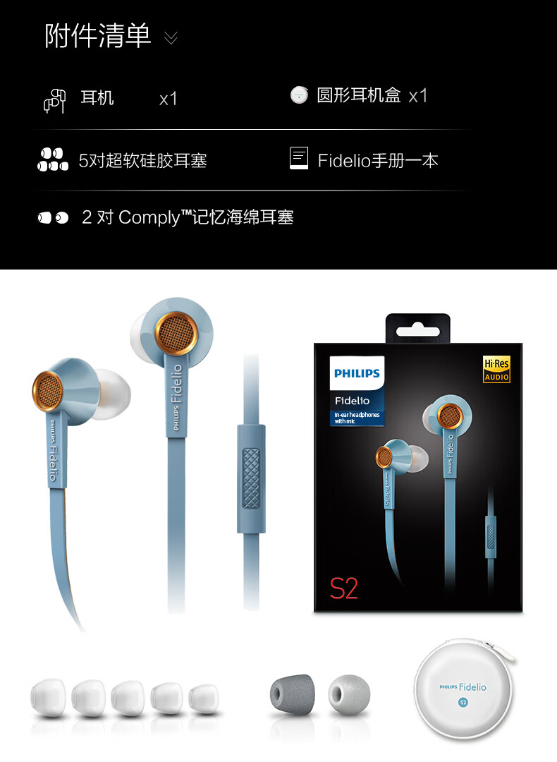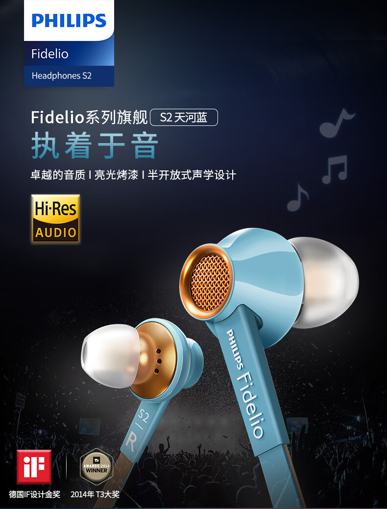飞利浦(PHILIPS)有线耳机入耳式HiFi音乐耳机Hi-Res高保真音质线控带麦3.5mm音频接口电脑手机礼物S2蓝