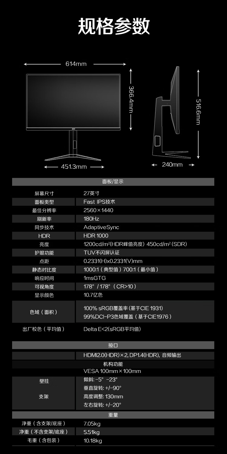 AOC 27英寸2K 180Hz 1152分区QD-MiniLED HDR1000 快速液晶1ms 游戏电竞电脑显示器 逐光系列 Q27G4XM