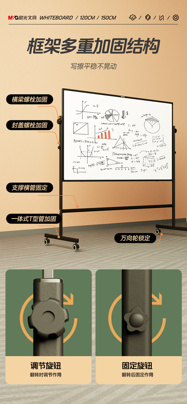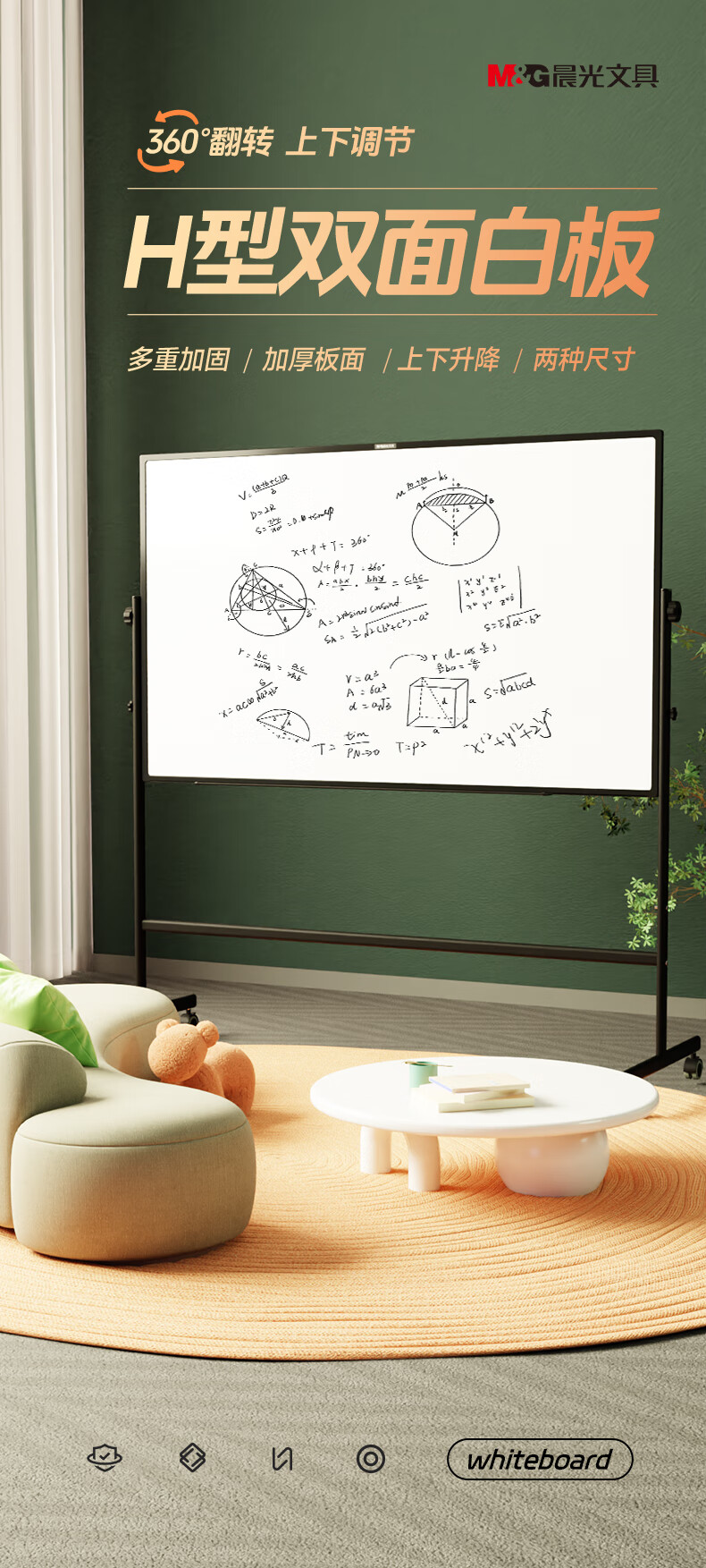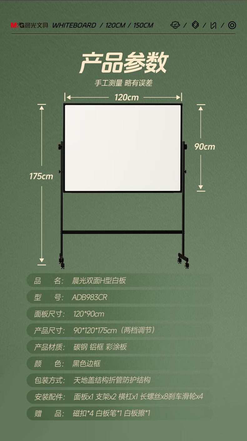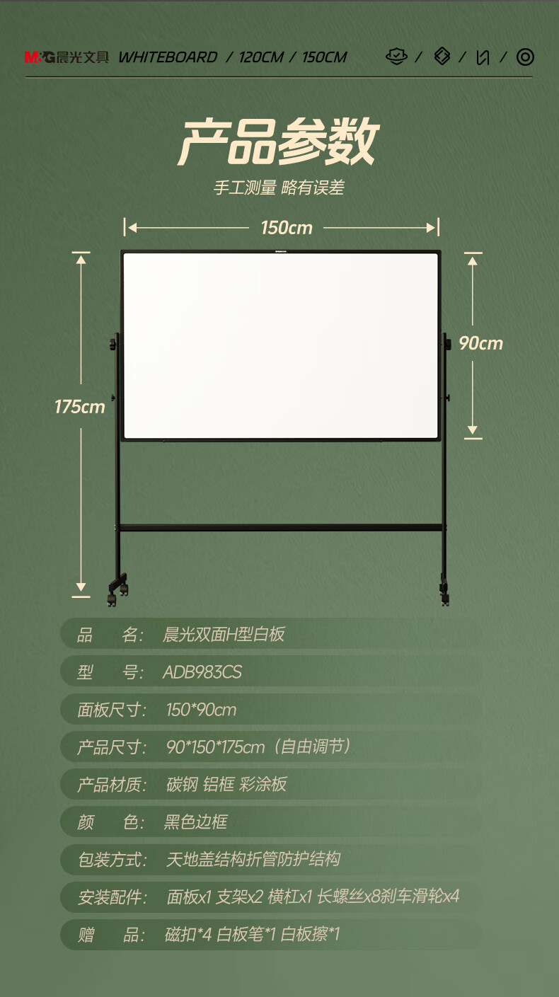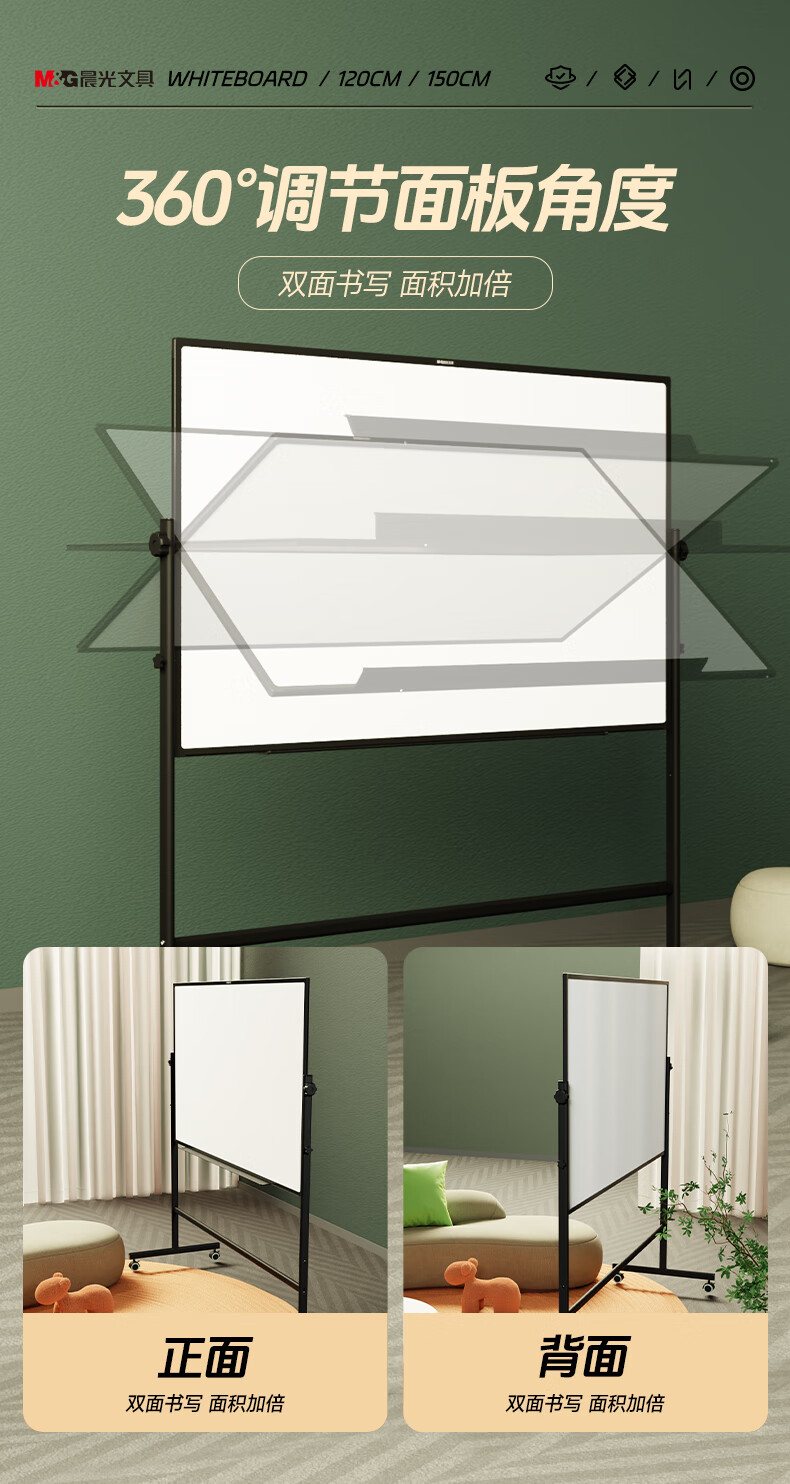 晨光(M&G)家用高端款90*150cmH型支架式白板 双面书写可移动升降儿童画板/办公会议白板黑板/写字板ADB983CS