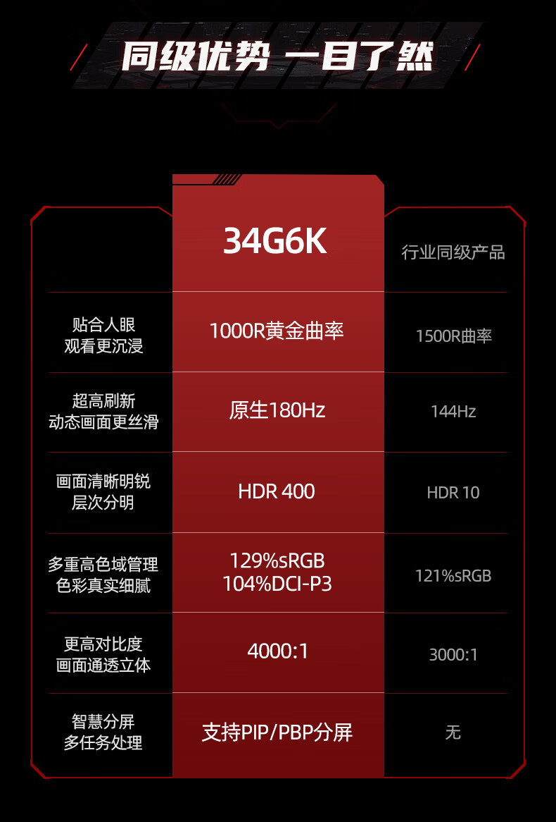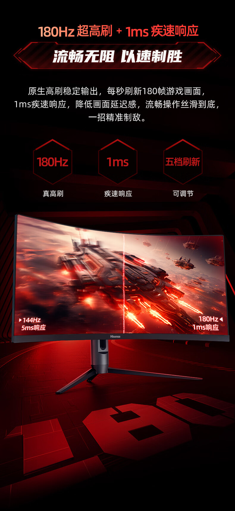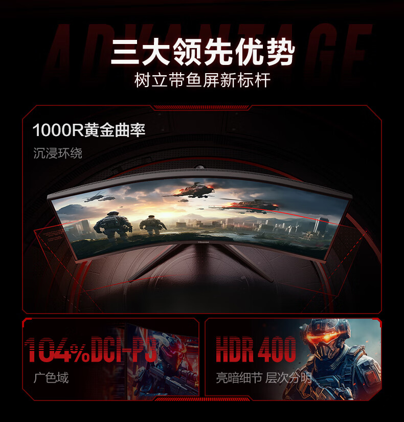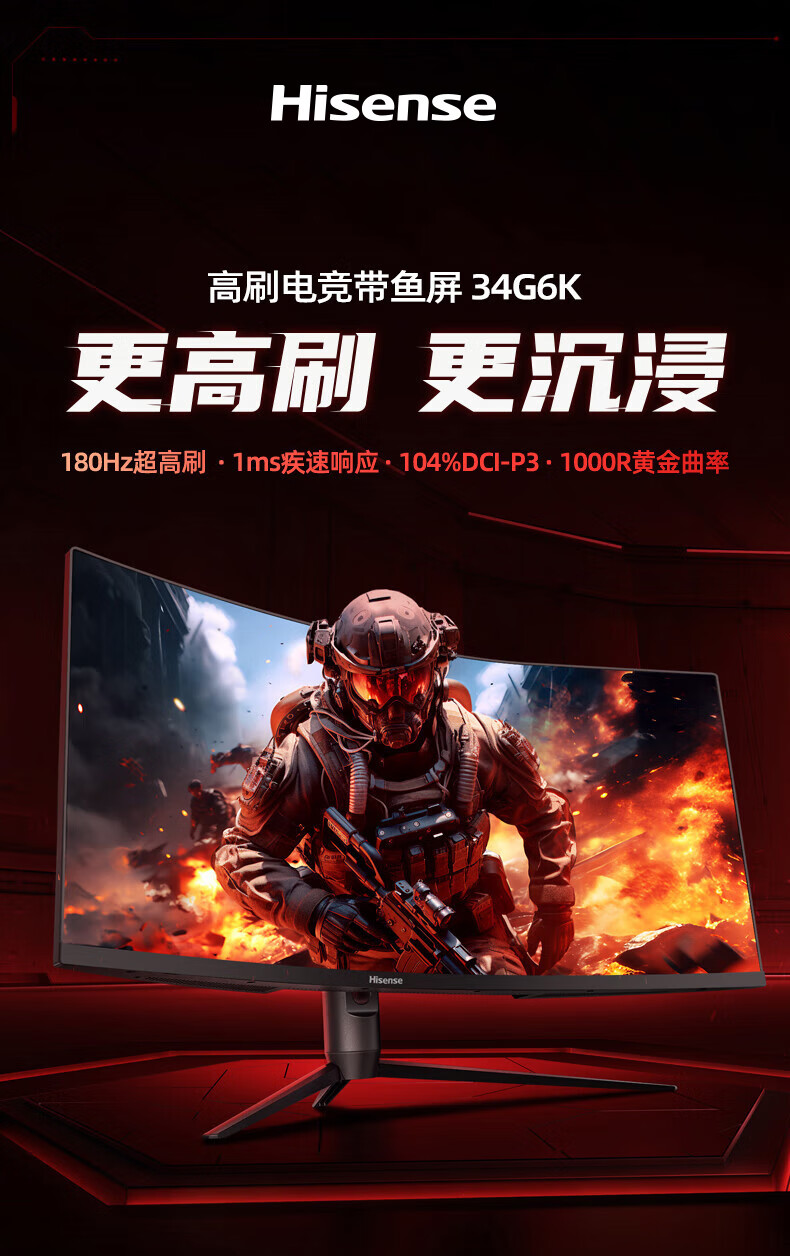 海信34英寸带鱼屏 180Hz高刷 1000R曲率 104%DCI-P3 HDR400 WQHD 曲面电竞显示屏 显示器 34G6K