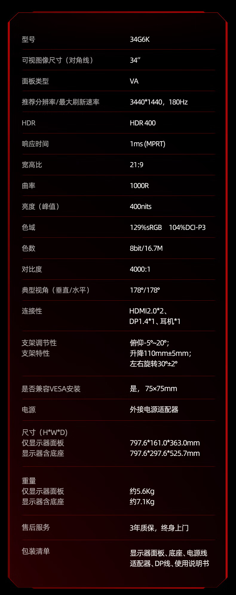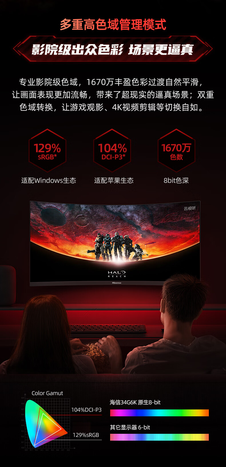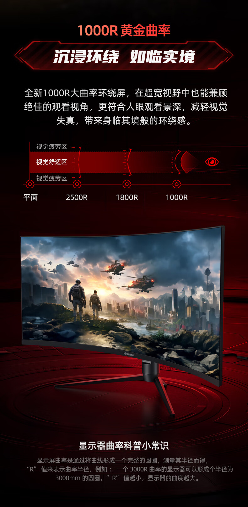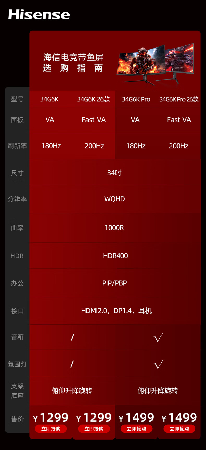 海信34英寸带鱼屏 180Hz高刷 1000R曲率 104%DCI-P3 HDR400 WQHD 曲面电竞显示屏 显示器 34G6K