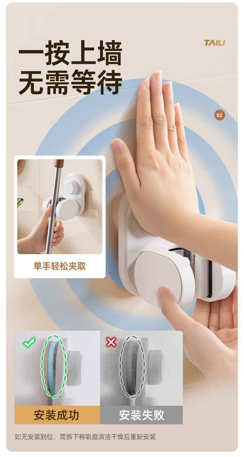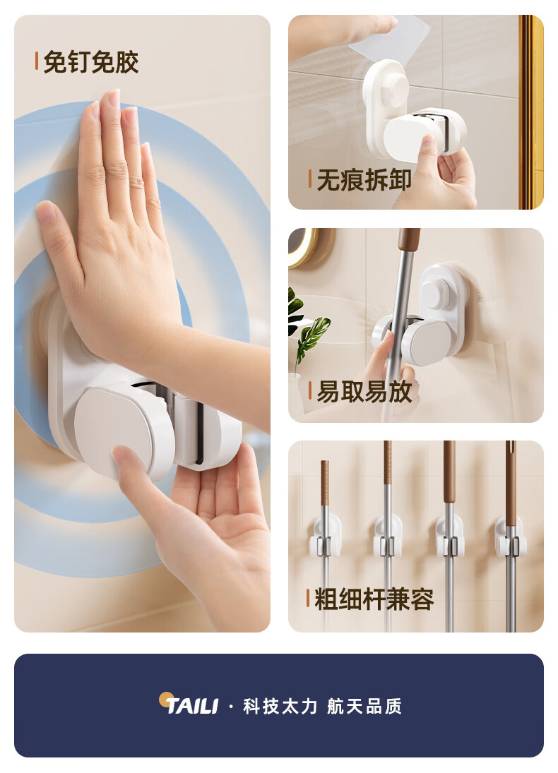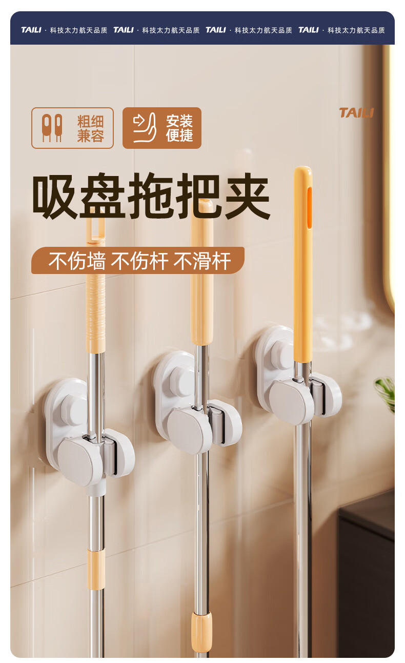 太力吸盘式拖把卡扣固定器拖把夹壁挂强力拖把挂钩浴室收纳置物架 拖把夹白色 1个