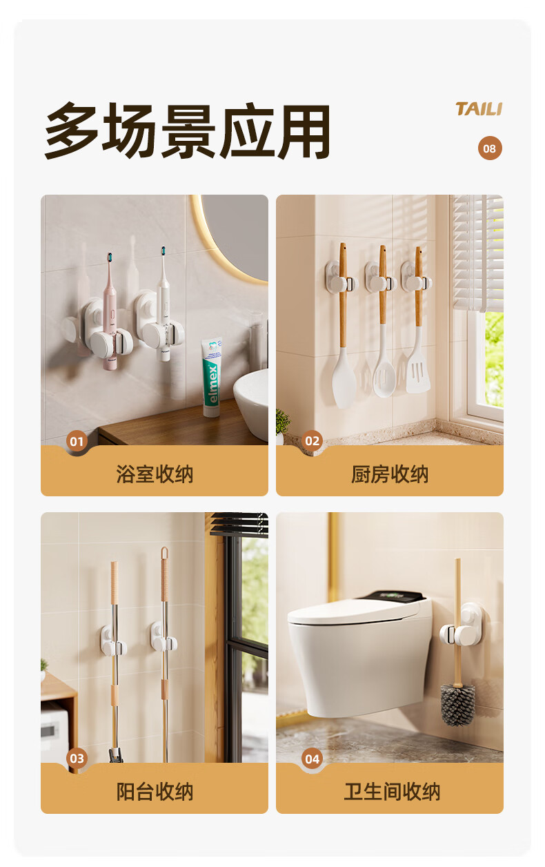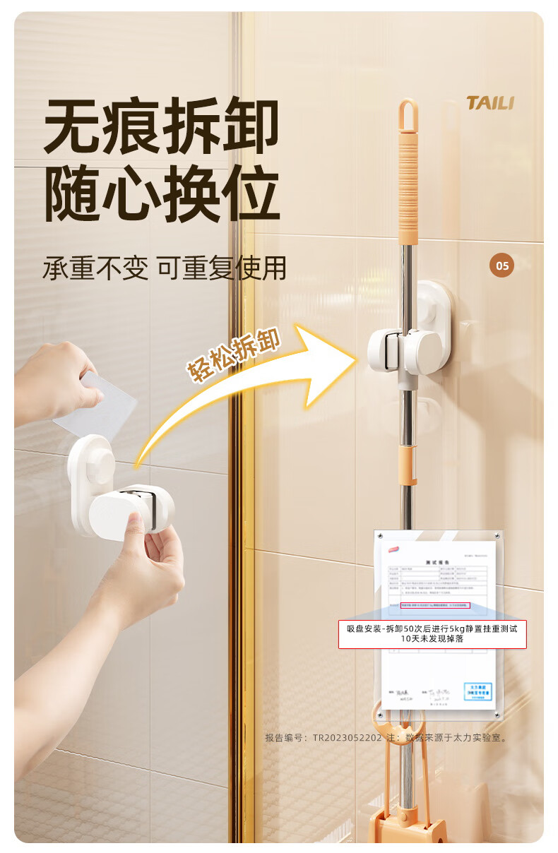 太力免打孔拖把挂架墙上卡扣固定器无痕拖把壁挂夹浴室卫生间收纳神器 灰白色 1个