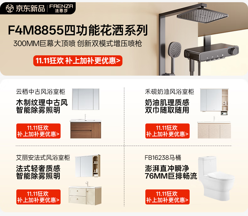 法恩莎卫浴四出水喷头增压花洒钢琴键喷枪大置物台易洁顶喷淋浴花洒套装 F4M8854GGW