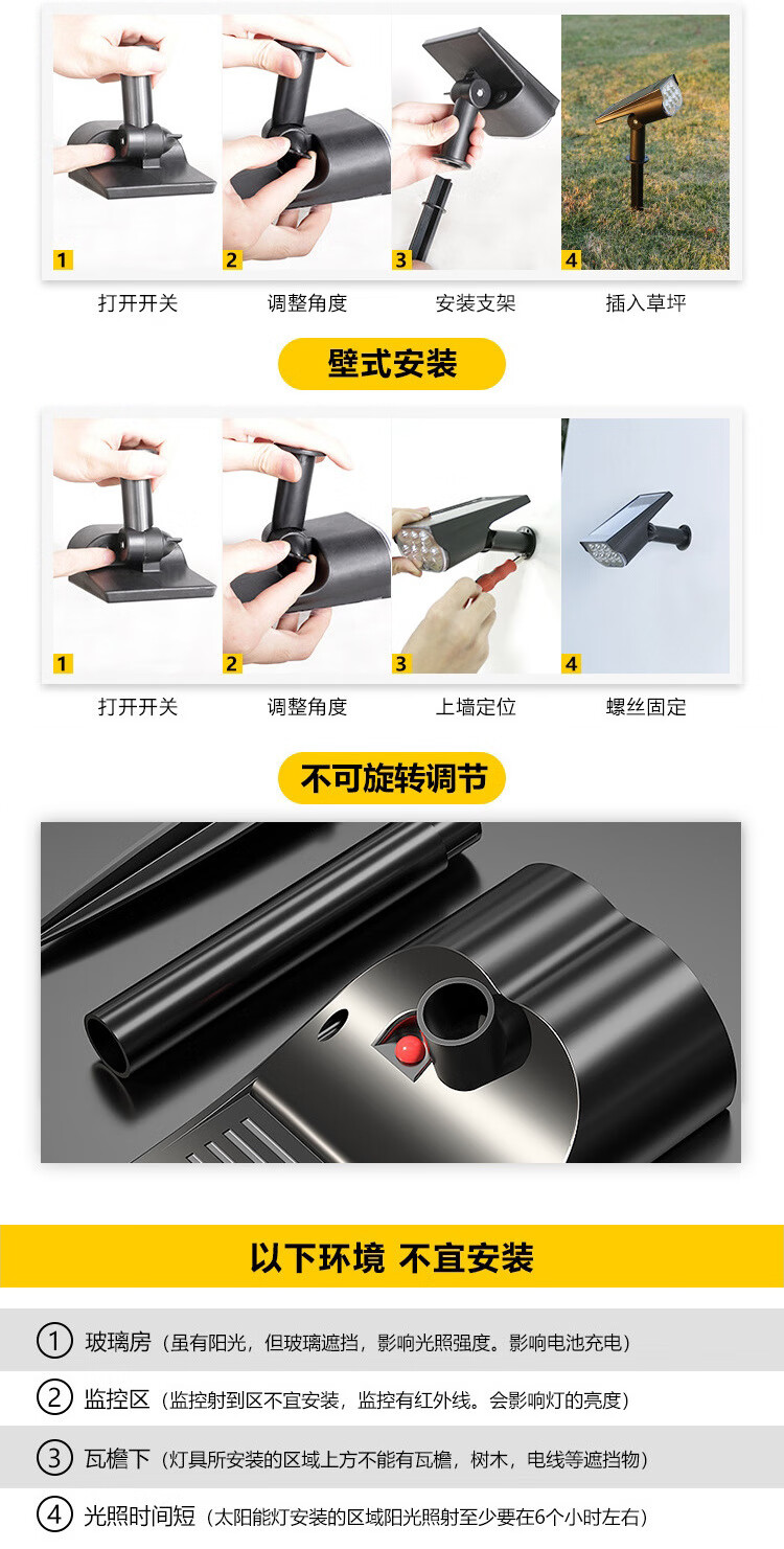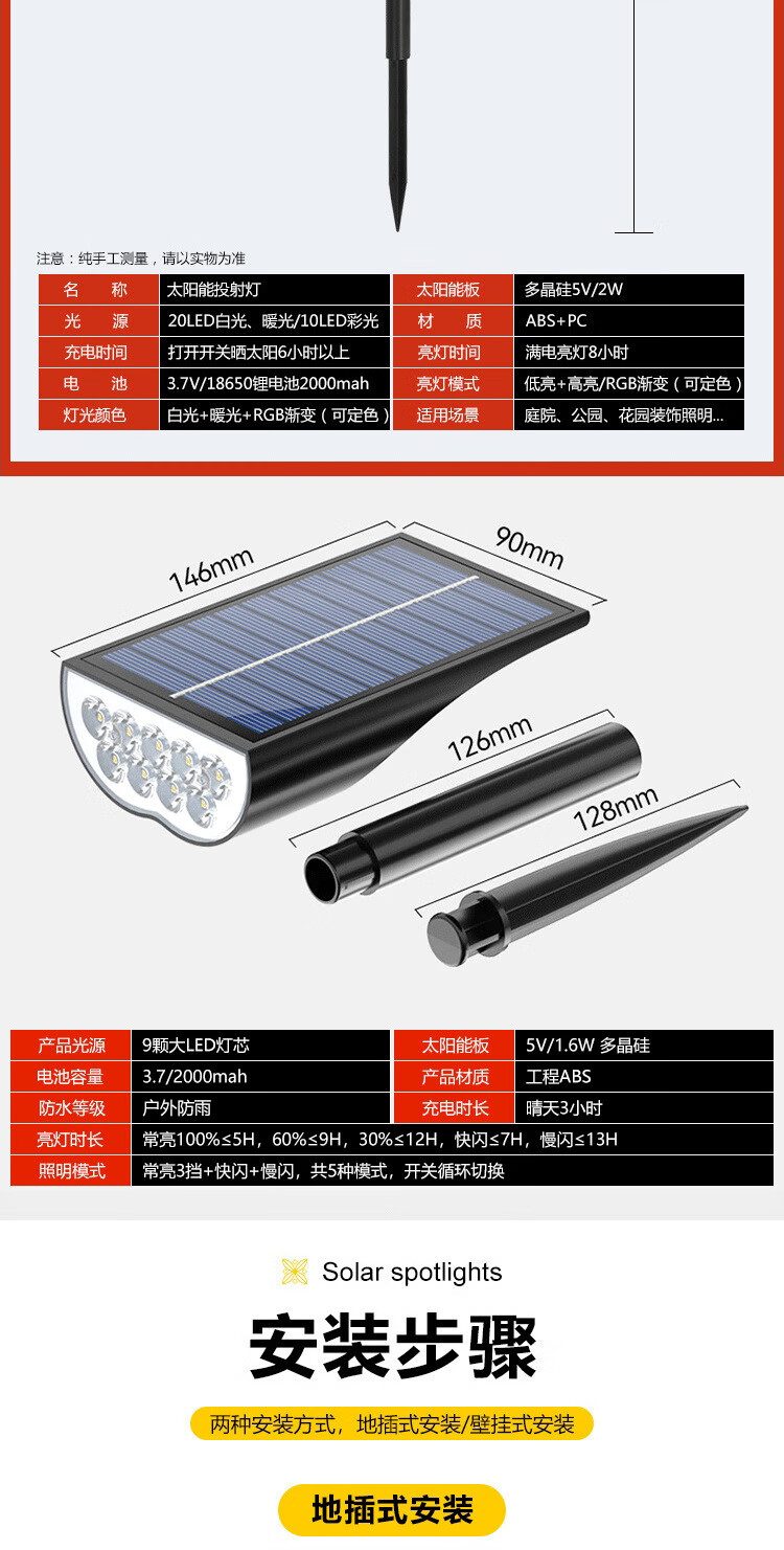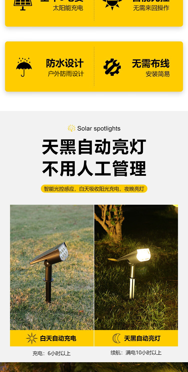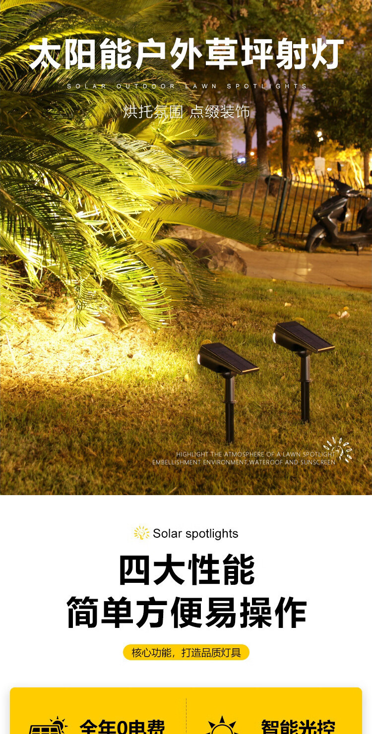 振牛太阳能射灯户外超亮防水插地草坪家用室外景观庭院花园照树氛围灯 A款-7灯珠-白光 地插壁装两用-智能光控感应