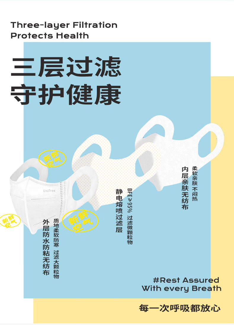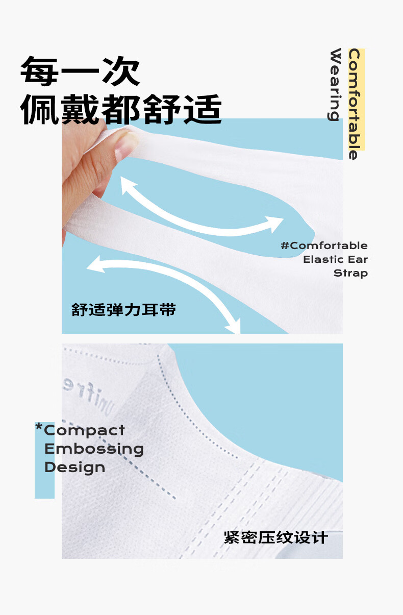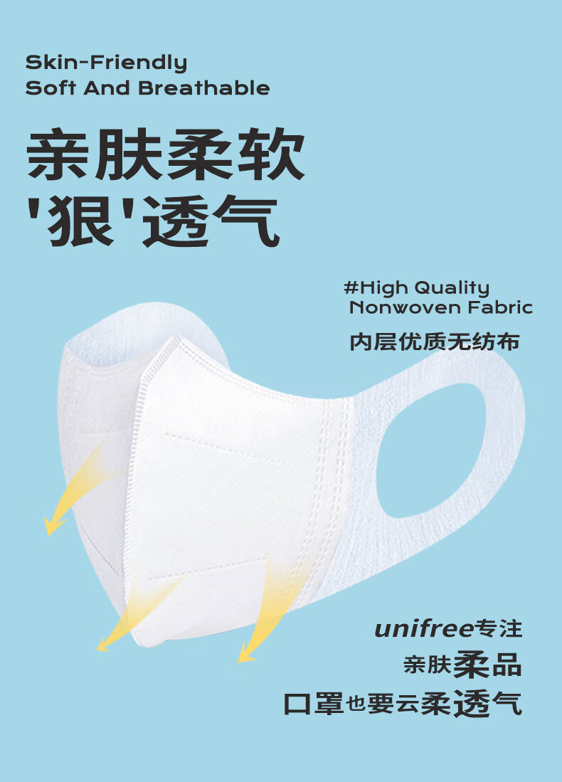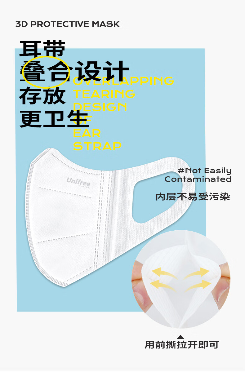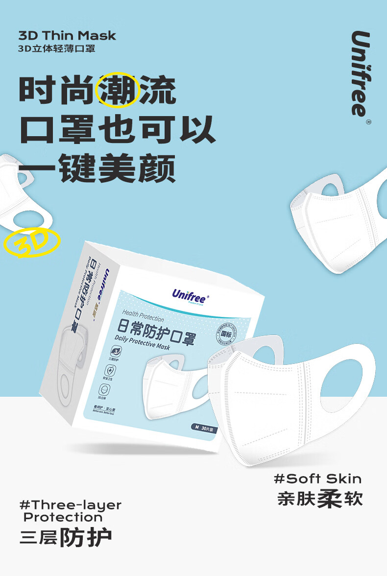 unifree一次性口罩3D立体防护 3层防护防飞沫 透气含熔喷布 30片/盒 【秒变小V脸】黑色M码30只