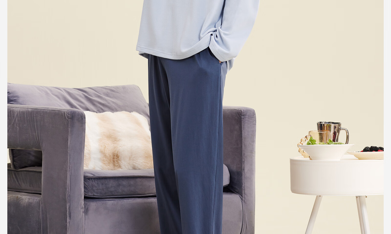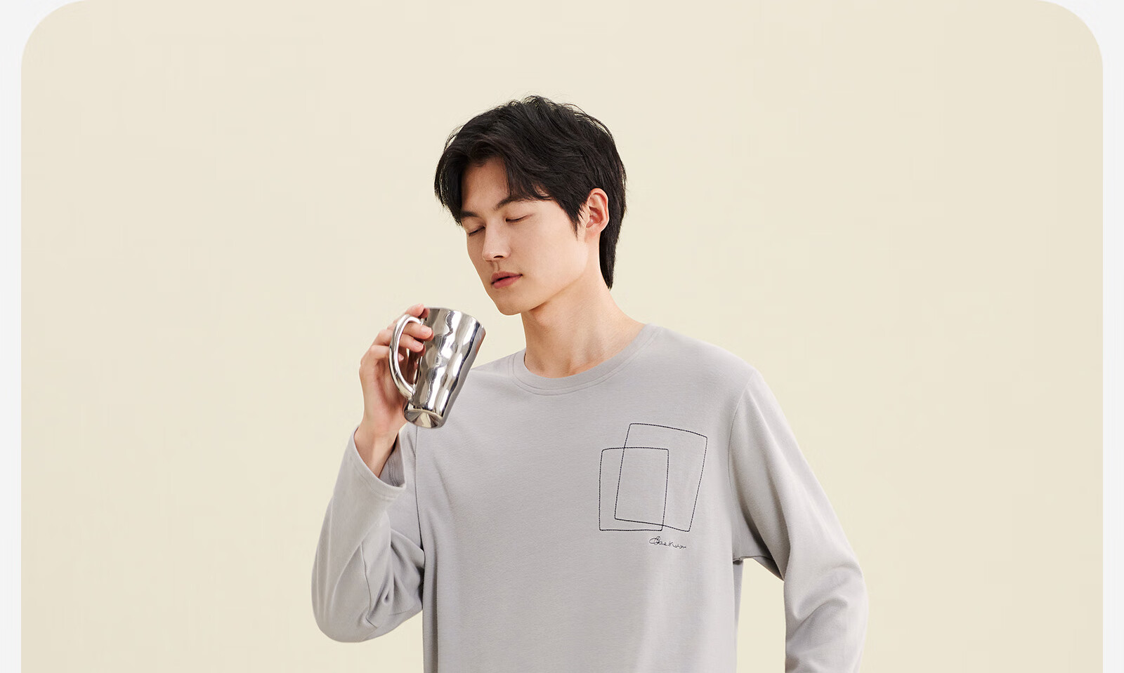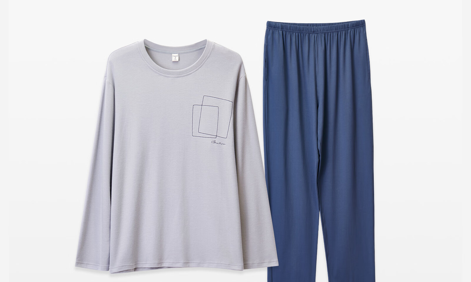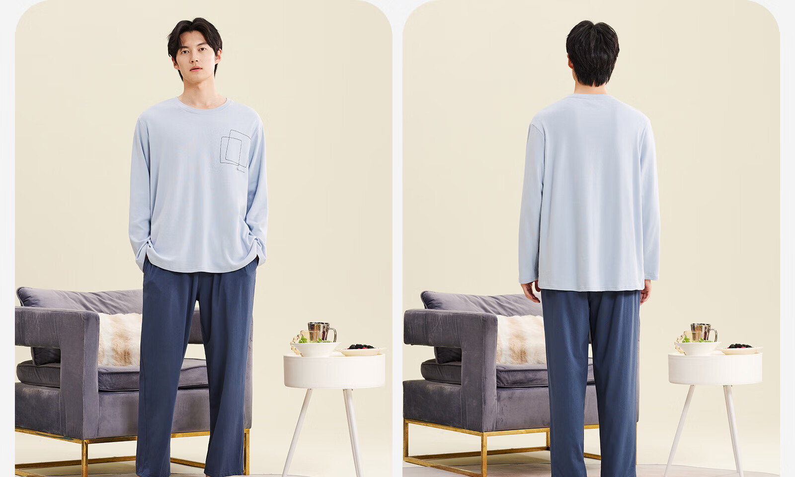 达尔丽睡衣男春秋款纯棉圆领长袖长裤简约男士家居服套装秋季薄款可外穿 T9245245-022-中蓝 L