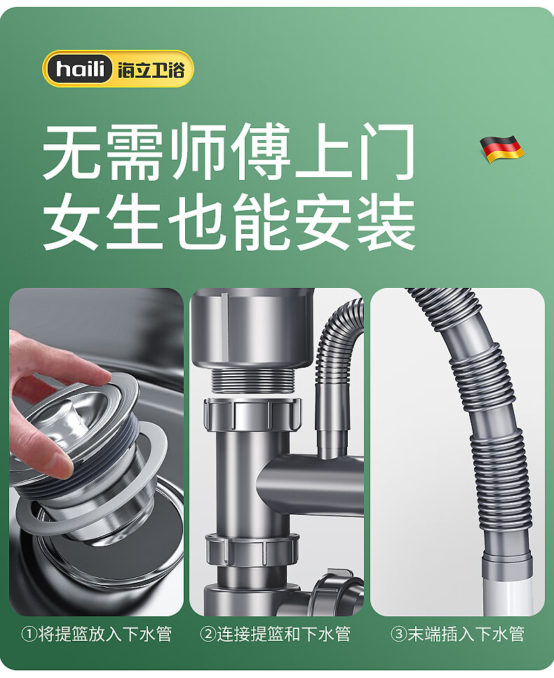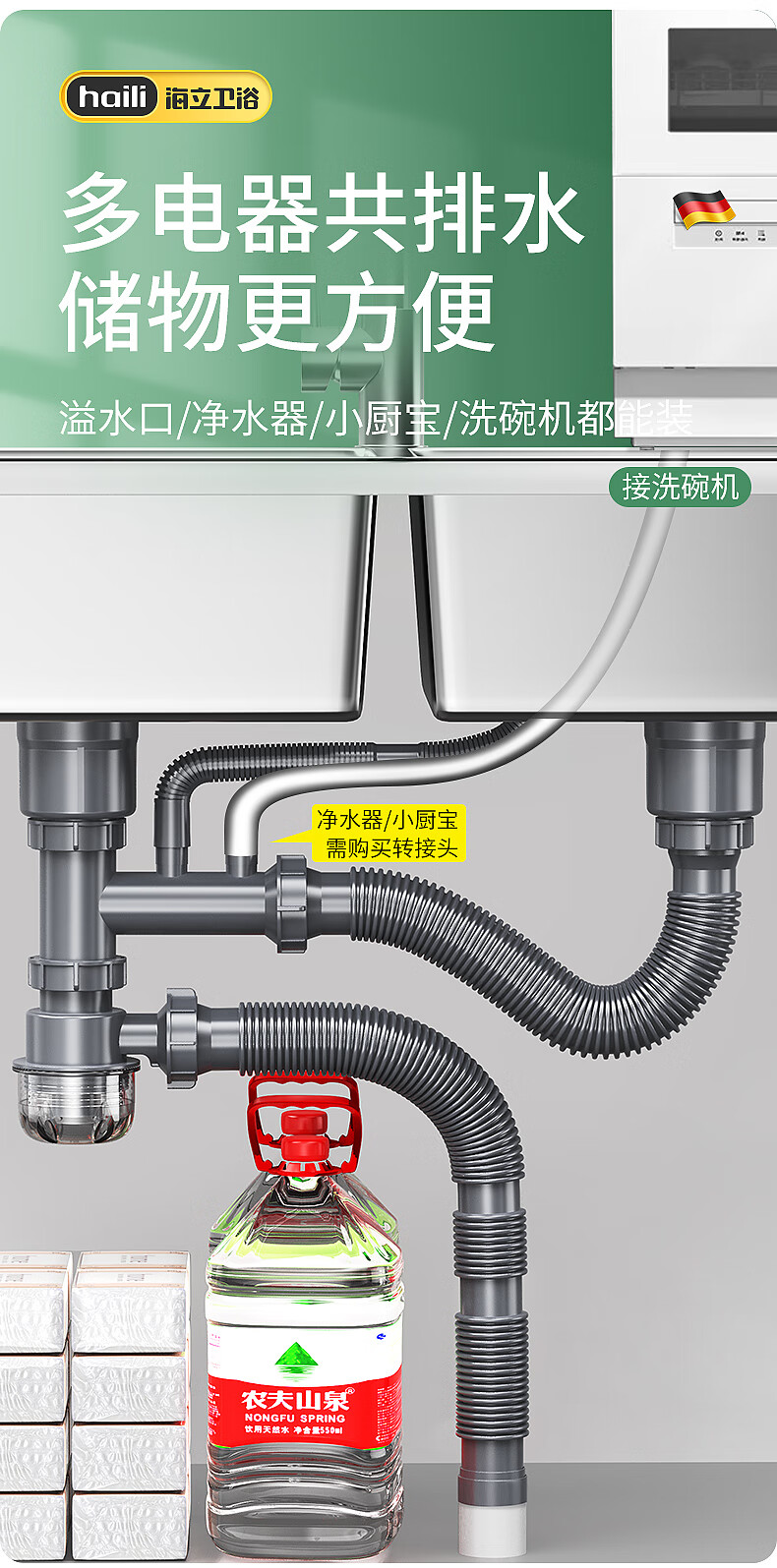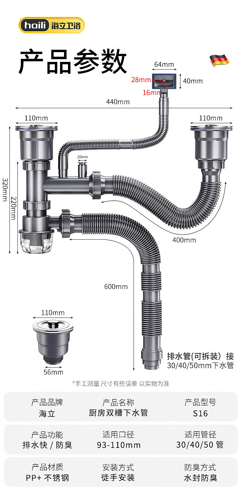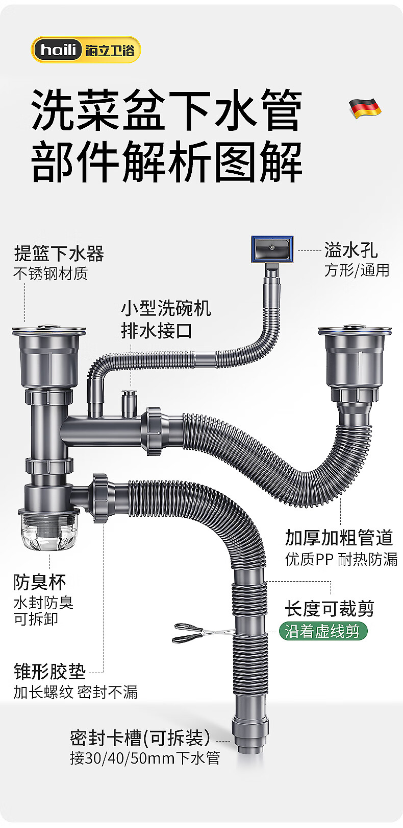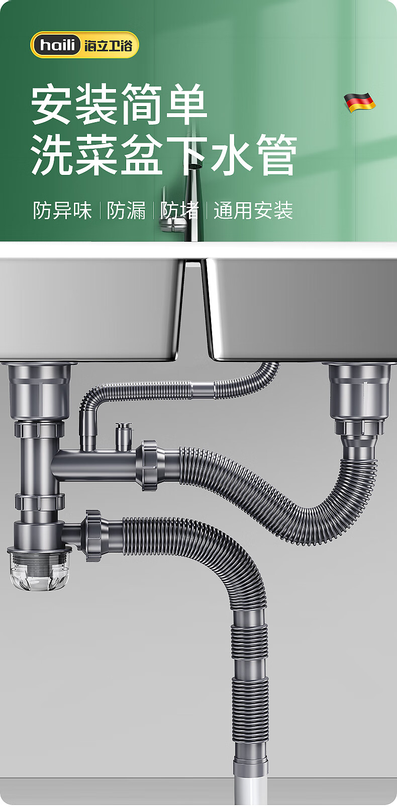 海立厨房洗菜盆下水管110双水槽下水器洗碗台盆池PP排水管防臭套装S16