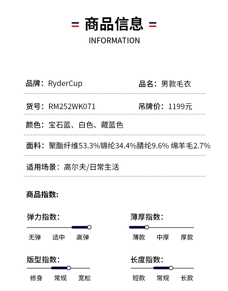 RYDER CUP莱德杯高尔夫服装男装毛衣25秋冬柔软舒适防风保暖圆领运动针织衫 宝石蓝 XL