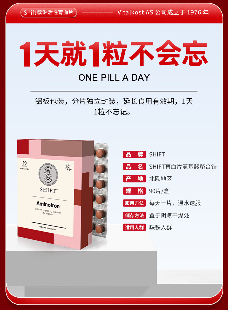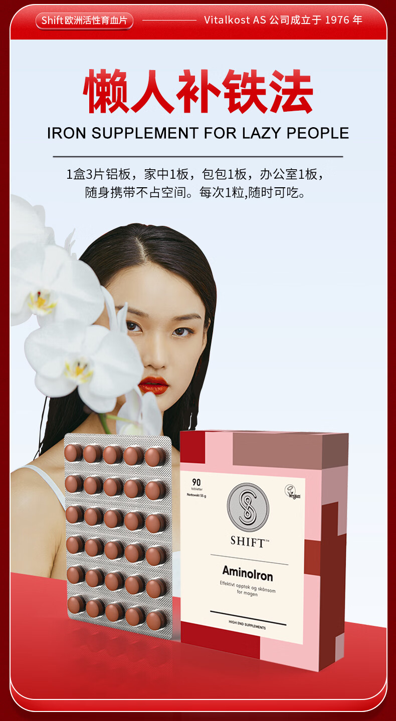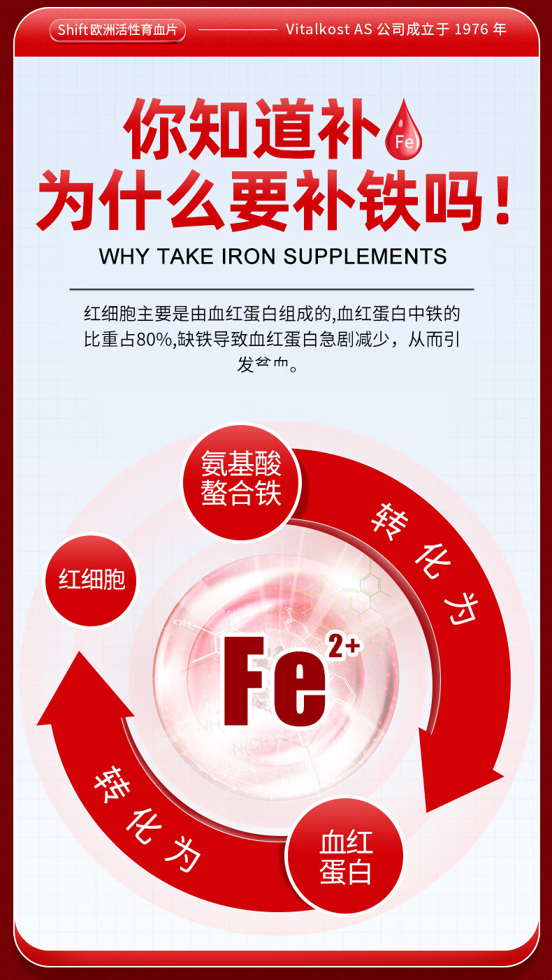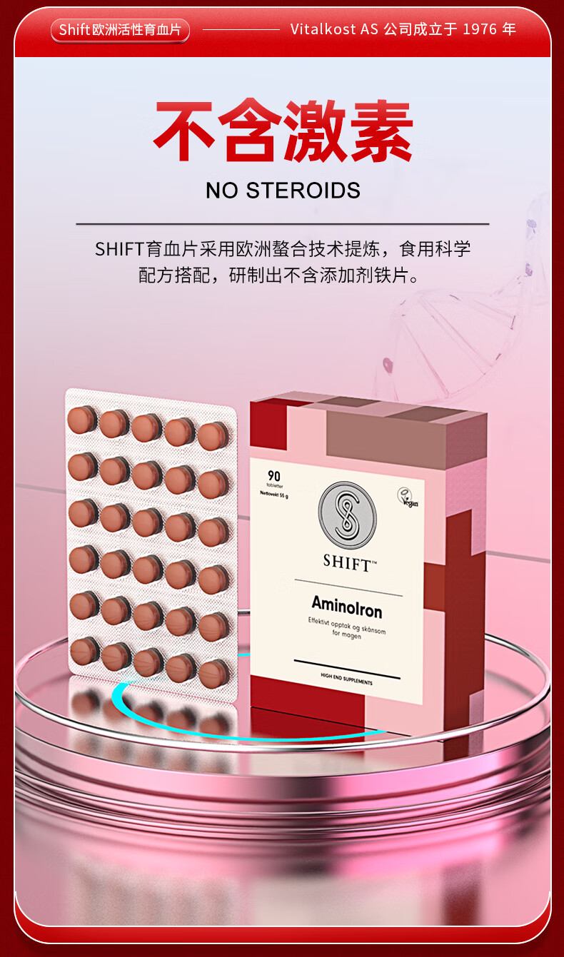 Shift活性铁 补血片补铁剂 血红素 孕妇女性贫血哺乳期 挪威进口 90片