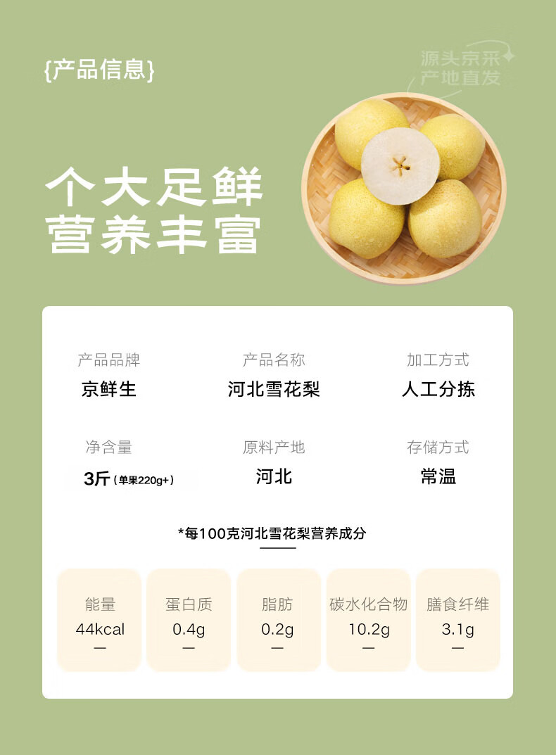 京鲜生 河北雪花梨 净重3斤 单果220g+ 生鲜水果 源头直发 包邮