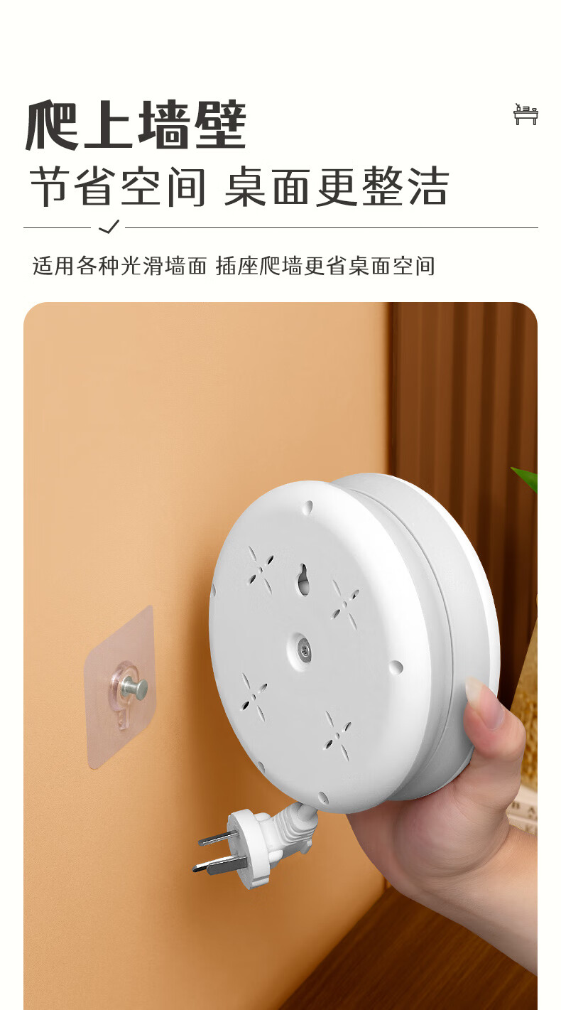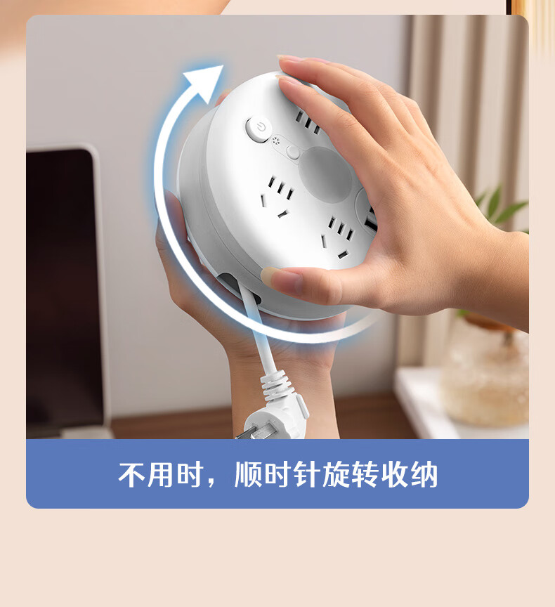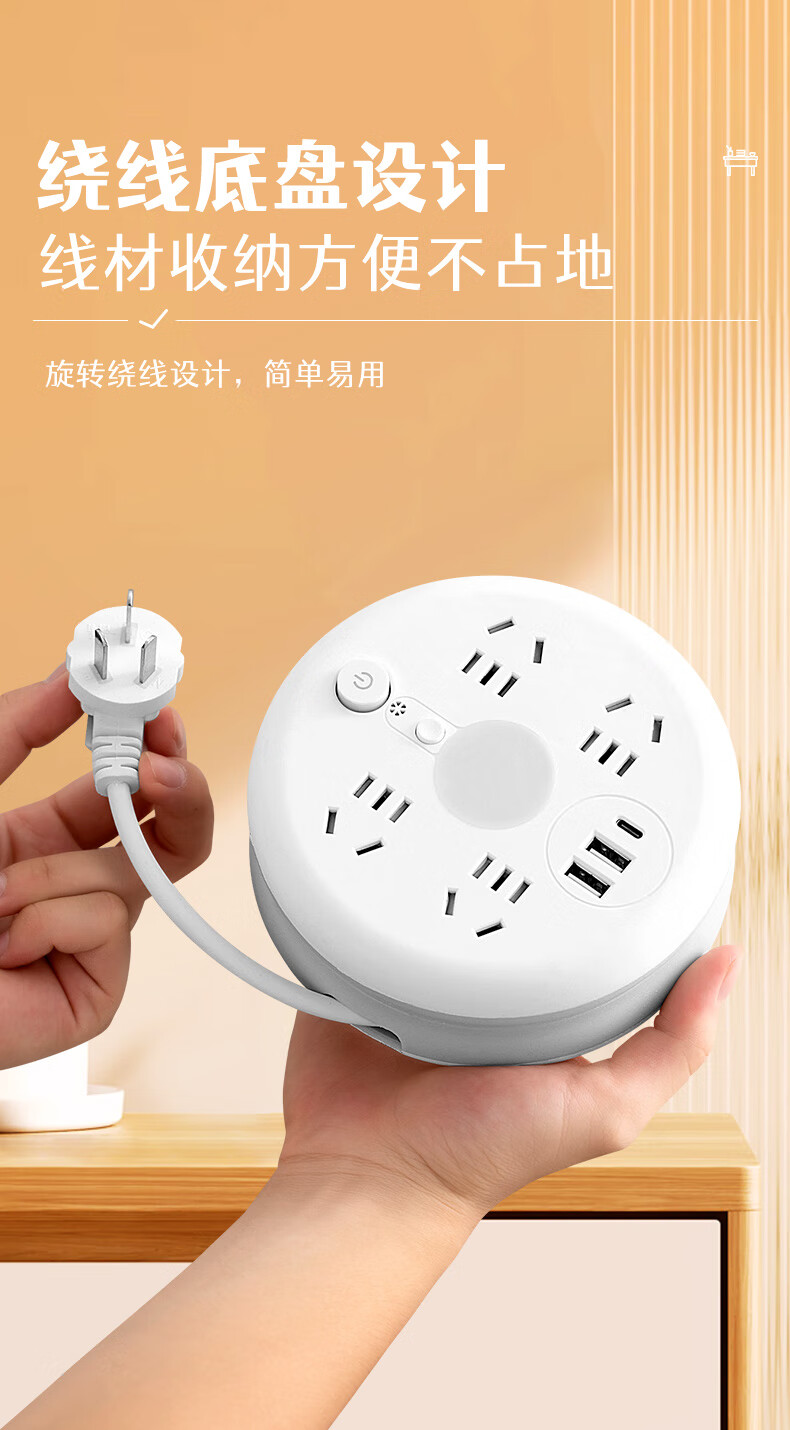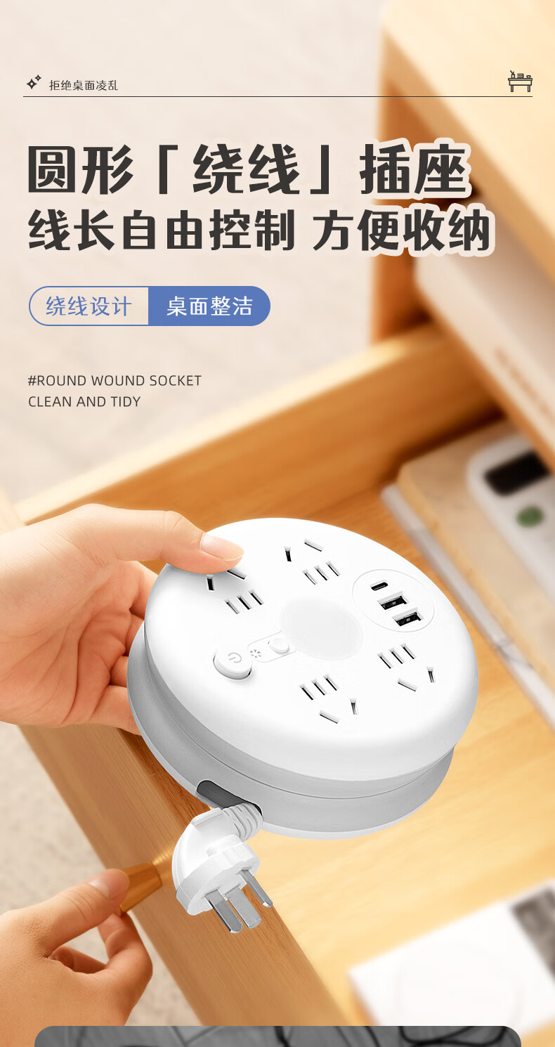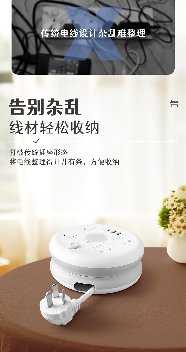 苏士赫尔摩多功能可收纳卷线隐藏2USB+Type-C插座可爬墙壁挂插线板/插排/插板/接线板/拖线板 总控4位3.9米