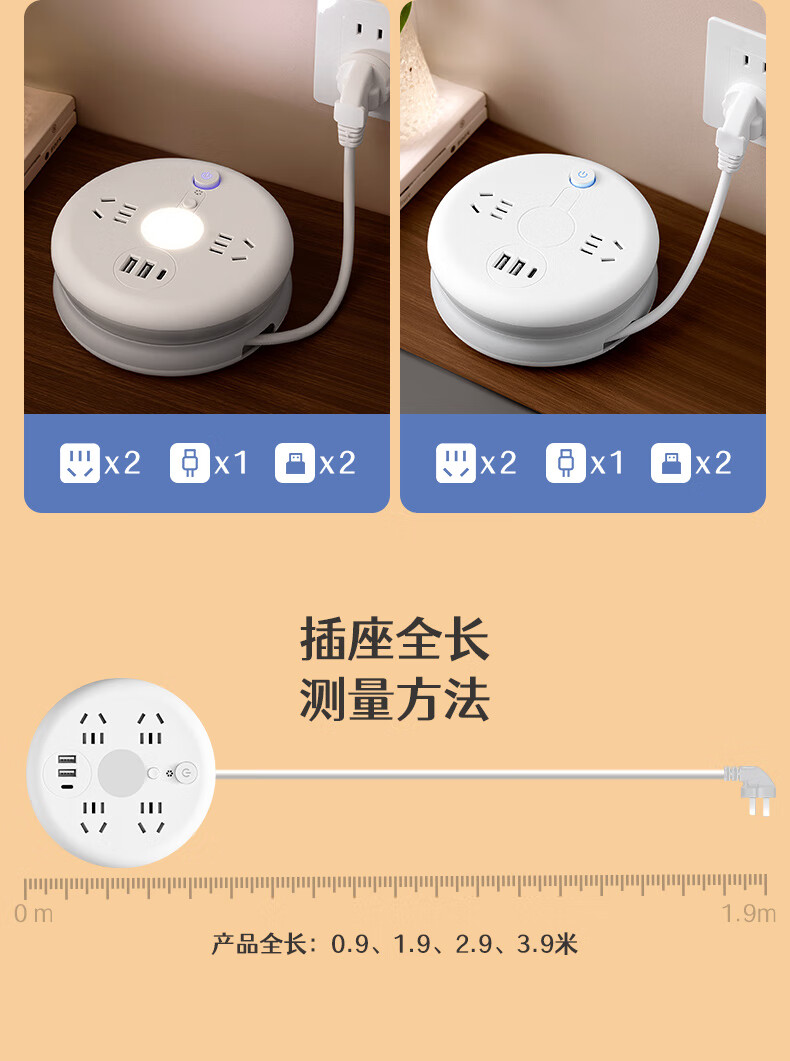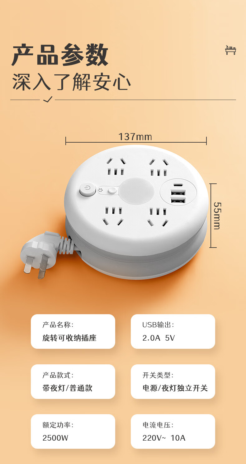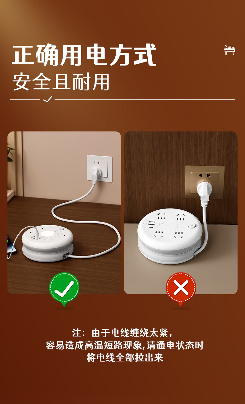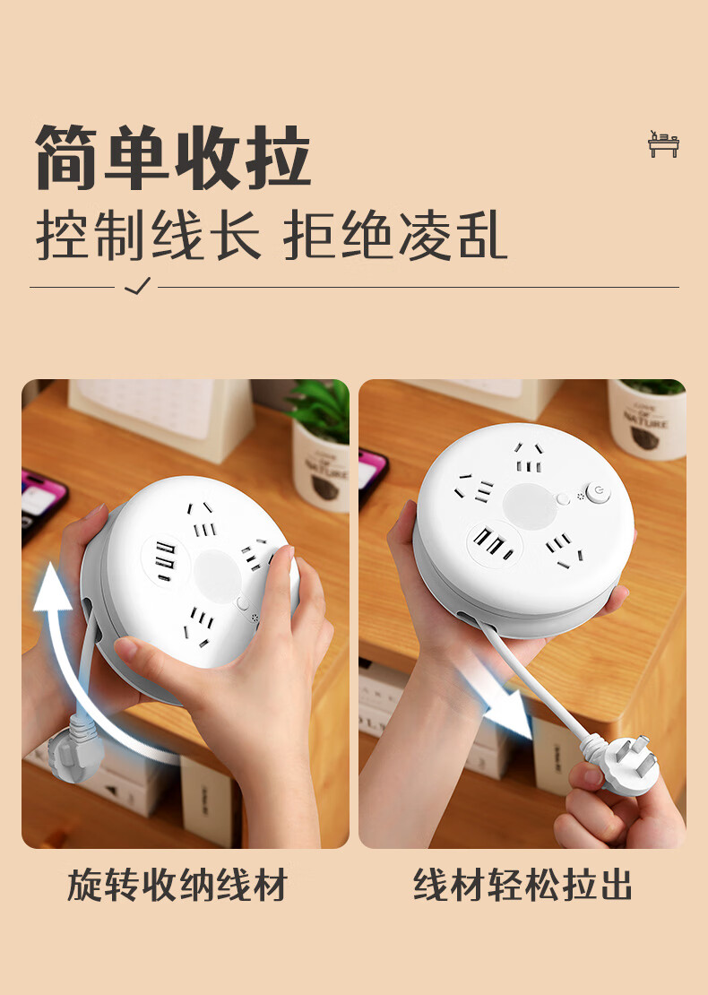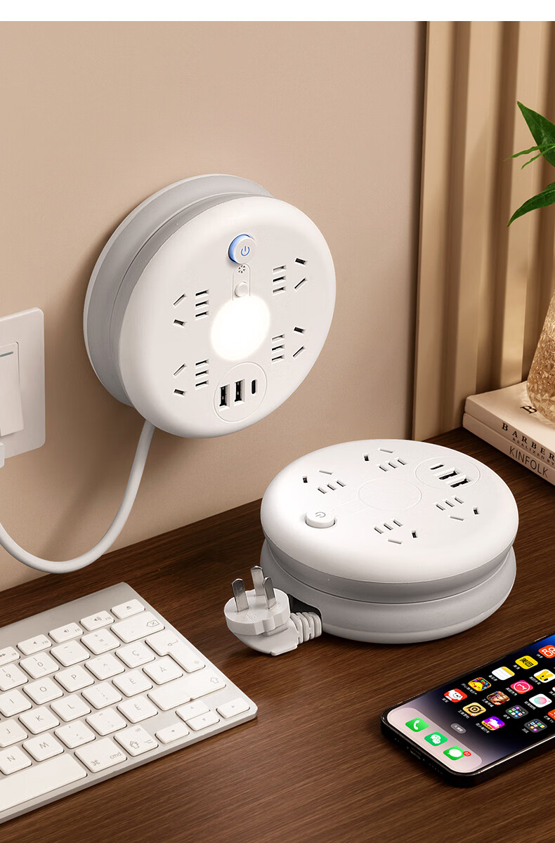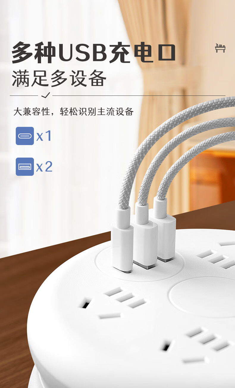 苏士赫尔摩多功能可收纳卷线隐藏2USB+Type-C插座可爬墙壁挂插线板/插排/插板/接线板/拖线板 总控4位3.9米