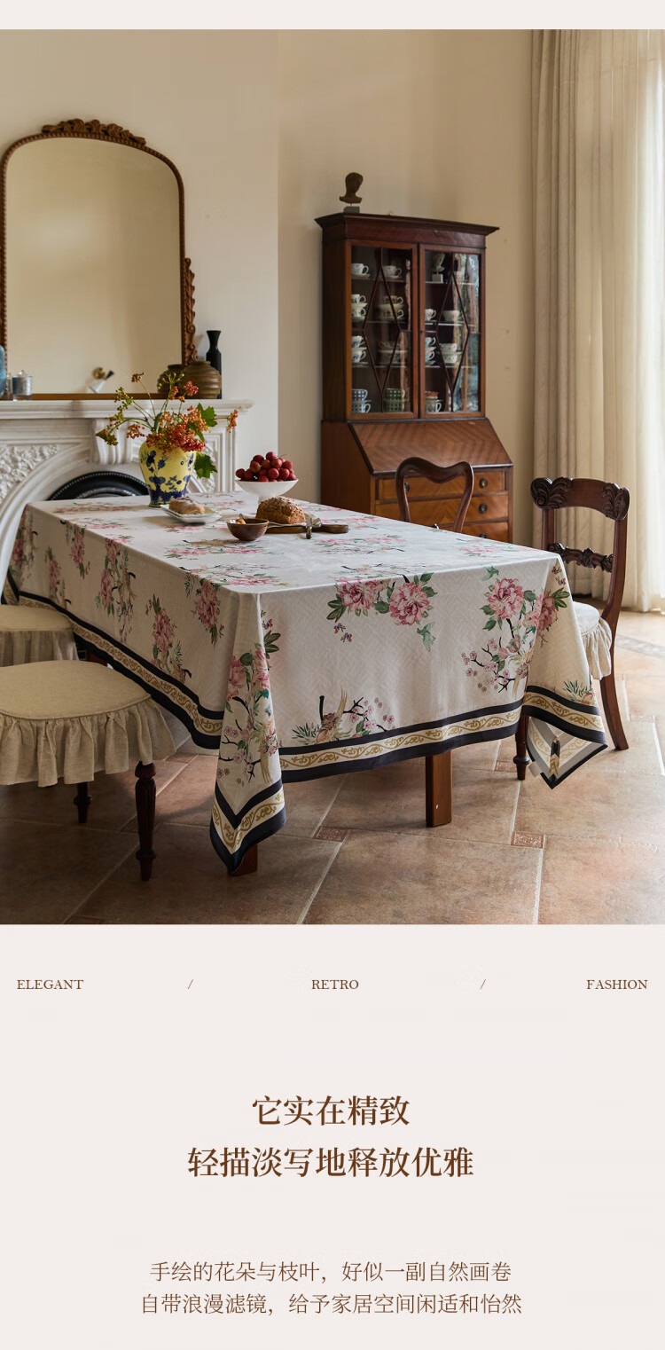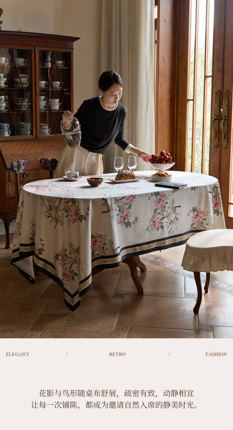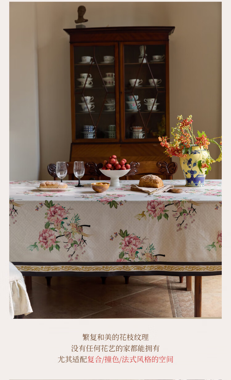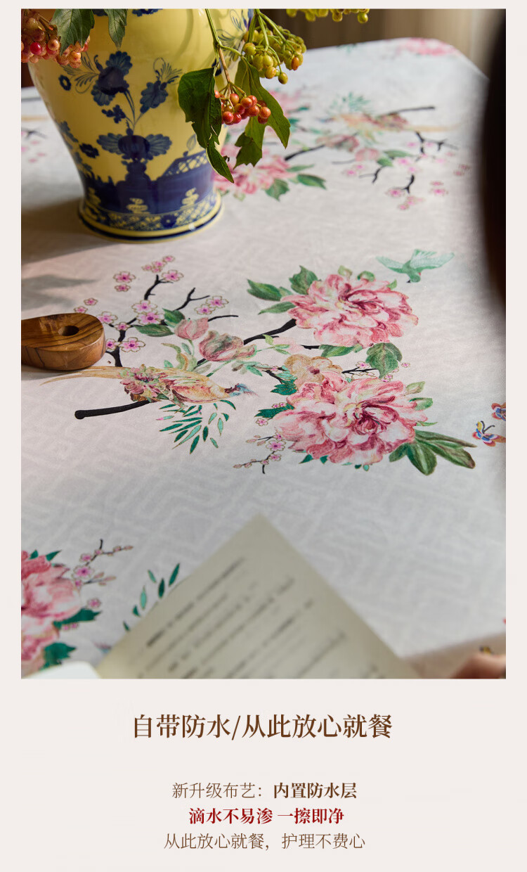 蜡笔派(Nabis)花间翎语桌布法式中国风氛围感餐桌盖布防水桌布茶几布 花间翎语-桌布 140*220cm单层卷边款/4-6人餐桌