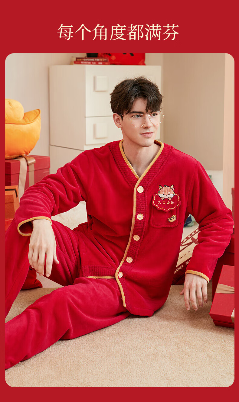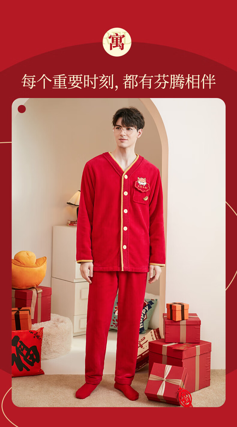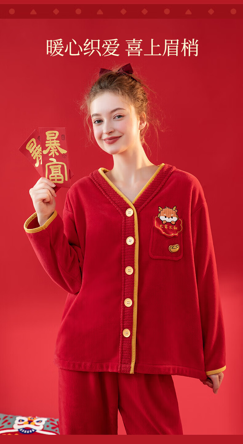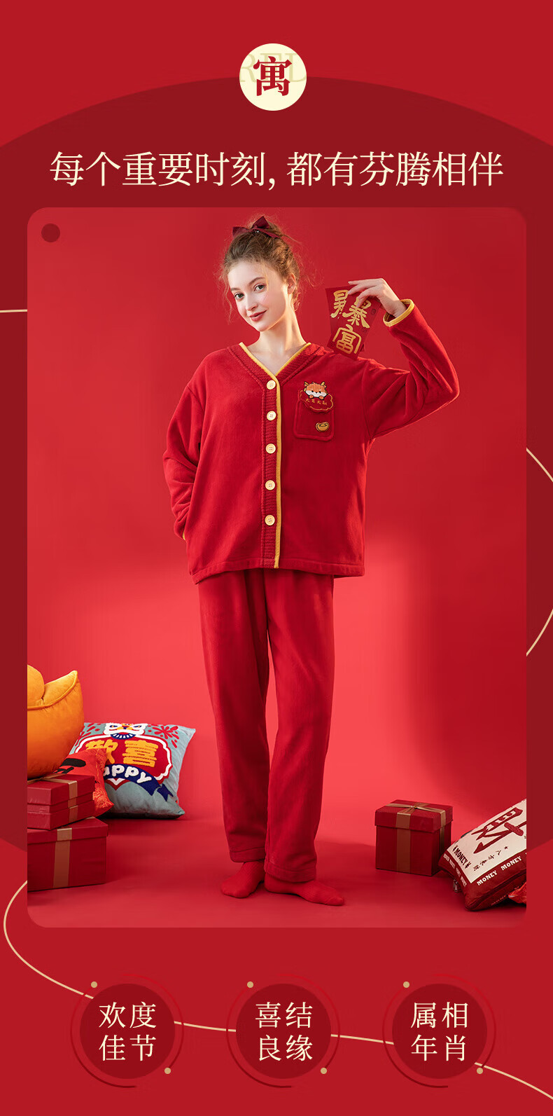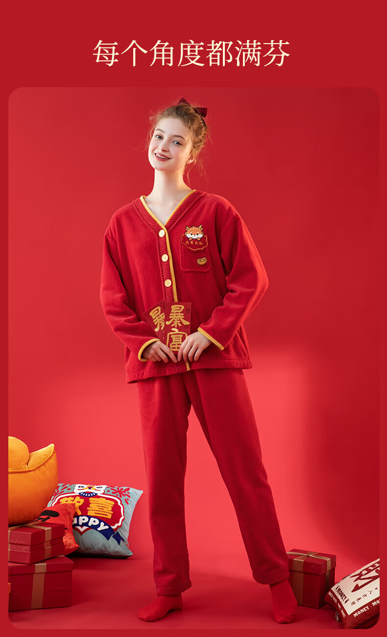 芬腾情侣睡衣【双面暖绒】秋冬本命年蛇年开衫加厚家居服套装 大红-女款 M