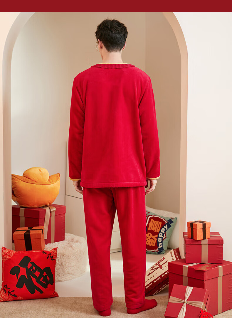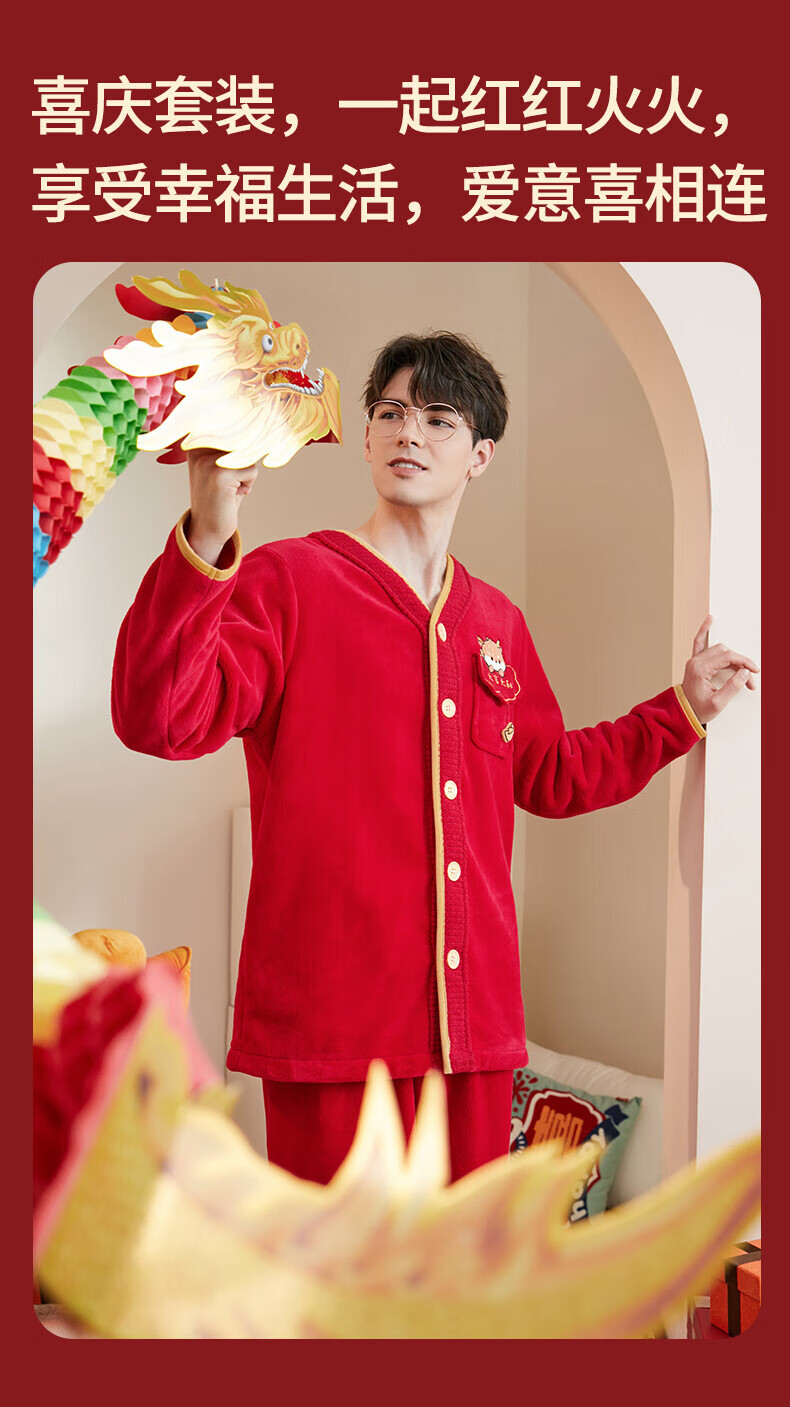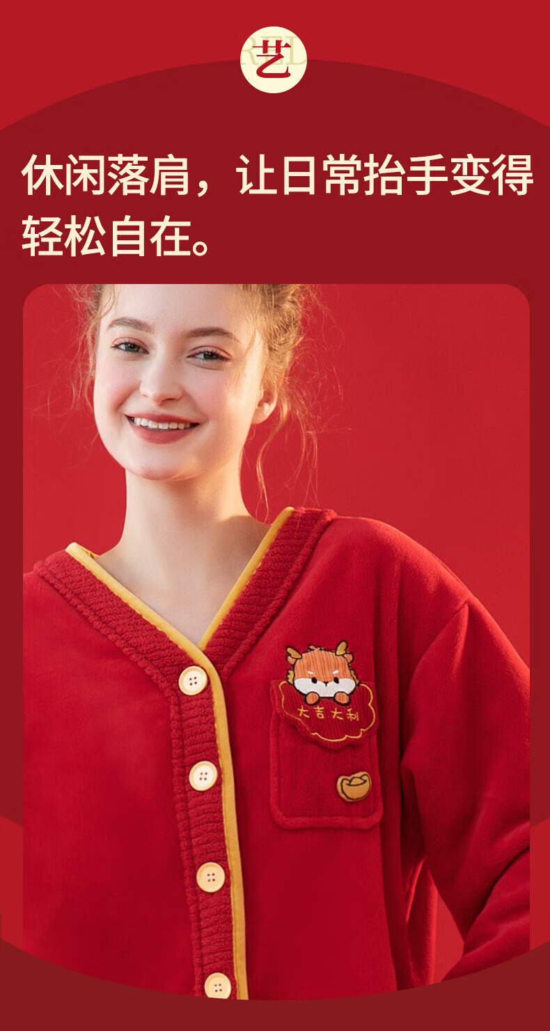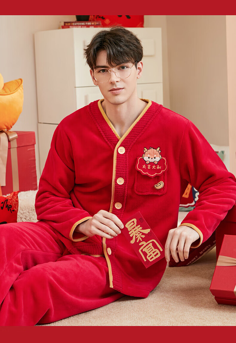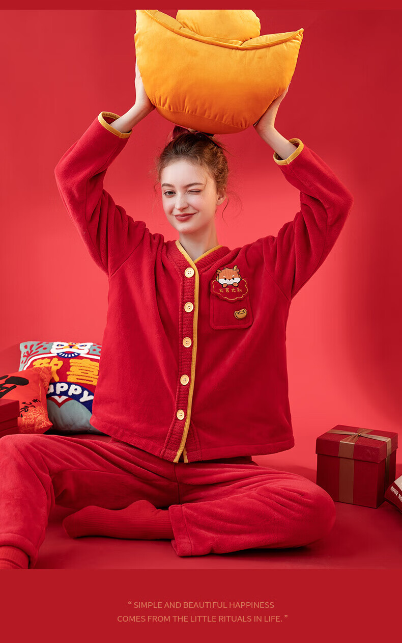 芬腾情侣睡衣【双面暖绒】秋冬本命年蛇年开衫加厚家居服套装 大红-女款 M