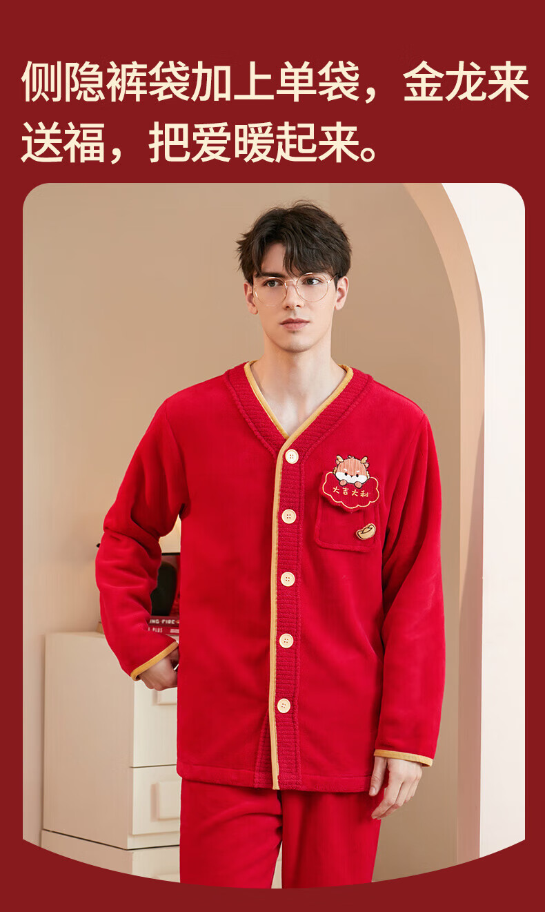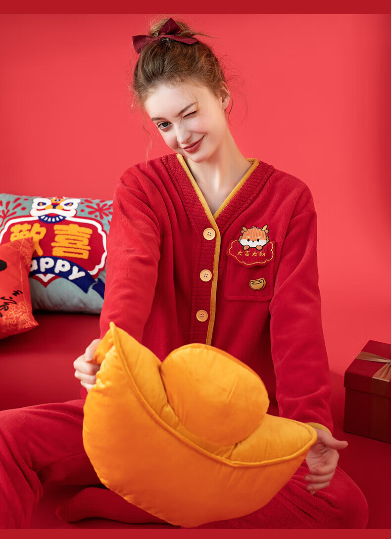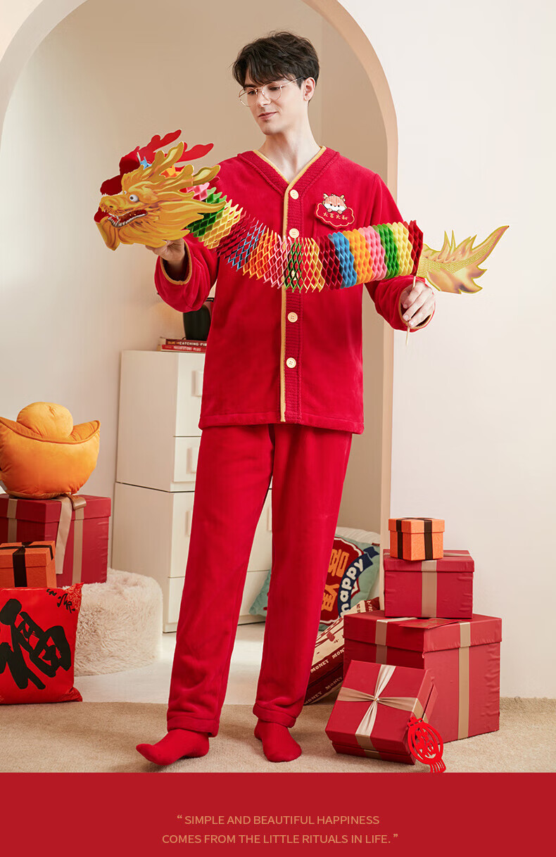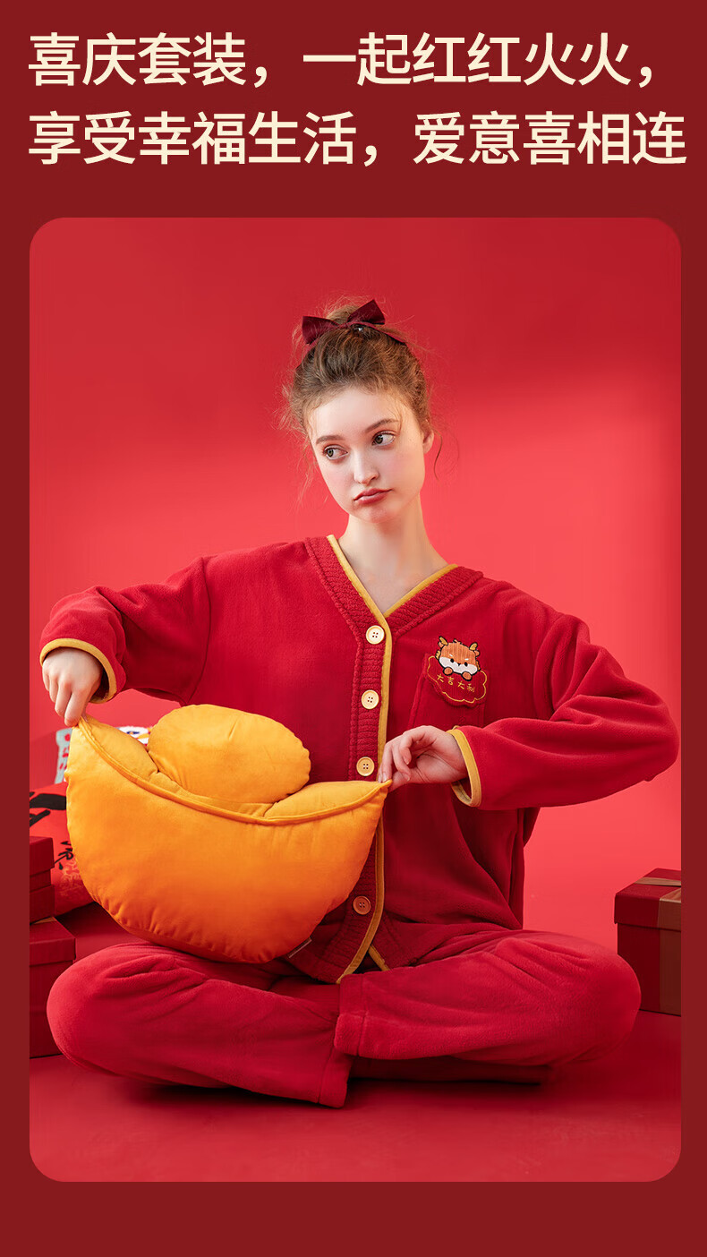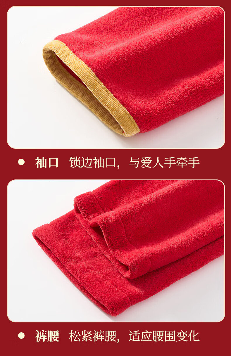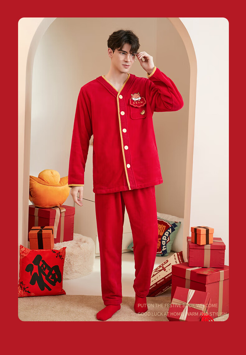 芬腾情侣睡衣【双面暖绒】秋冬本命年蛇年开衫加厚家居服套装 大红-女款 M