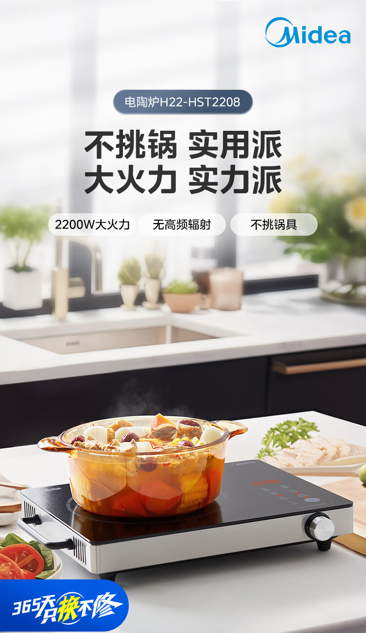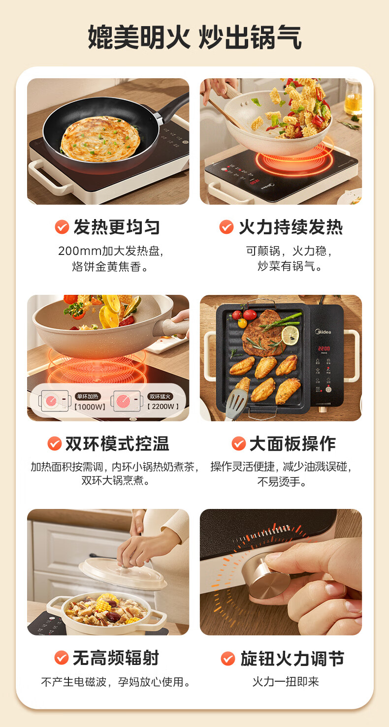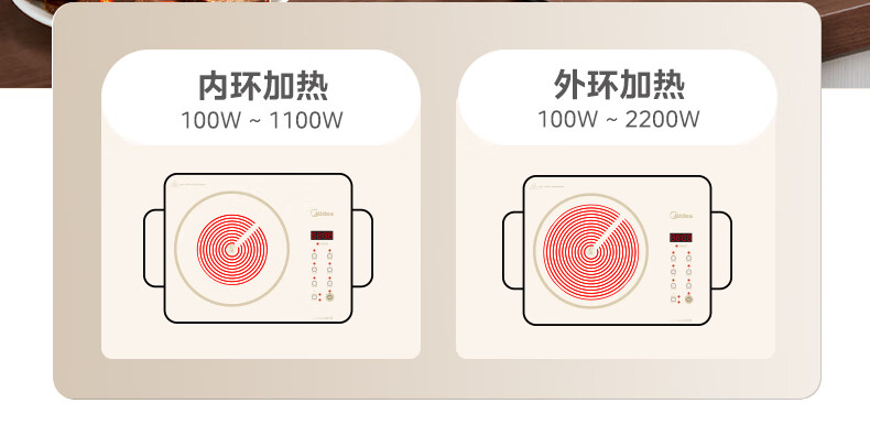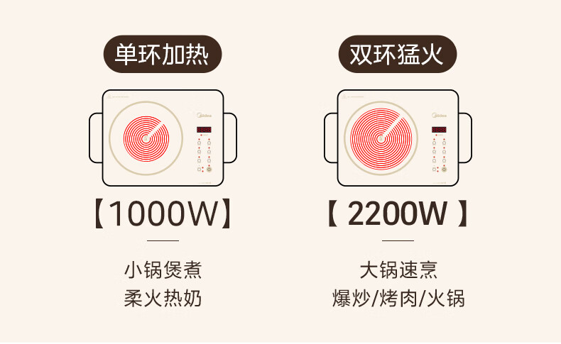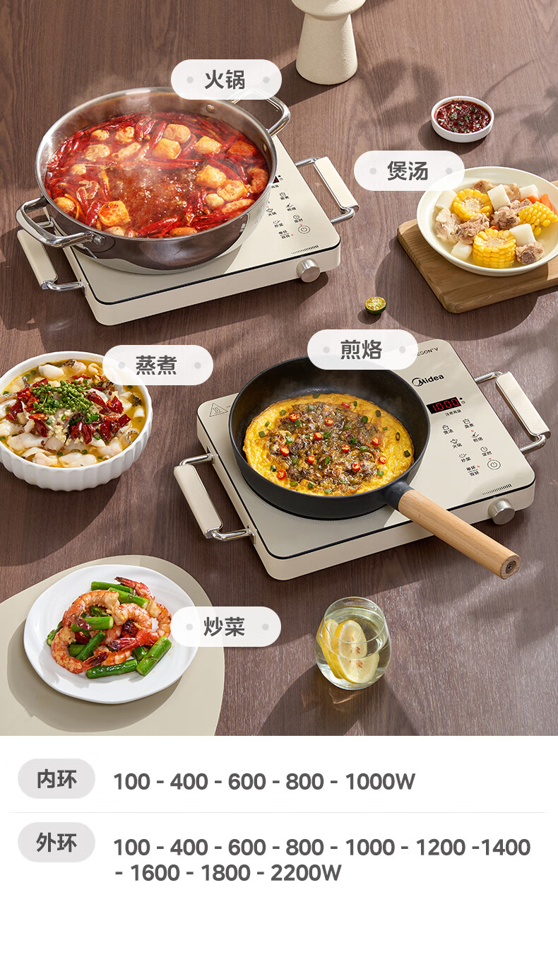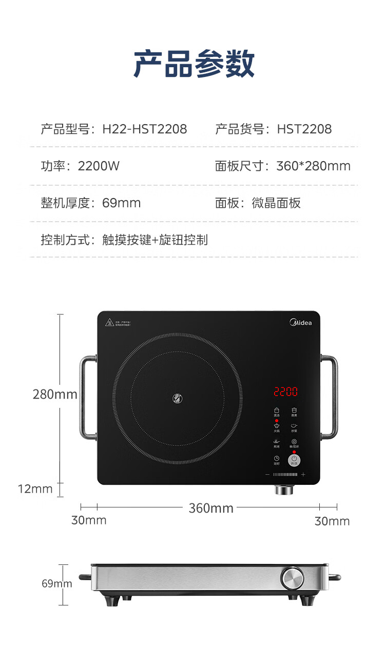 美的(Midea)电陶炉 电磁炉 家用小型煮茶火锅旋控2200W大功率电磁灶内外双环控火 智能定时自由调节火力 【不挑锅具】HW2210