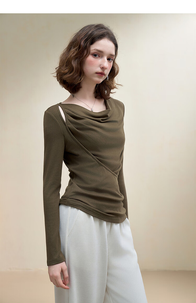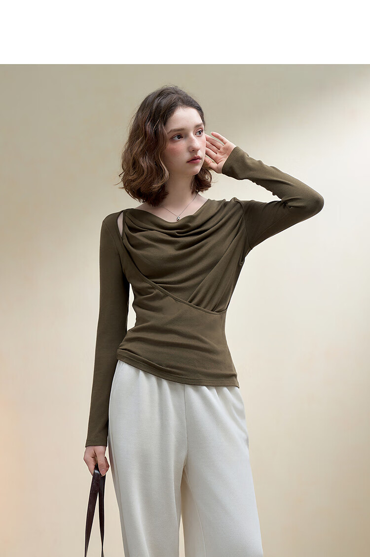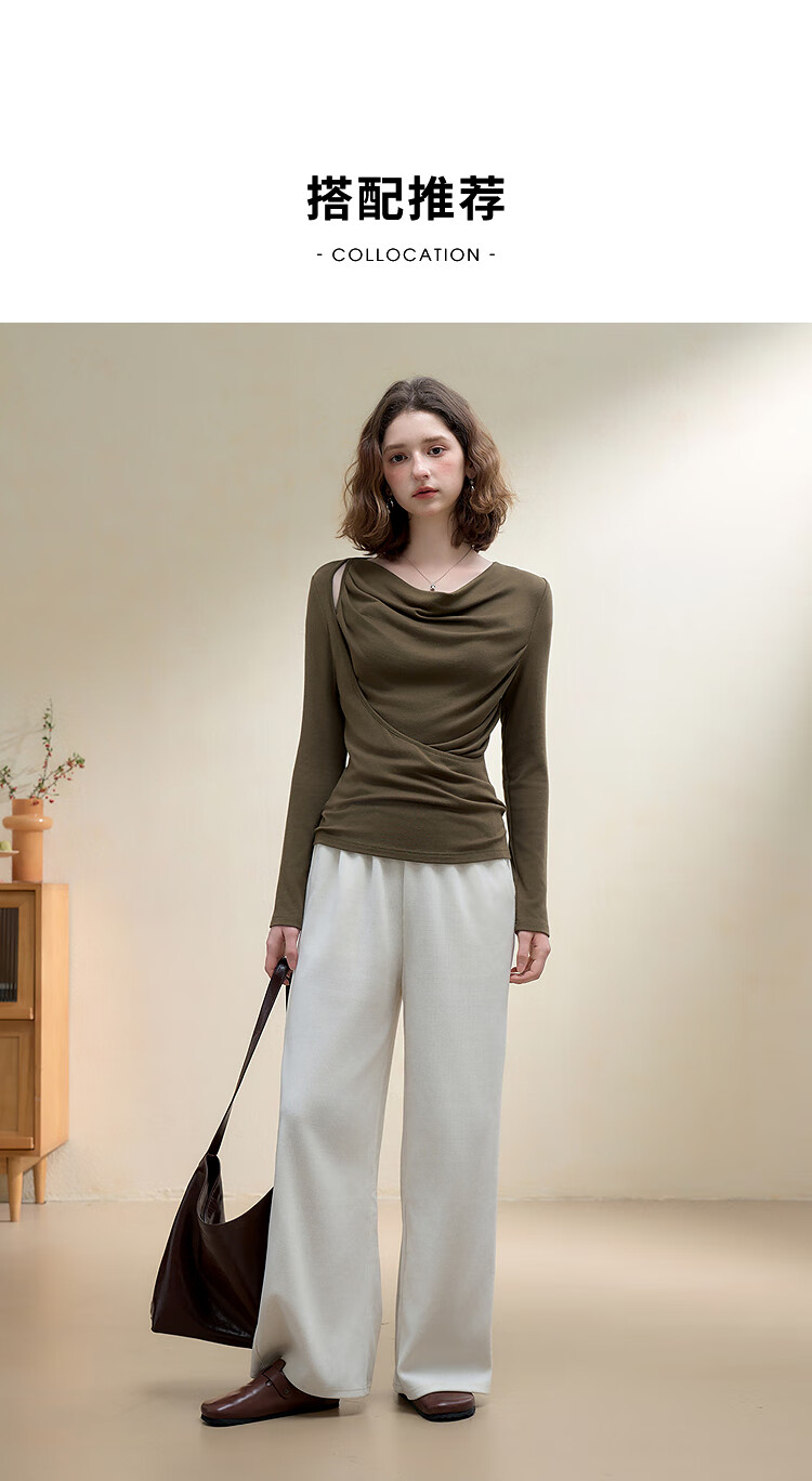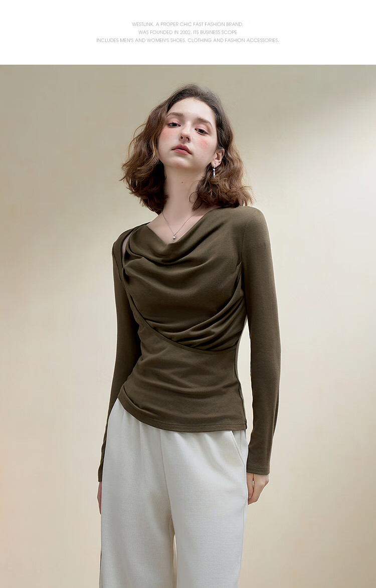 西遇气质荡领抽褶设计长袖针织T恤女2025秋季高级感修身显瘦上衣 绿色 (预售9月9日) L