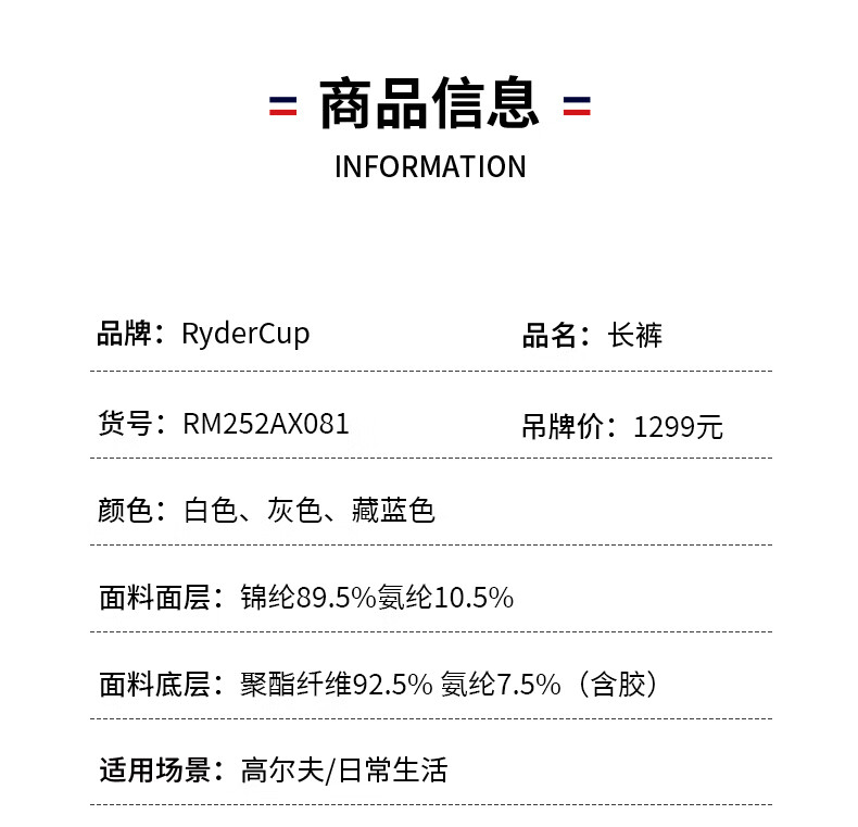 RYDER CUP莱德杯高尔夫服装男装长裤25秋冬加厚保暖御寒锁温弹力高尔夫裤子 藏蓝色 S