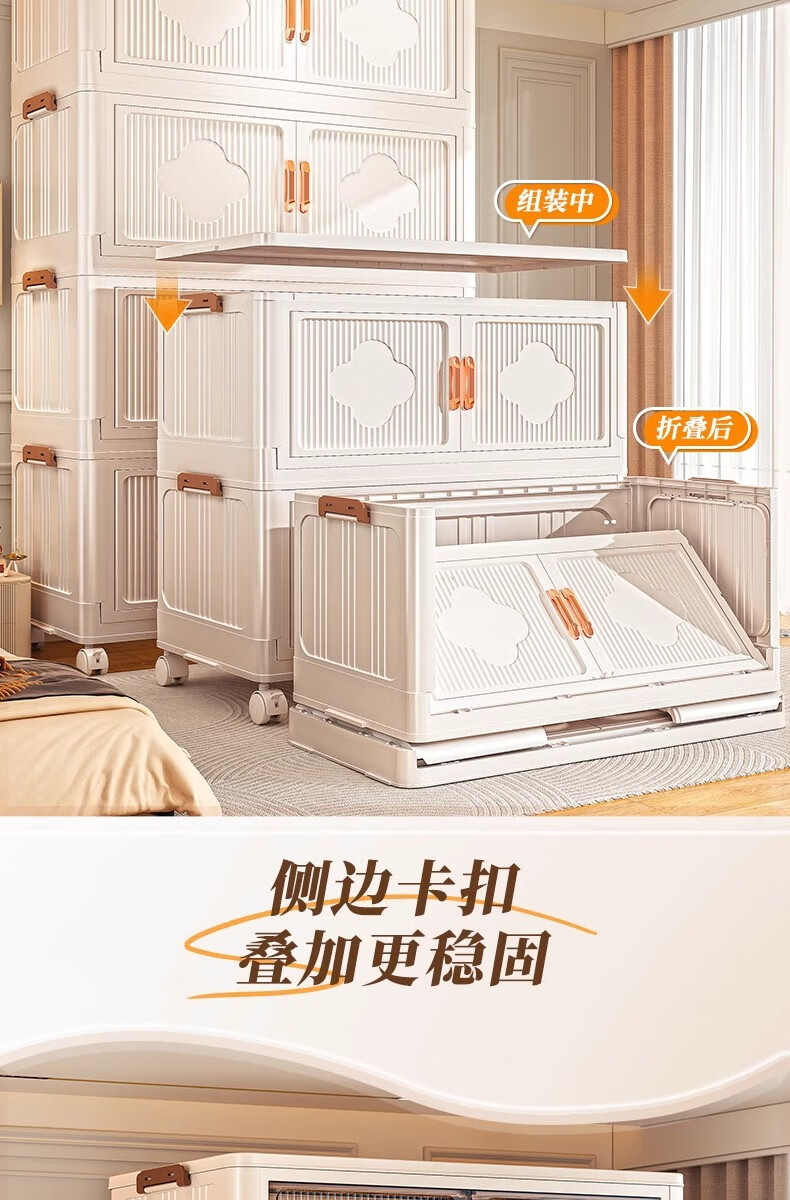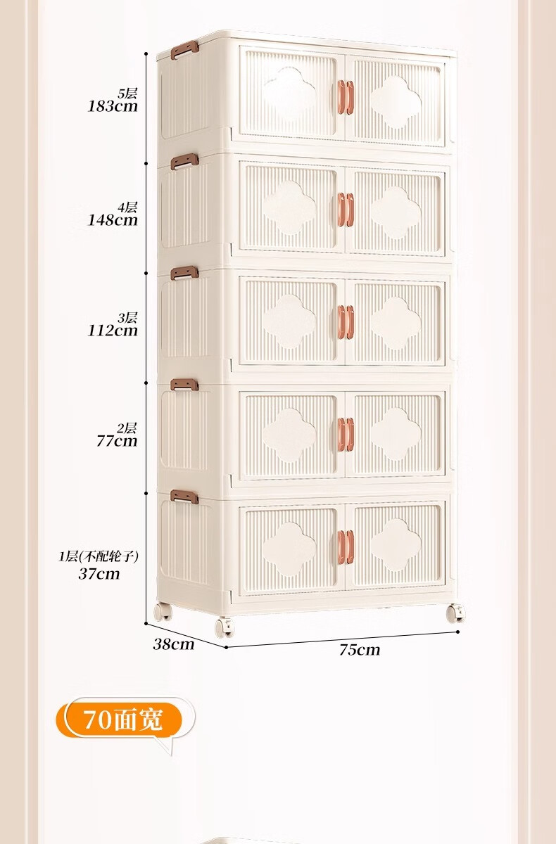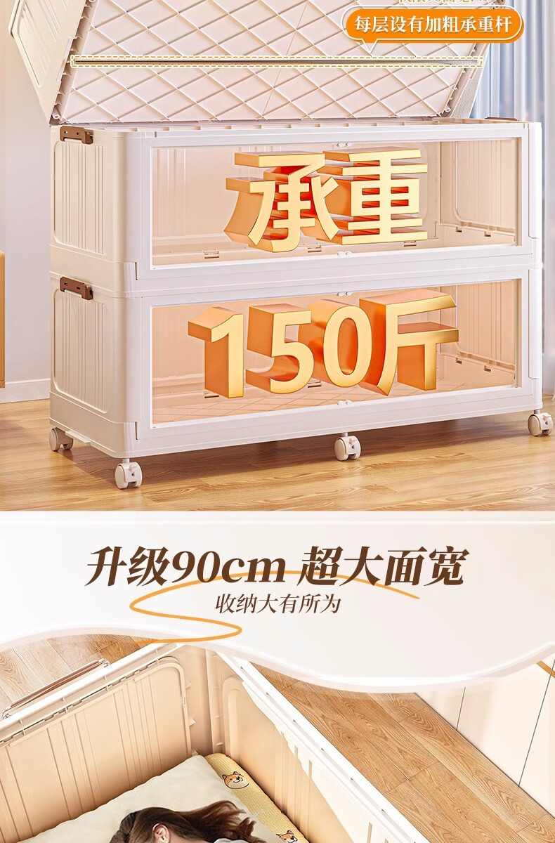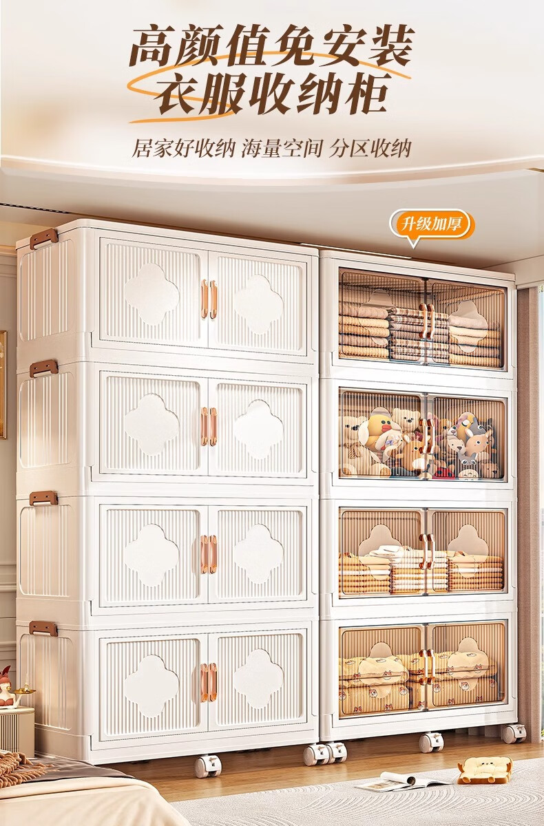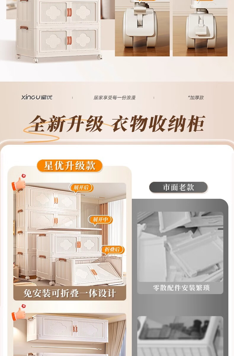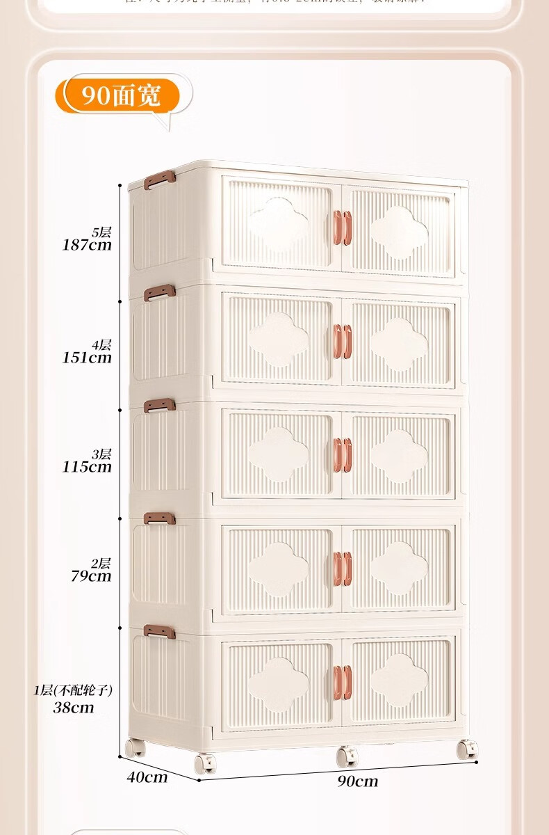 星优收纳柜子多层储物家用宝宝衣服杂物零食免安装可折叠大塑料置物柜 90cm面宽三层奶油白+6滑轮 多层