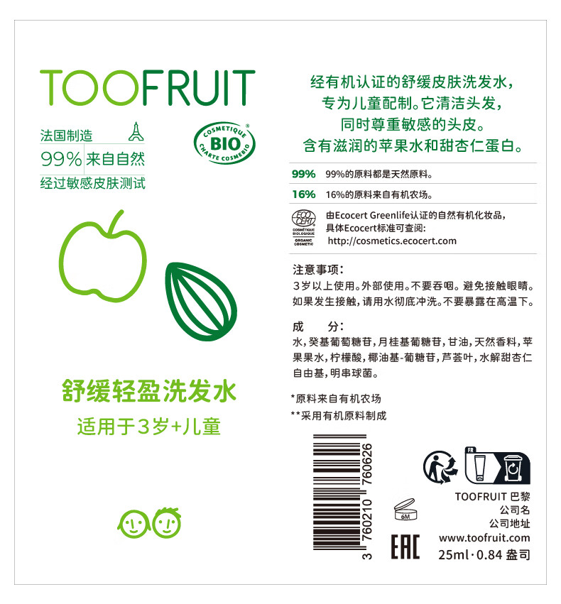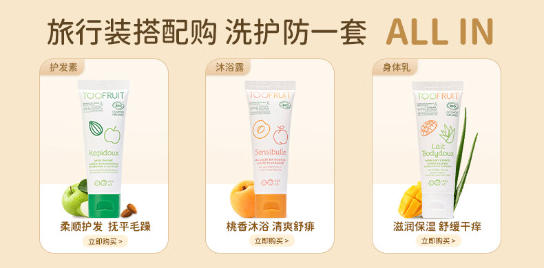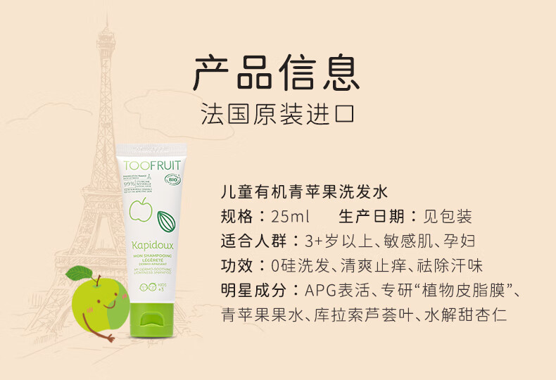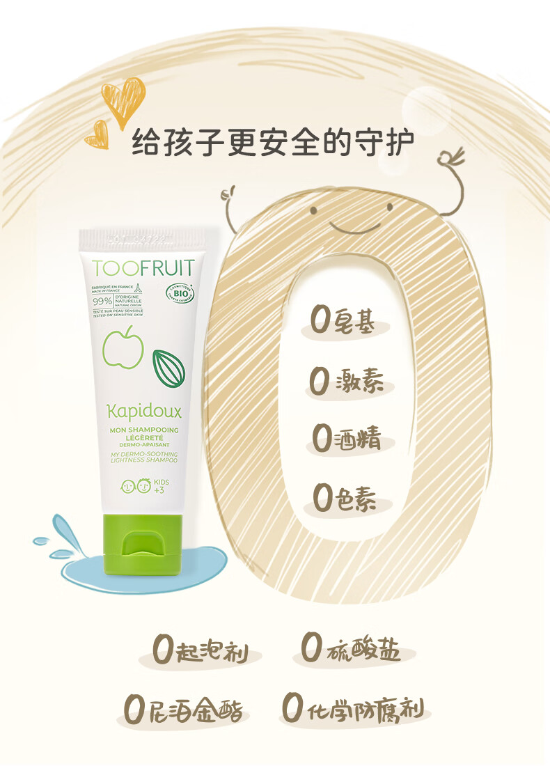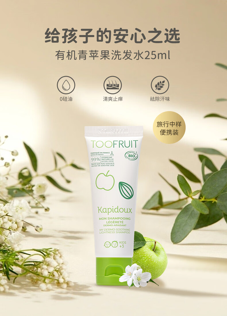 TOOFRUIT多果肤 儿童洗发水 3-6-12岁 预防头屑止痒 有机旅行装中样25ml