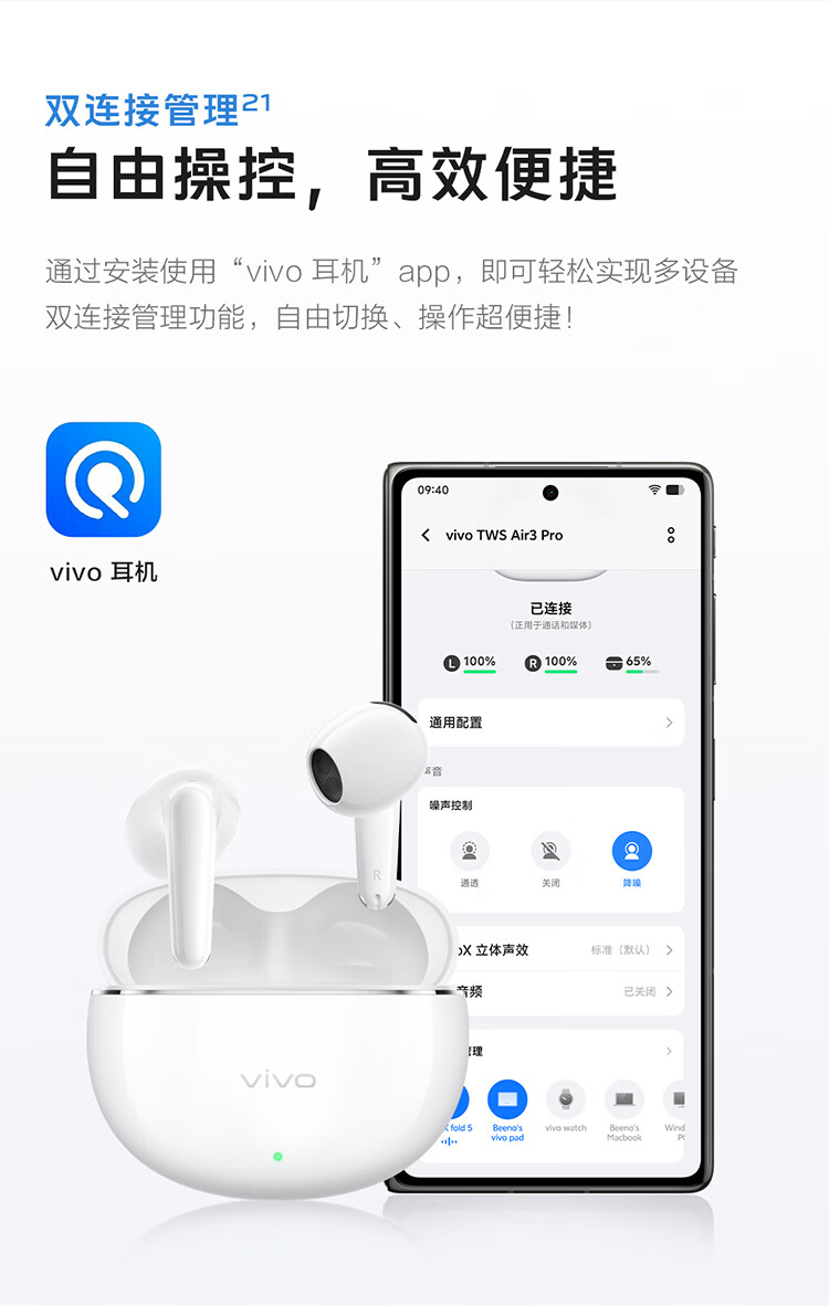 vivoTWS Air3 Pro元气白 50dB多模式降噪 安卓苹果跨生态兼容 适配苹果华为小米 蓝牙耳机