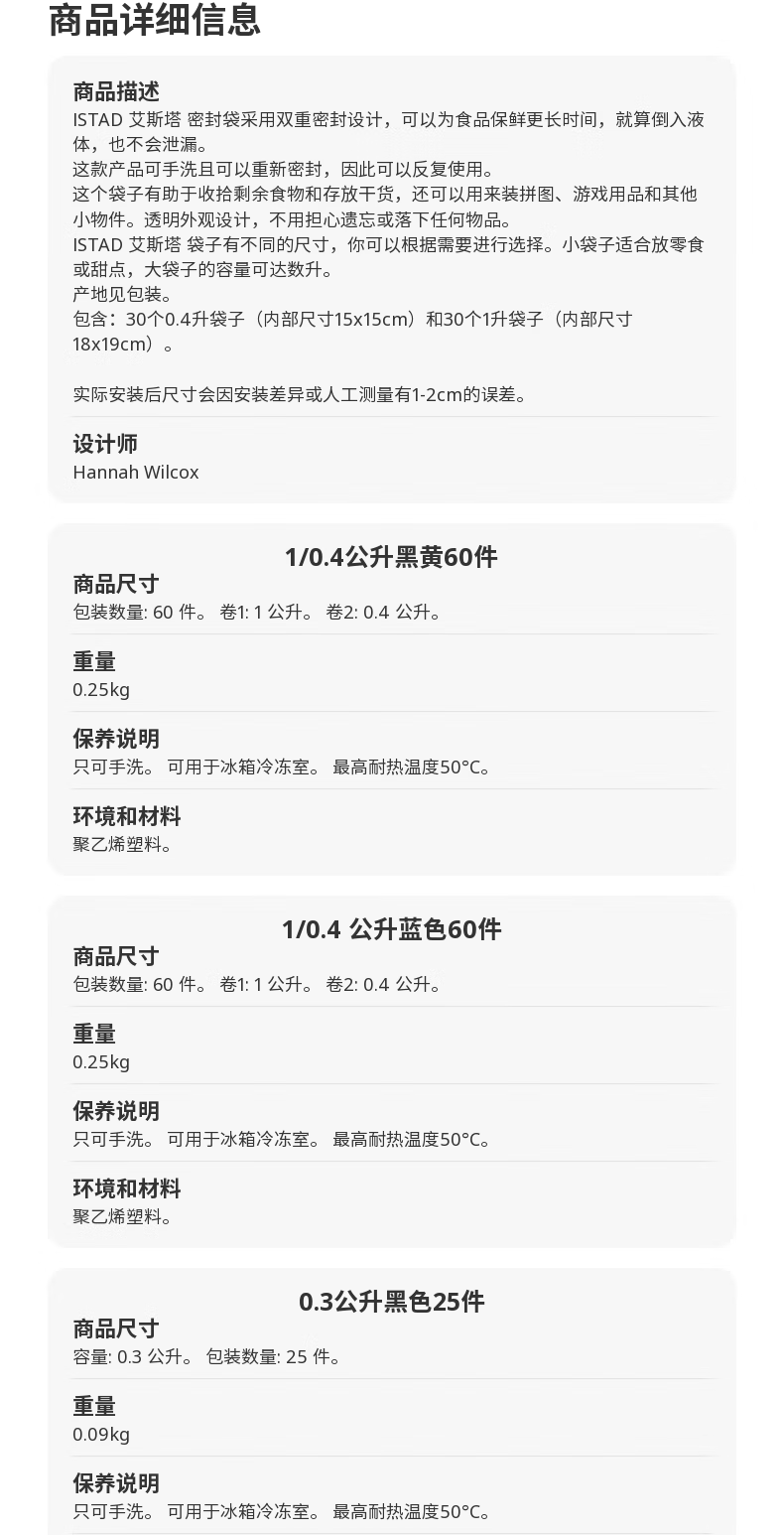 宜家(IKEA)顺手买一件ISTAD 艾斯塔 密封袋 1/0.4 公升蓝色60件