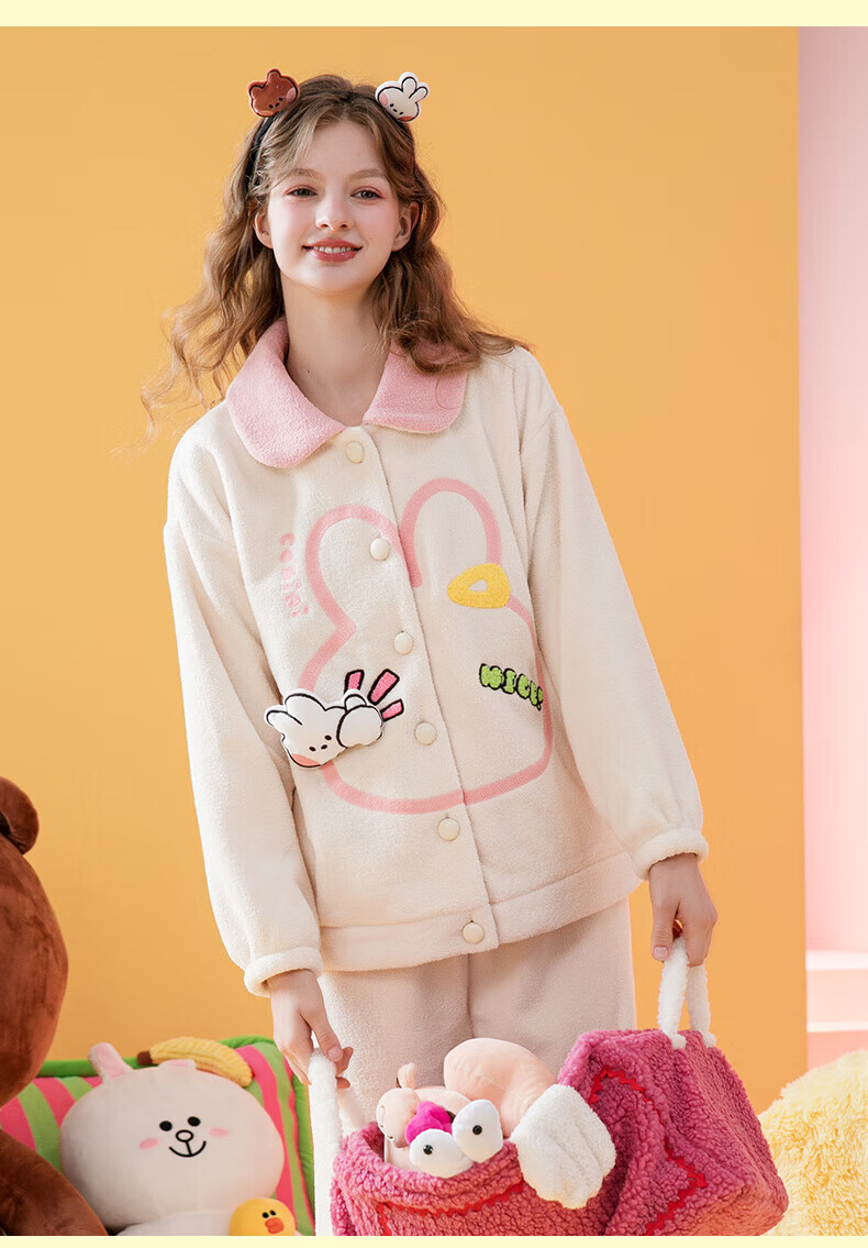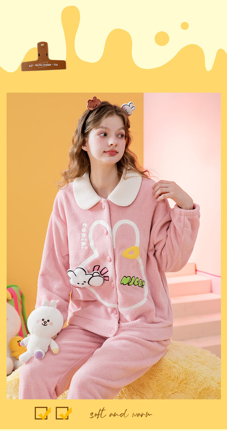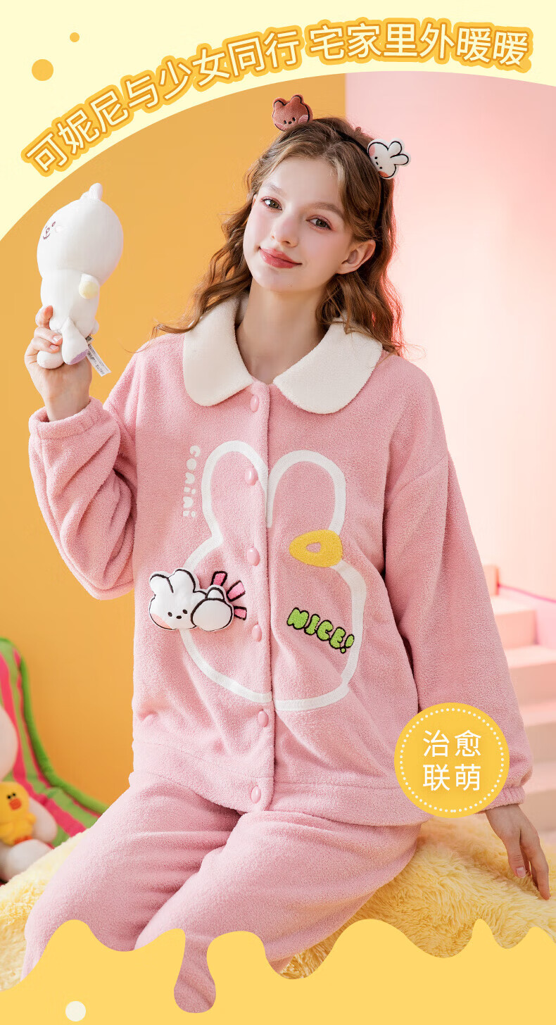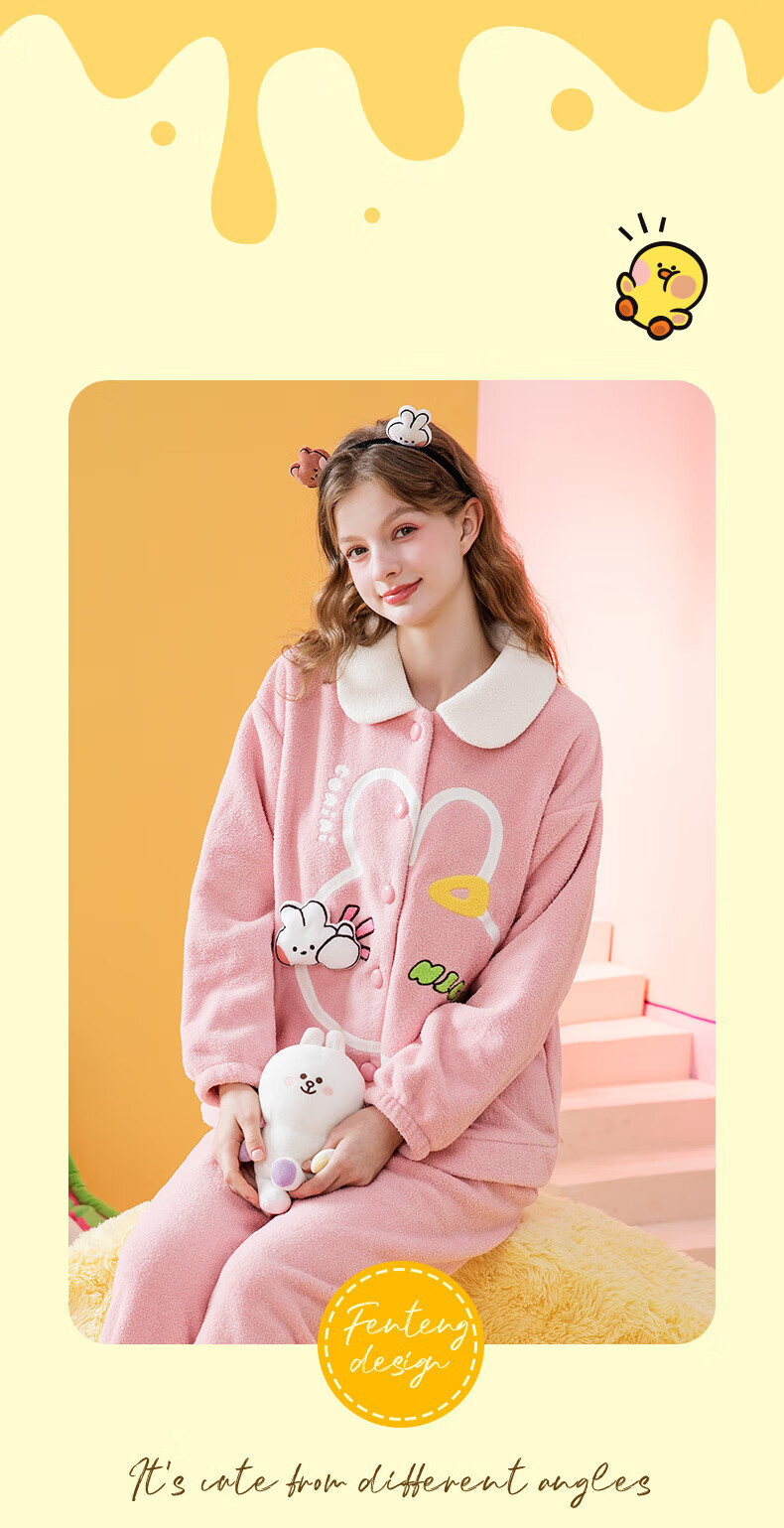 芬腾睡衣女士【可妮兔IP联名】秋冬双面绒翻领开衫加厚家居服套装 暖粉 M
