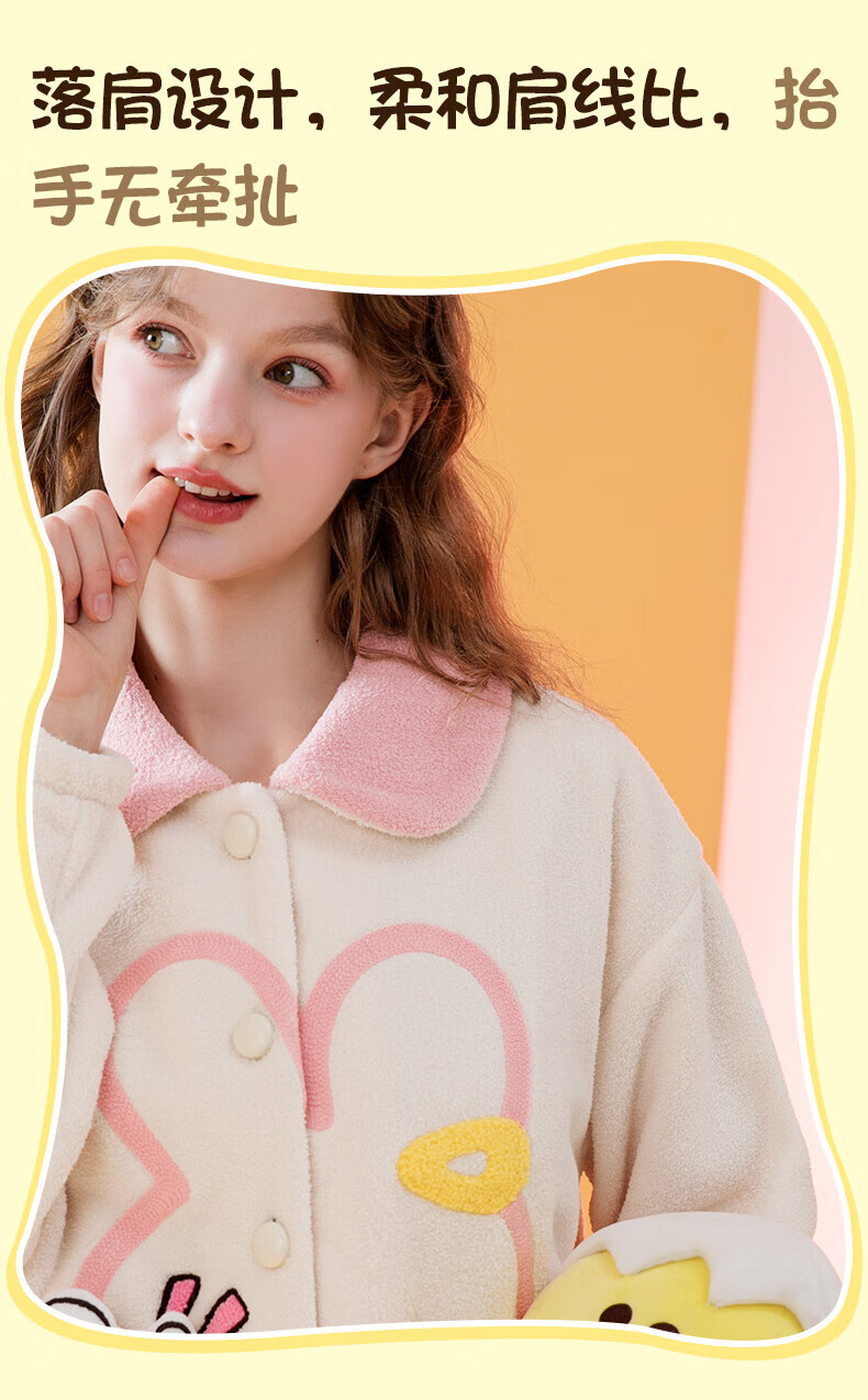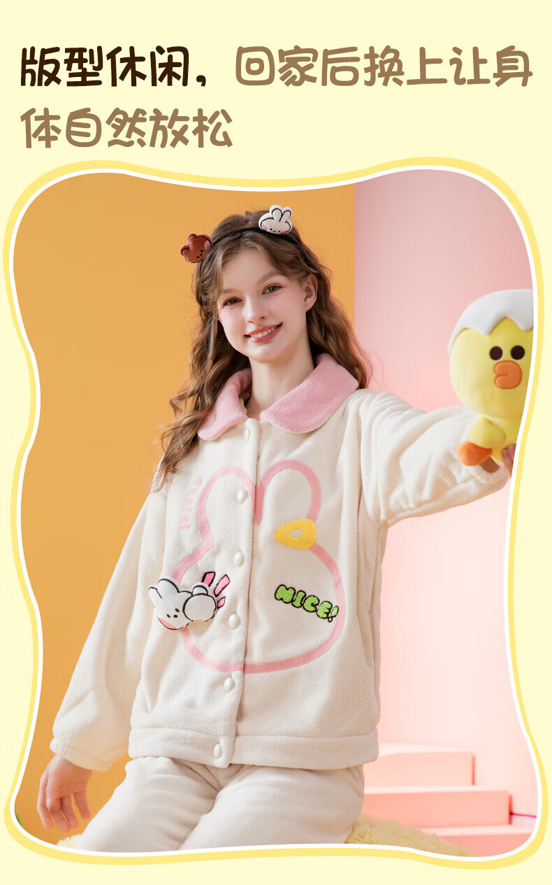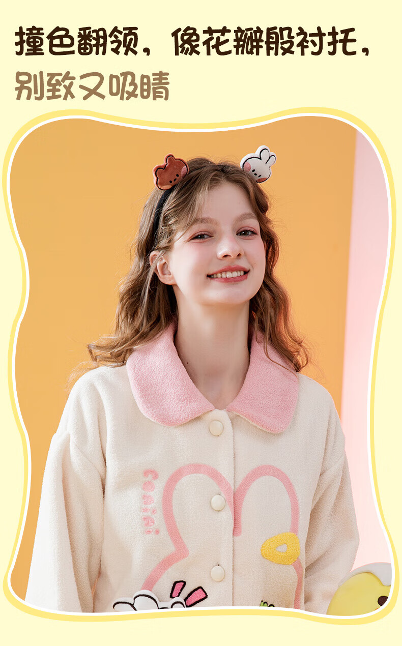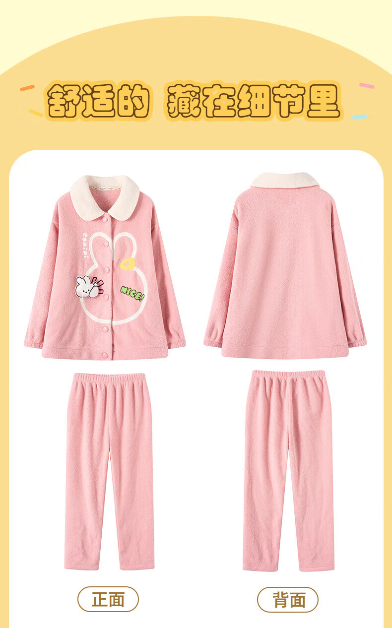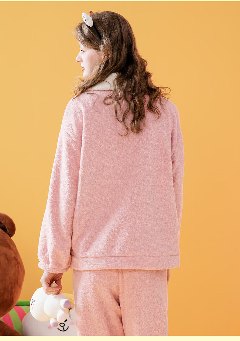 芬腾睡衣女士【可妮兔IP联名】秋冬双面绒翻领开衫加厚家居服套装 暖粉 M