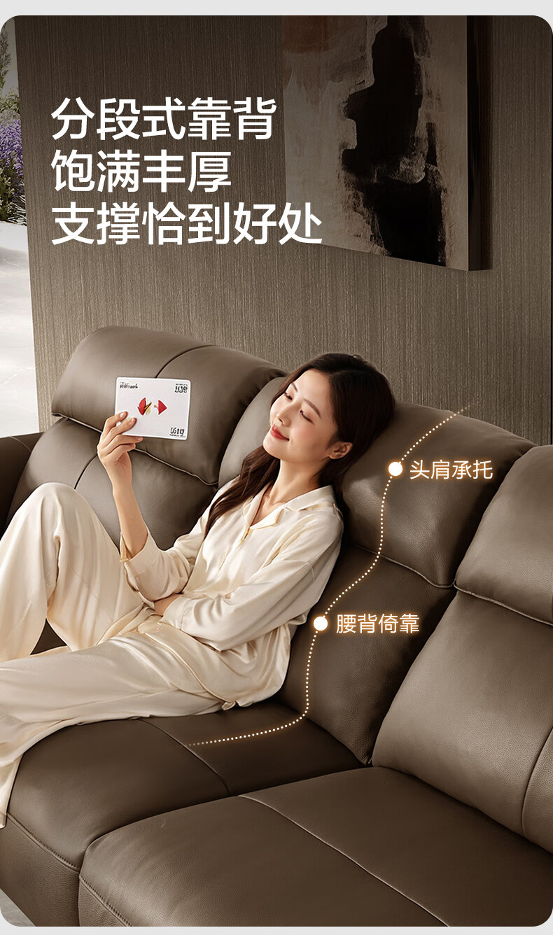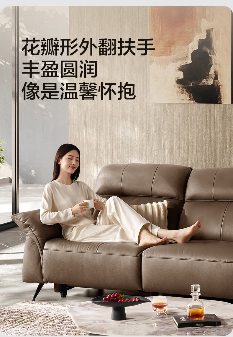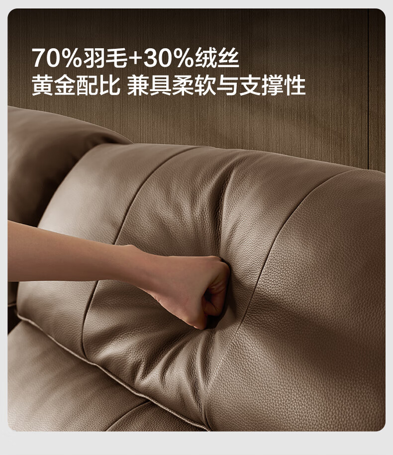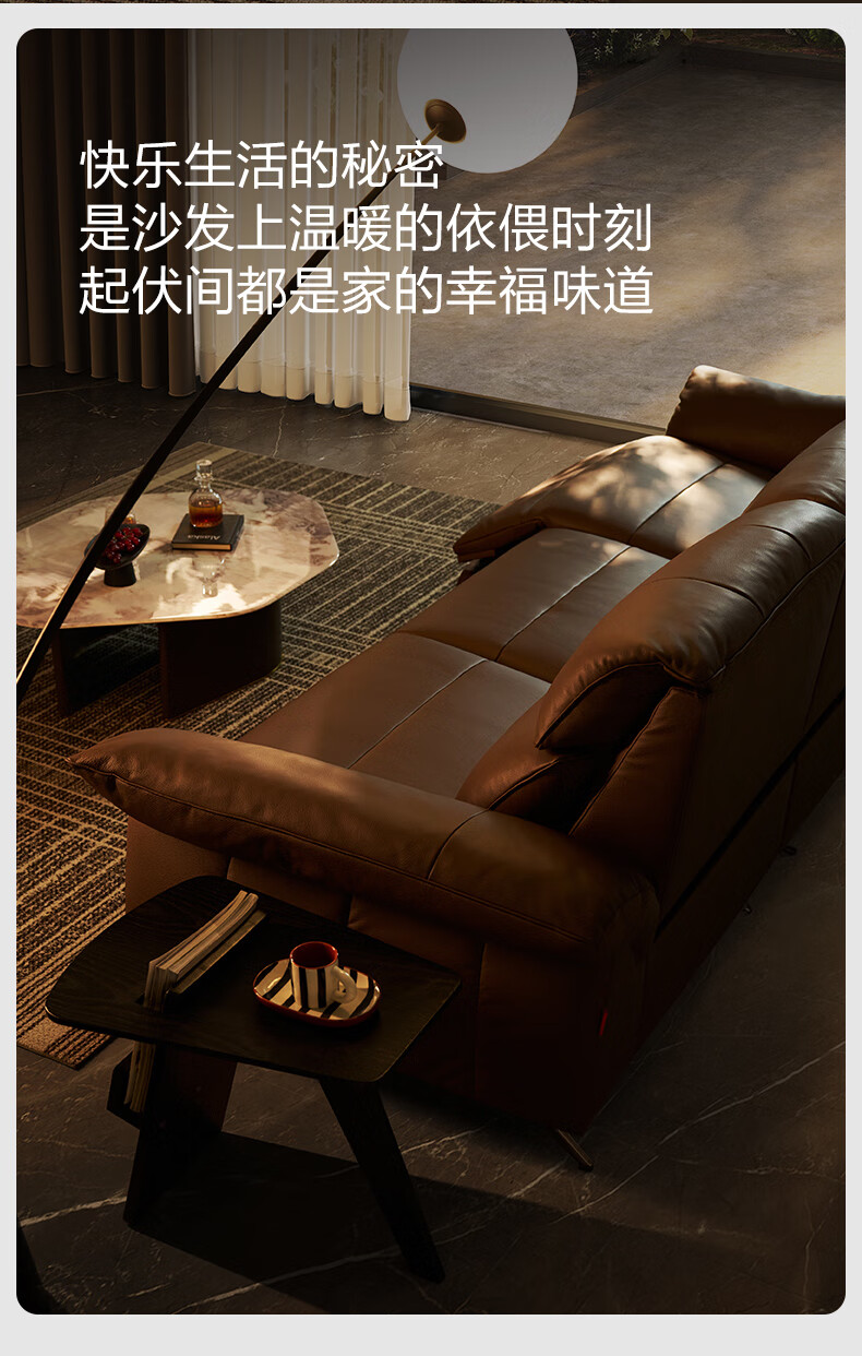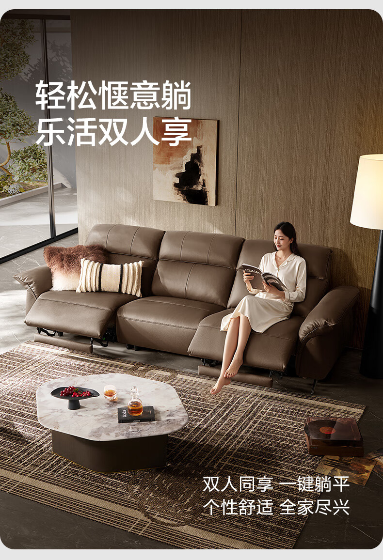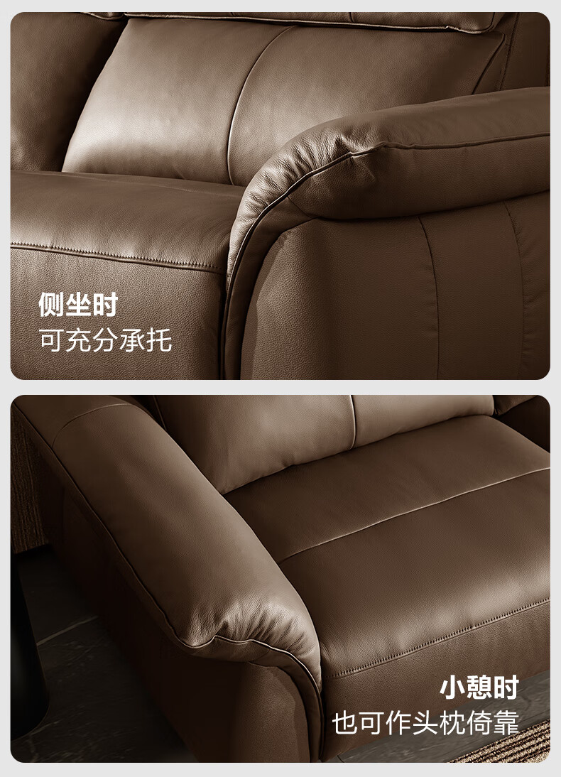 顾家家居(KUKA)【半青皮】极简风加厚牛皮乐活沙发70%羽毛6327咖双电动2.93m
