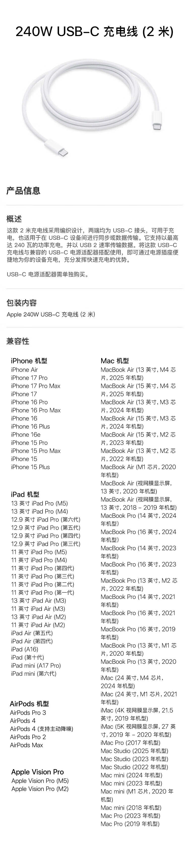 Apple/苹果 240W USB-C数据线-2米 type-c苹果充电线数据传输 苹果17充电线iphone17充电线