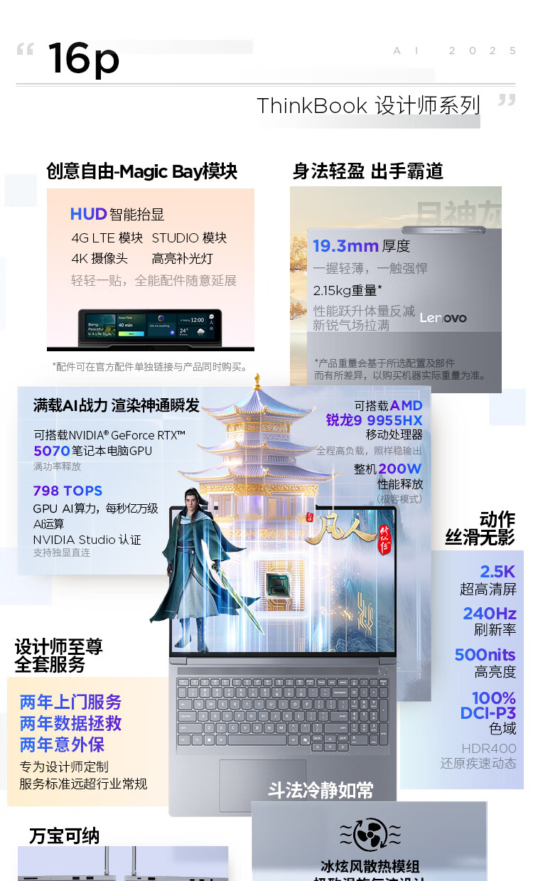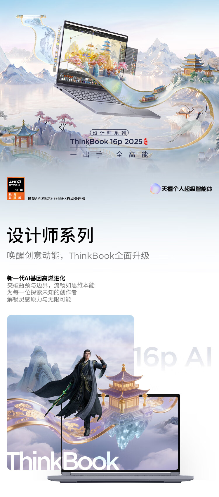 ThinkPad联想设计师系列ThinkBook16p 2025 AI创作笔记本电脑 锐龙R9-9955HX RTX5070 2.5K 240Hz 32G 1T